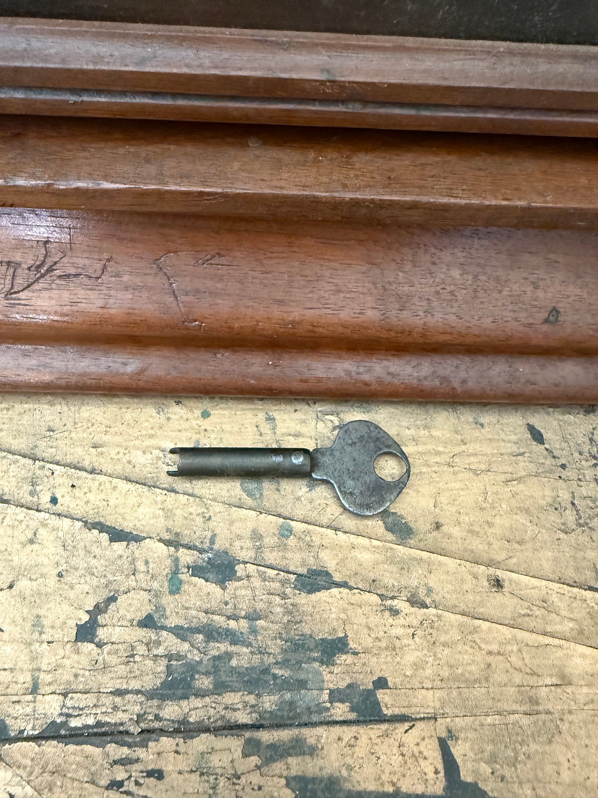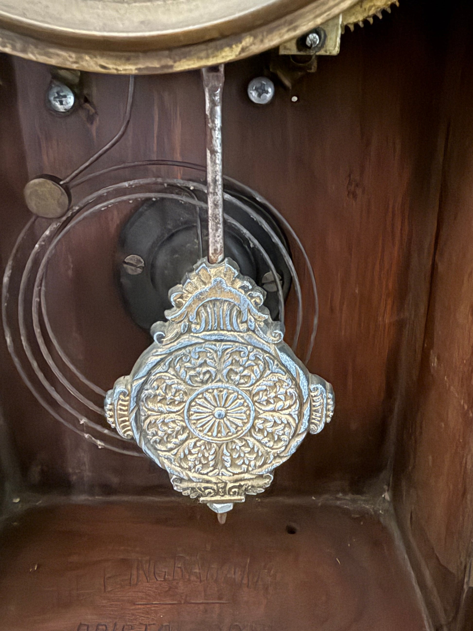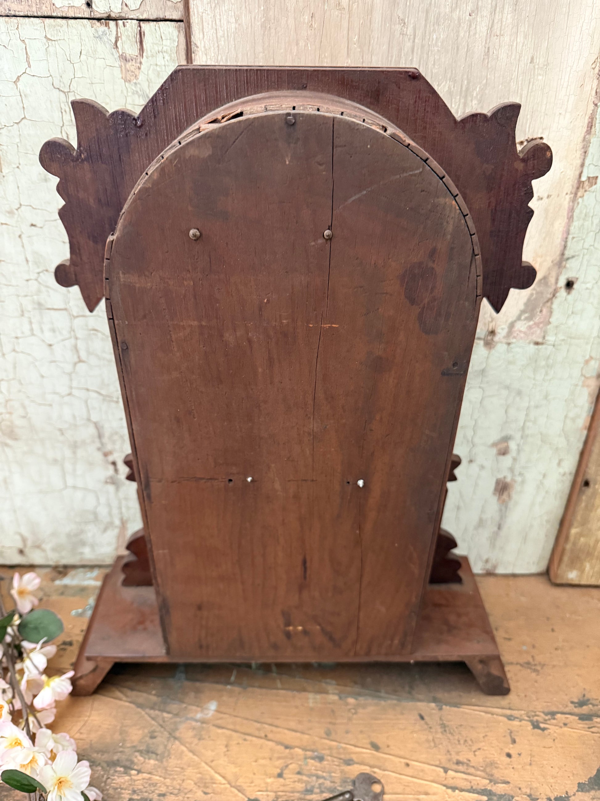 Antique E. Ingraham & Co. Shelf Clock, circa 1881. Solid wood with beautiful carved ornate detailing. The face is beautifully weathered and the pendulum is solid brass. Brass winding key is included as well. Not in working order, selling as a decor piece with the possibility of repair by a clocksmith.
