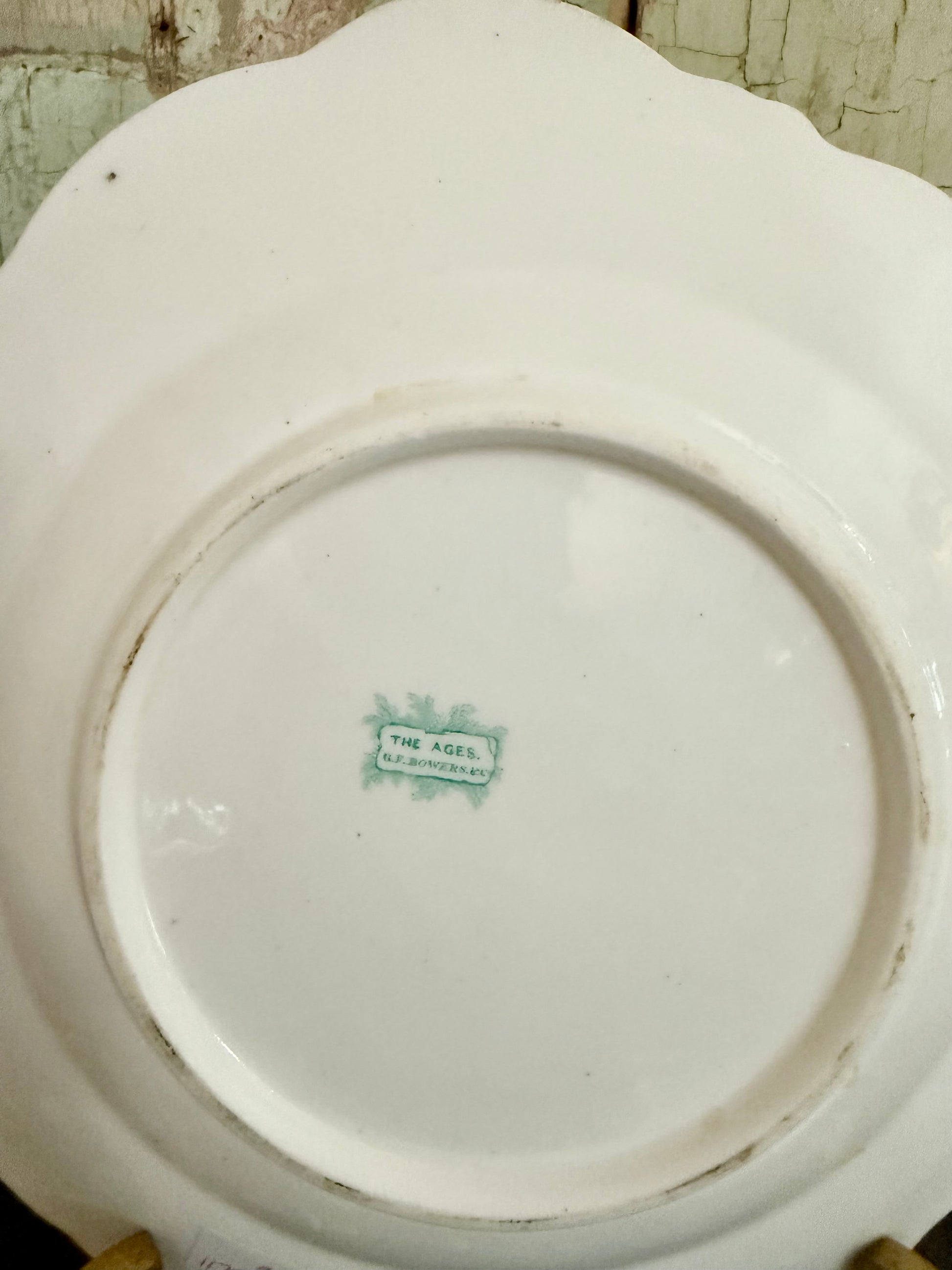 Add a touch of English charm to your collection with this antique GF Bowers & Co. “The Ages” plate. Featuring a beautifully detailed green transferware design and a scalloped, gold-trimmed edge, this piece showcases pastoral and architectural scenes encircling the rim, with a central tree motif that gives it a timeless, serene feel.