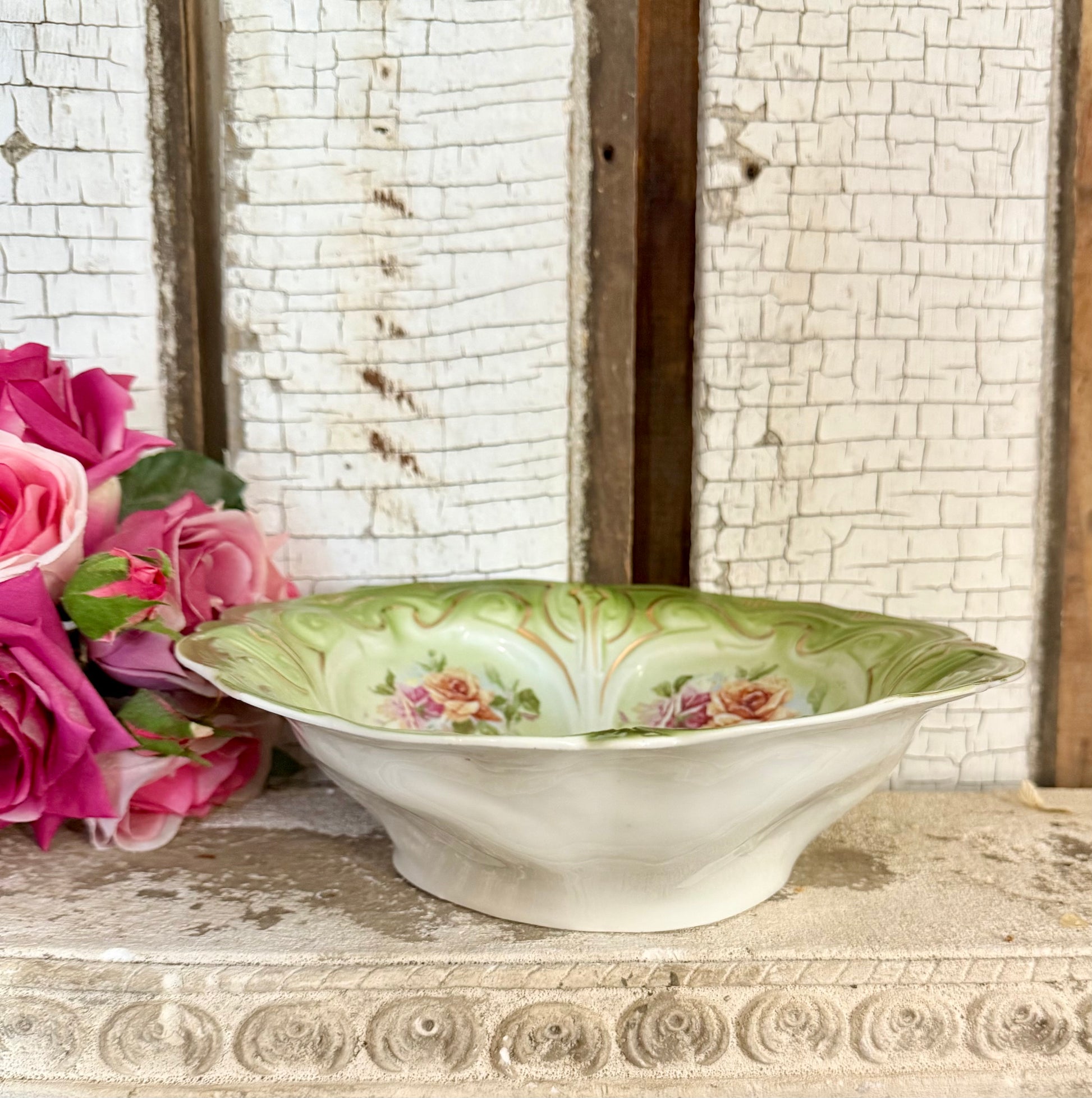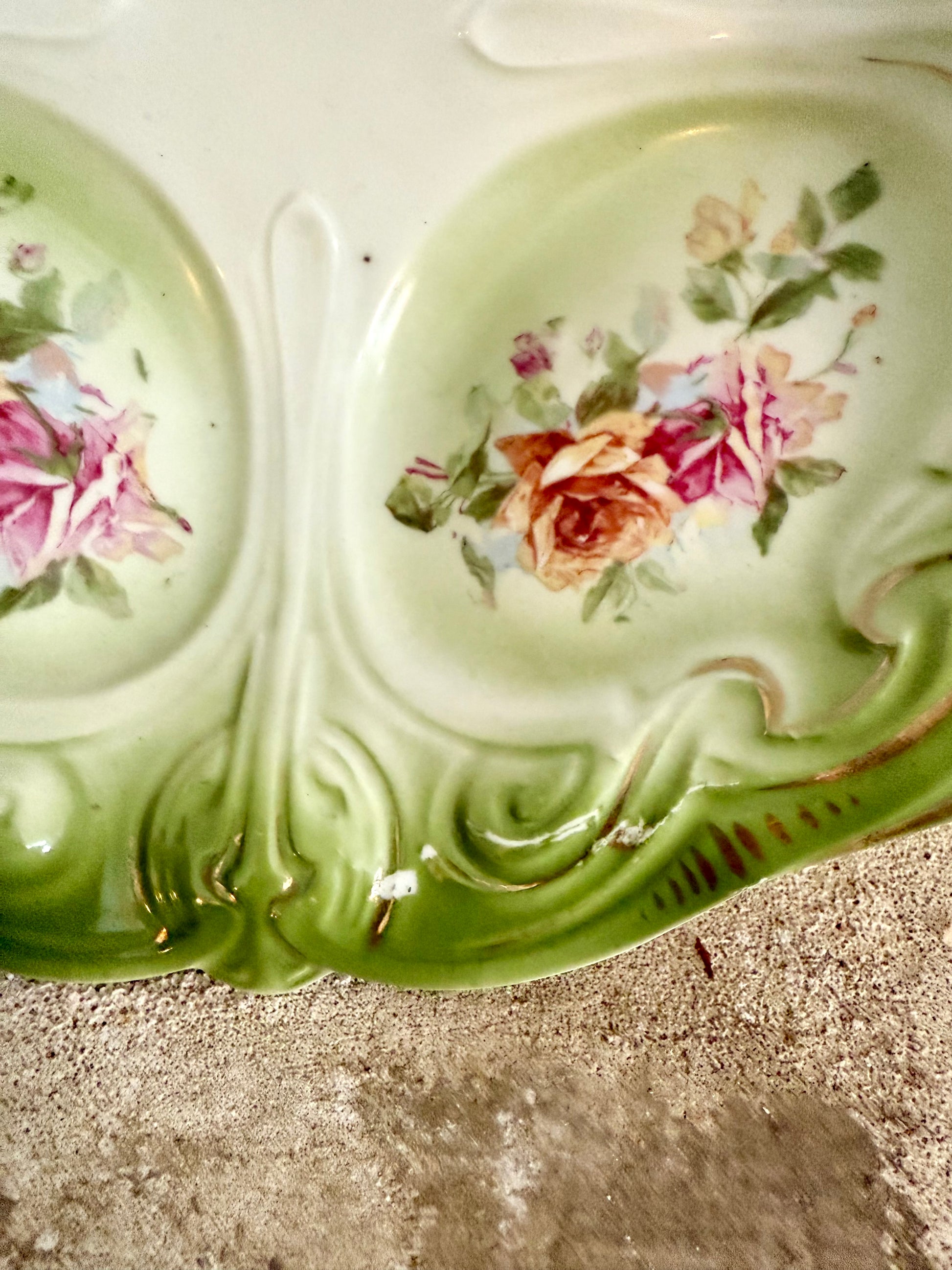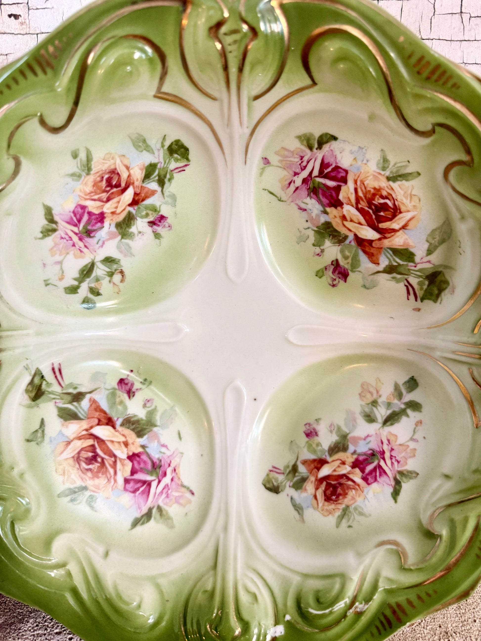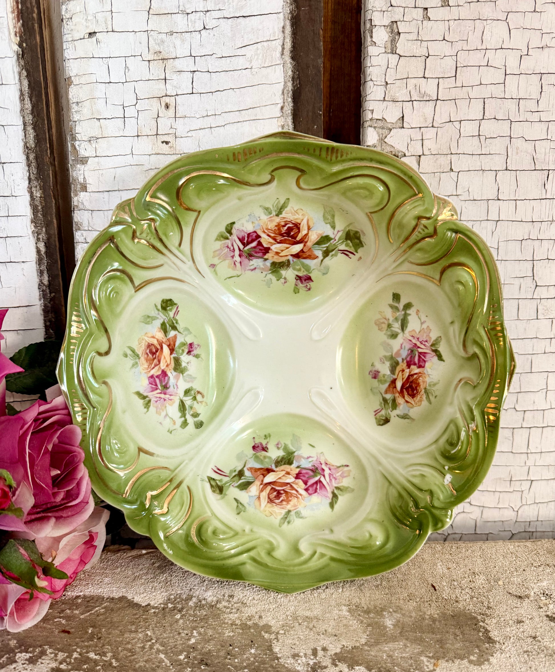 JPF Germany divided Green bowl with floral and gold embellishments. 10" diameter, 2 3/4" deep. Has some slight imperfections on the lower right quadrant. (See pictures)