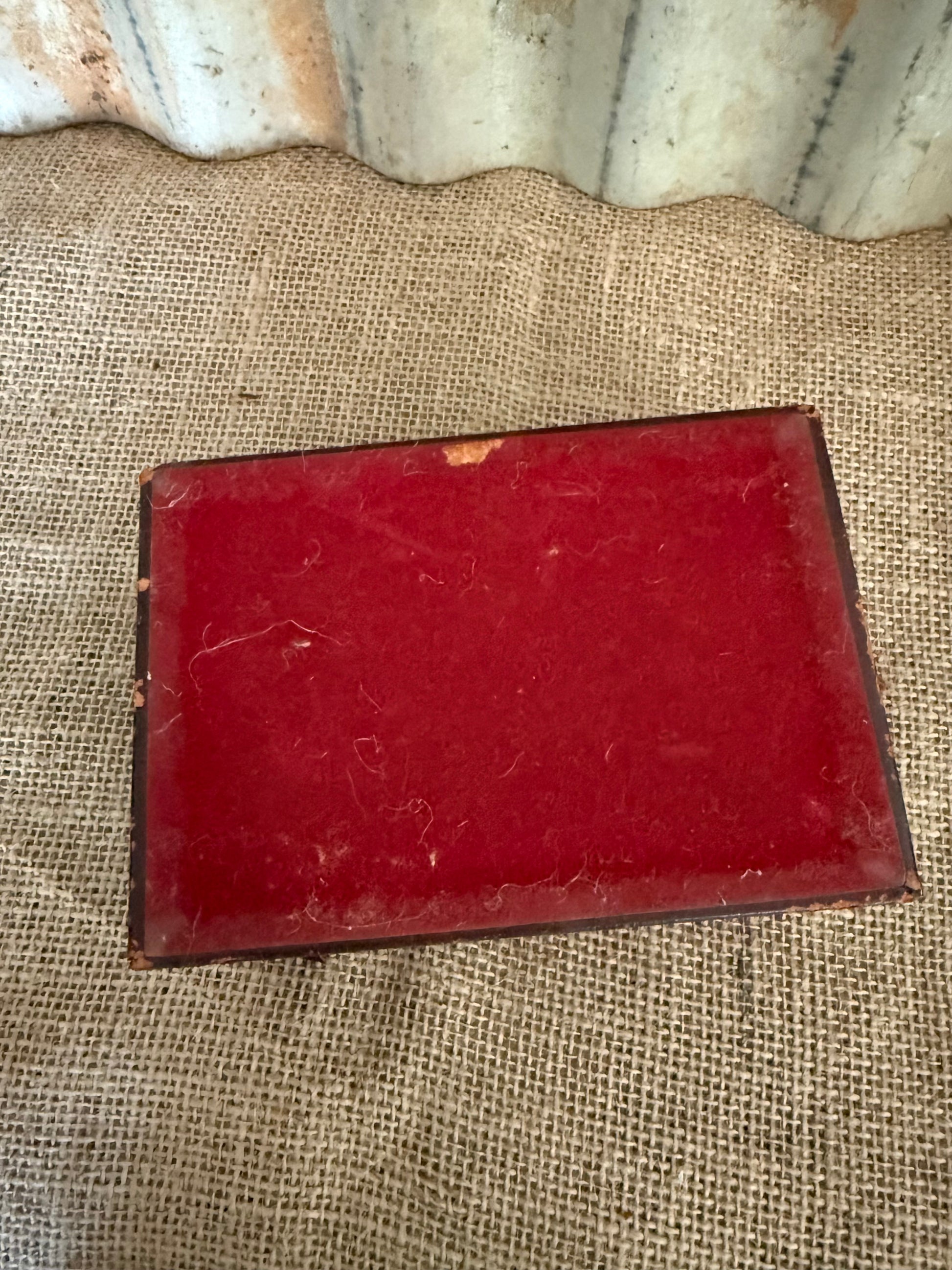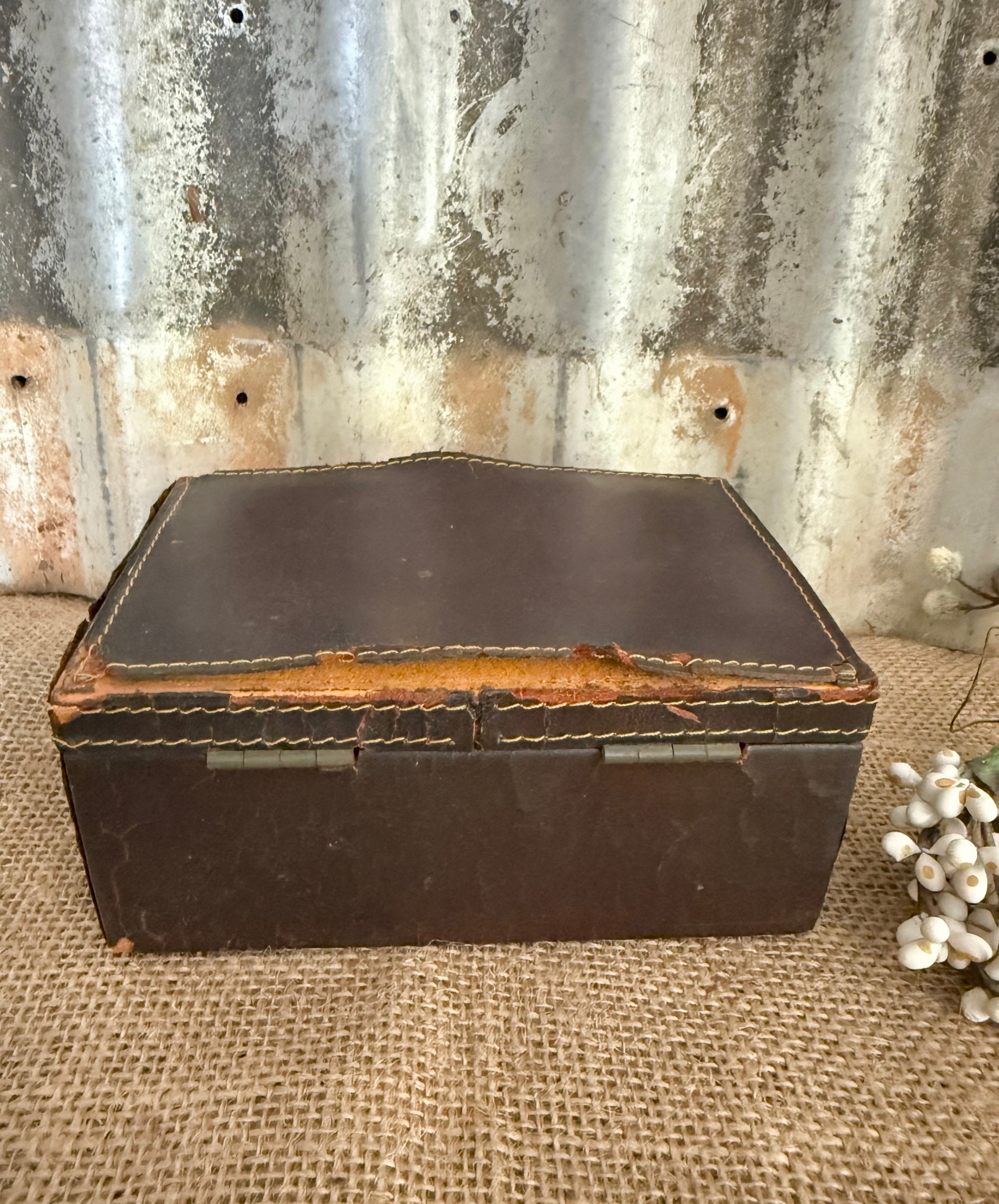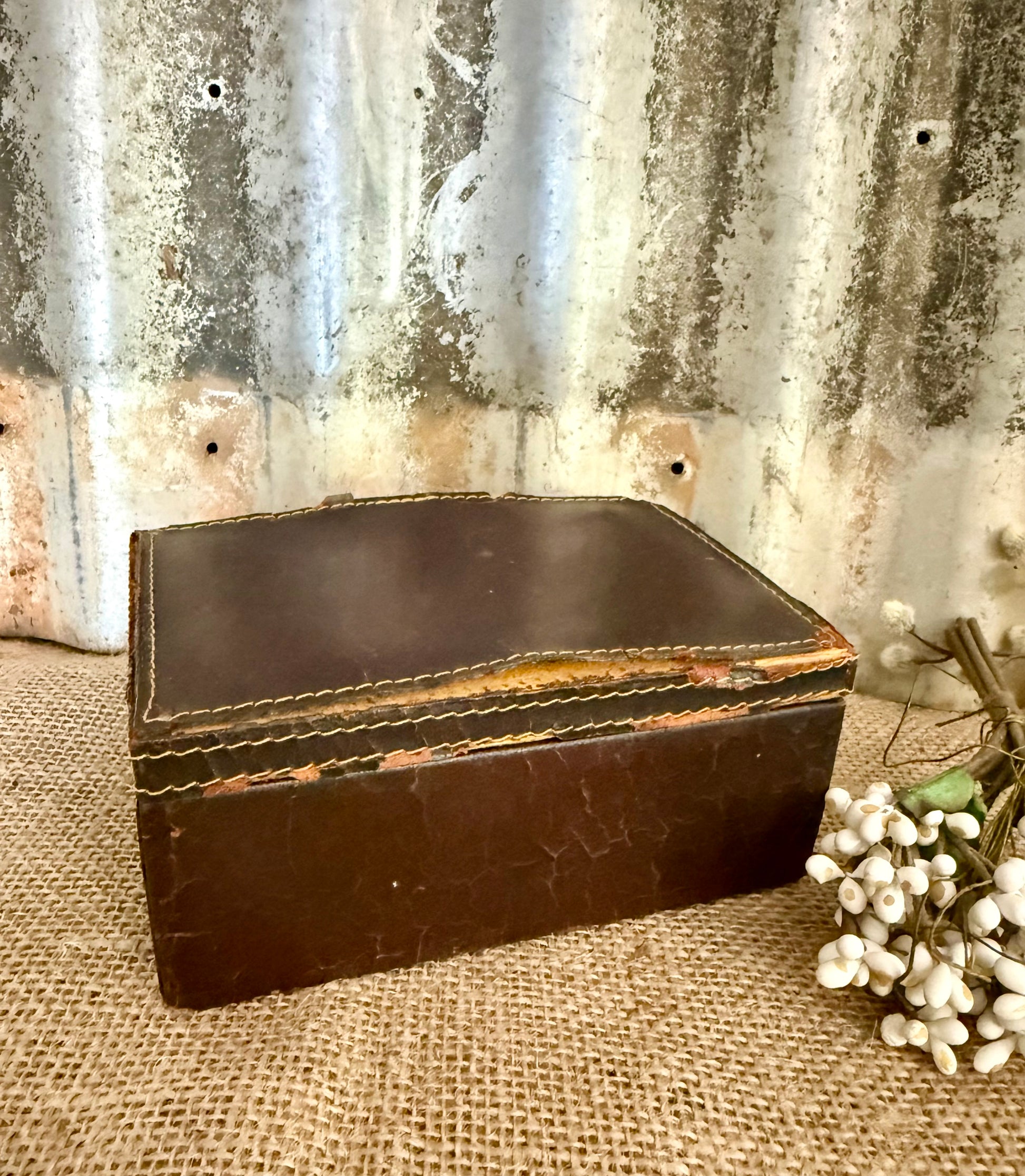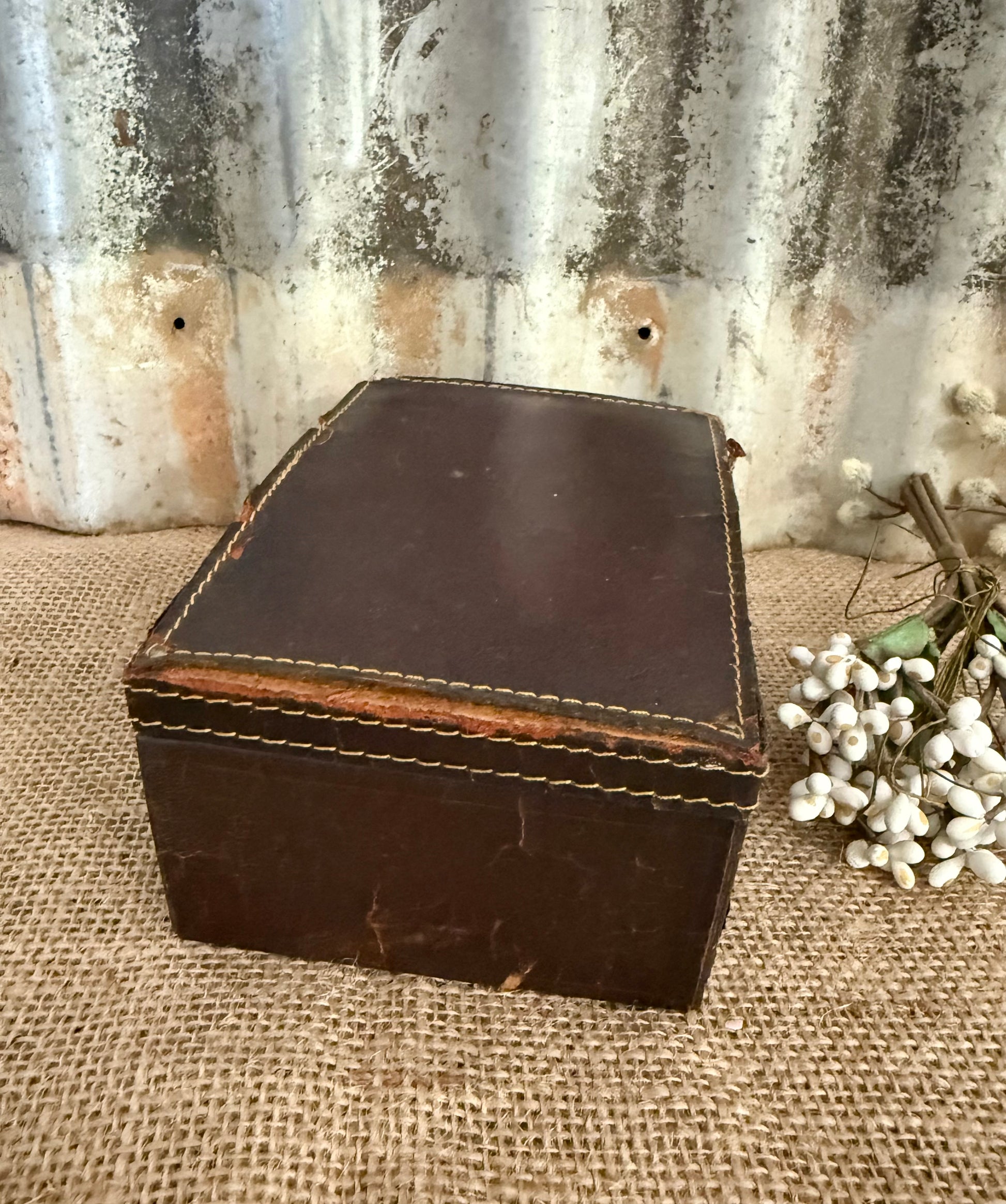 Antique Leather Box. 5 3/4" long, 4" wide, 2 1/2" tall. Beautiful stitching. This is an old piece and has quite a bit of wear but this just adds to its charm! It would make a great riser, jewelry box or trinket box.