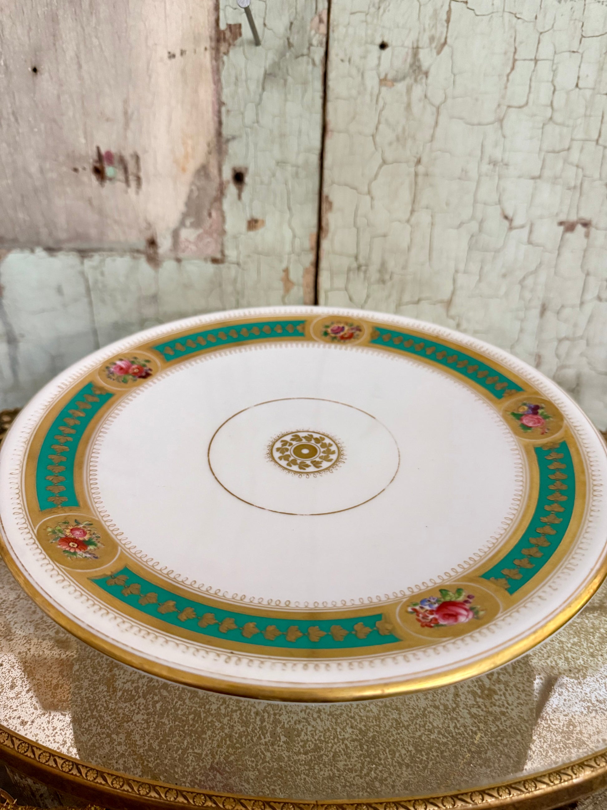 Elevate your table with this exquisite antique Minton porcelain cake stand, beautifully decorated with a regal green and gold border accented by pink florals. The pedestal base features matching hand-painted detailing, giving this piece stunning presence from every angle. Perfect for serving pastries and cakes or displaying as a statement centerpiece.