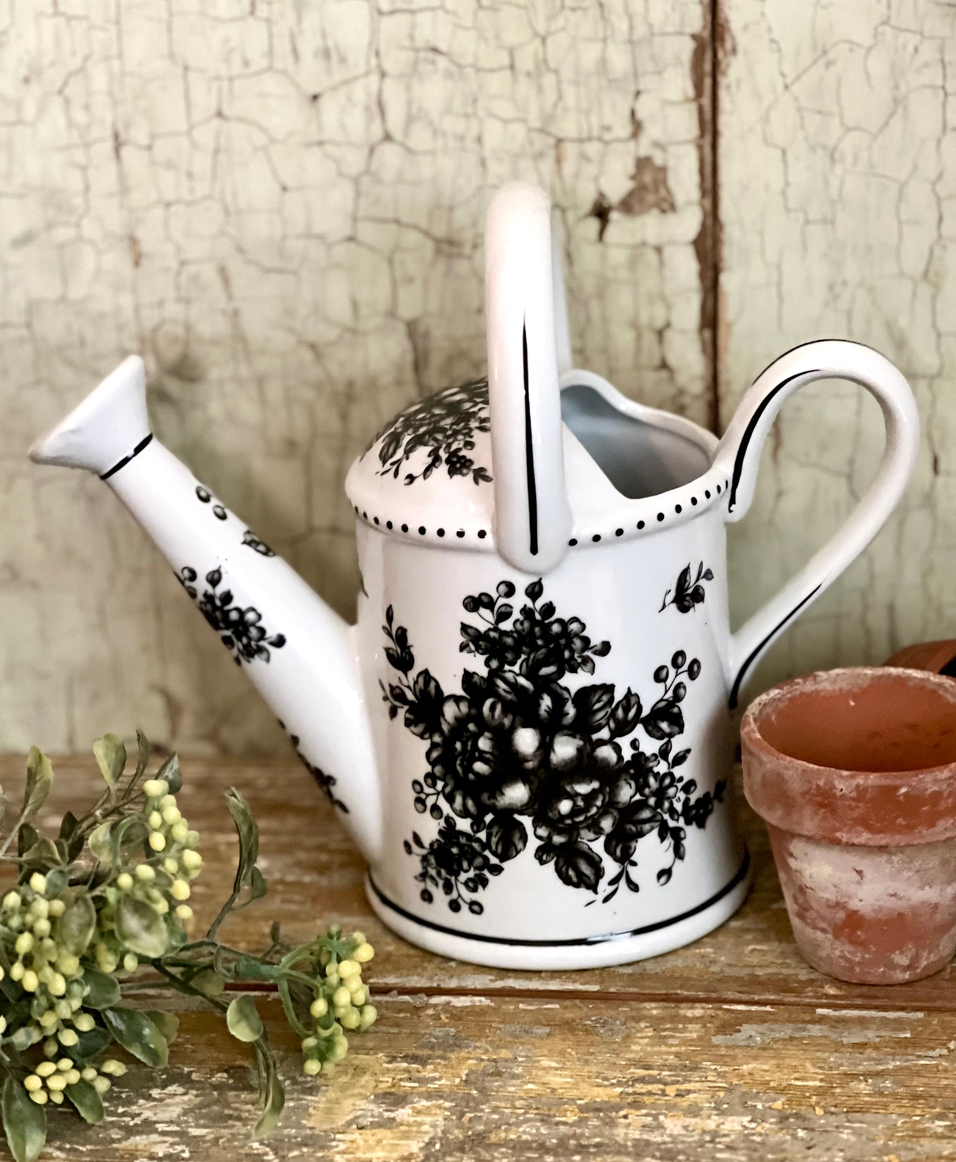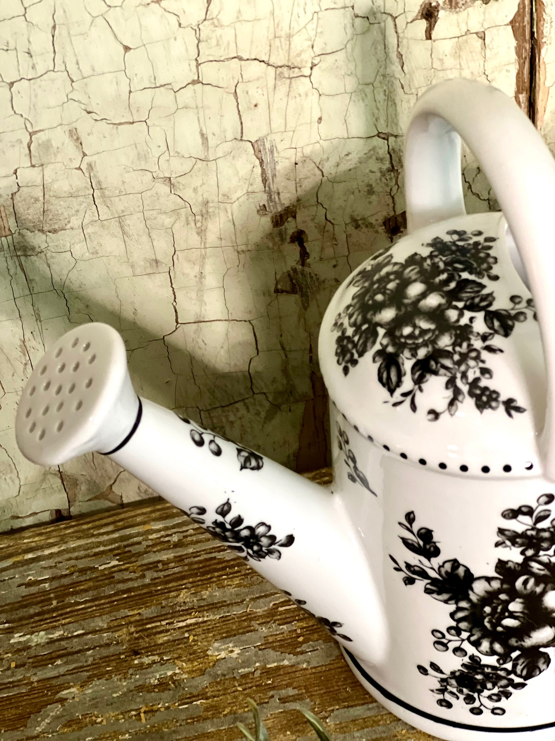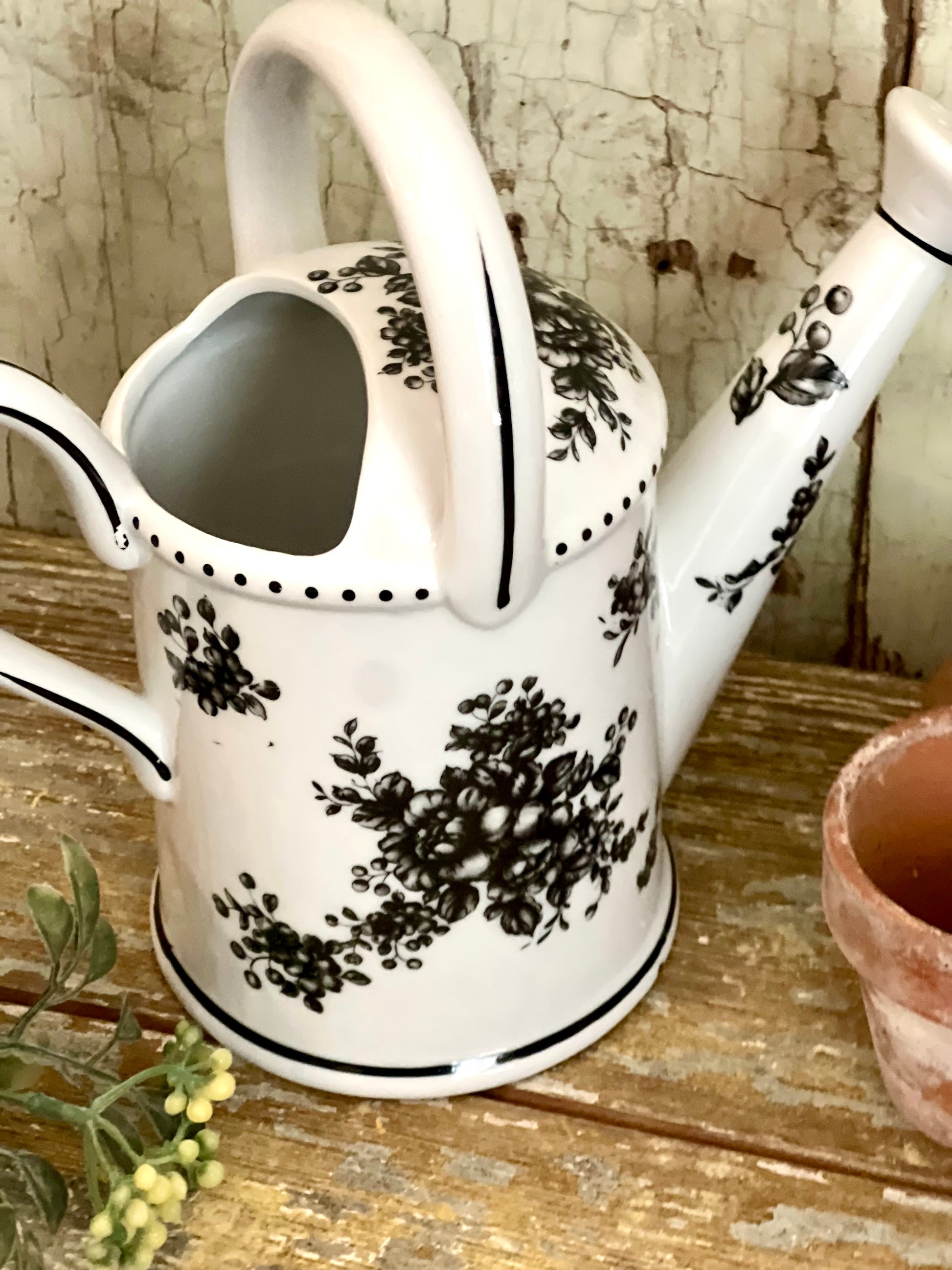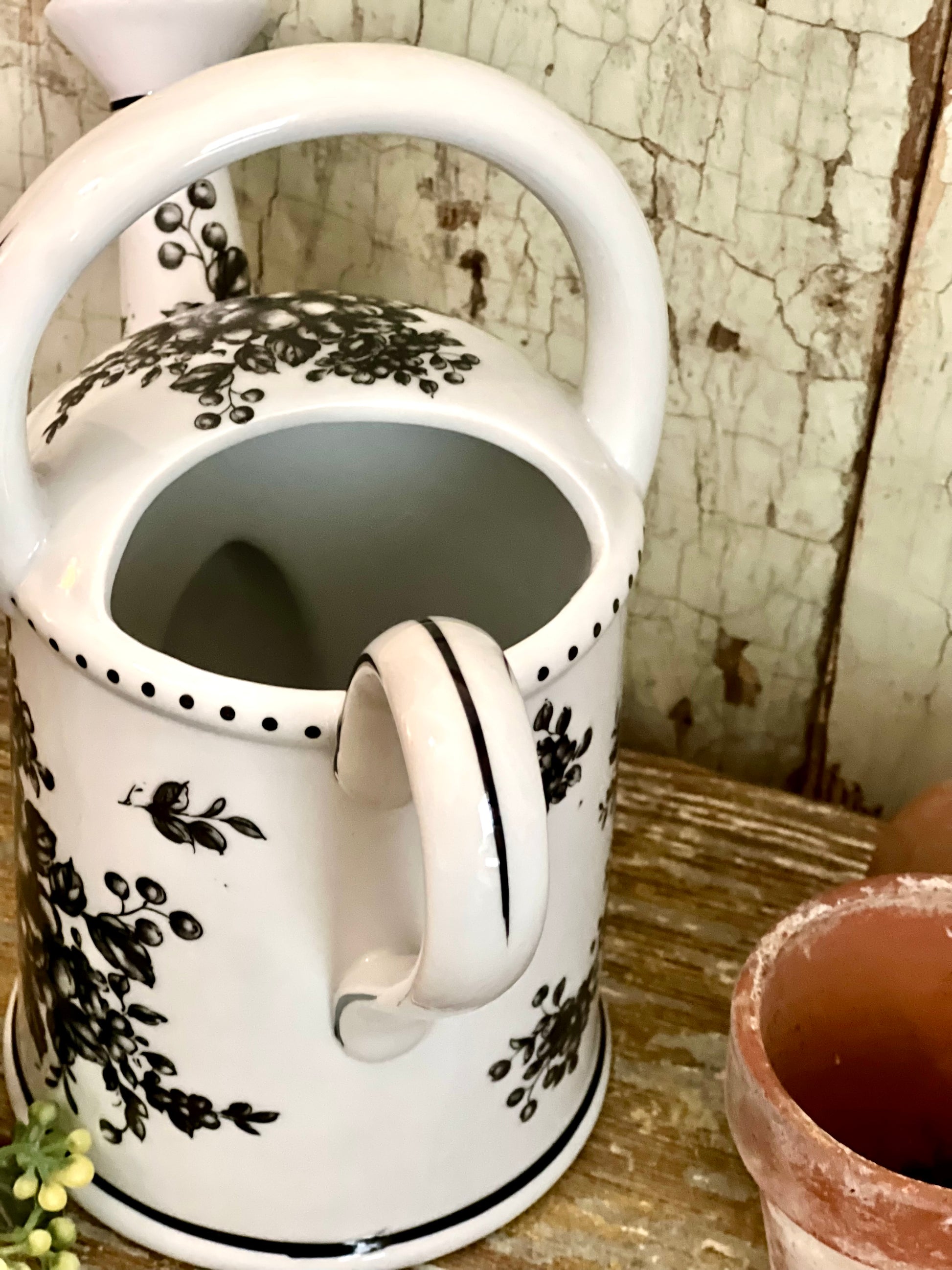 Ceramic black and white floral watering can. In great condition! No chips, cracks, or breaks. 9" tall, 10 1/2" wide handle to spout.