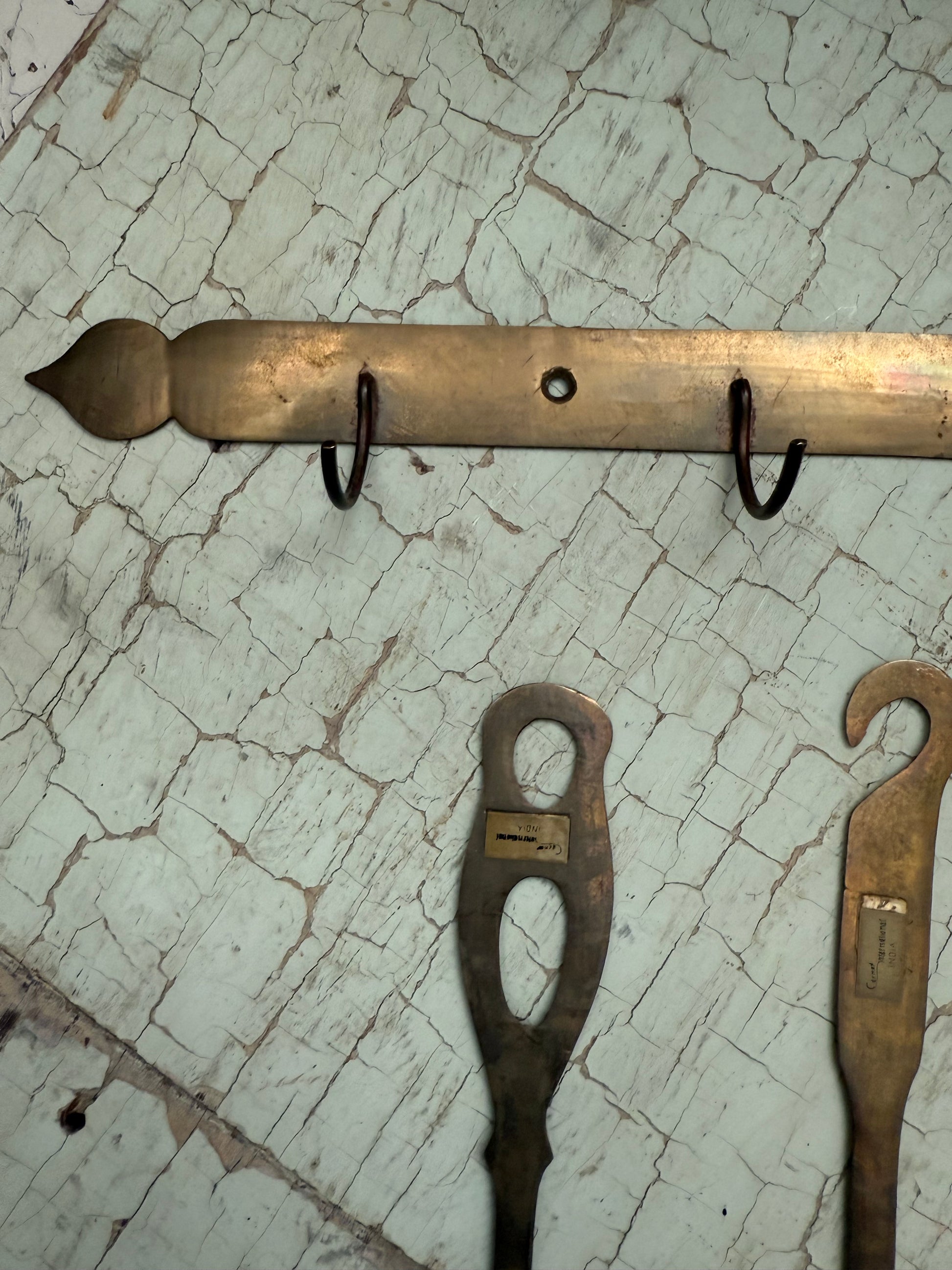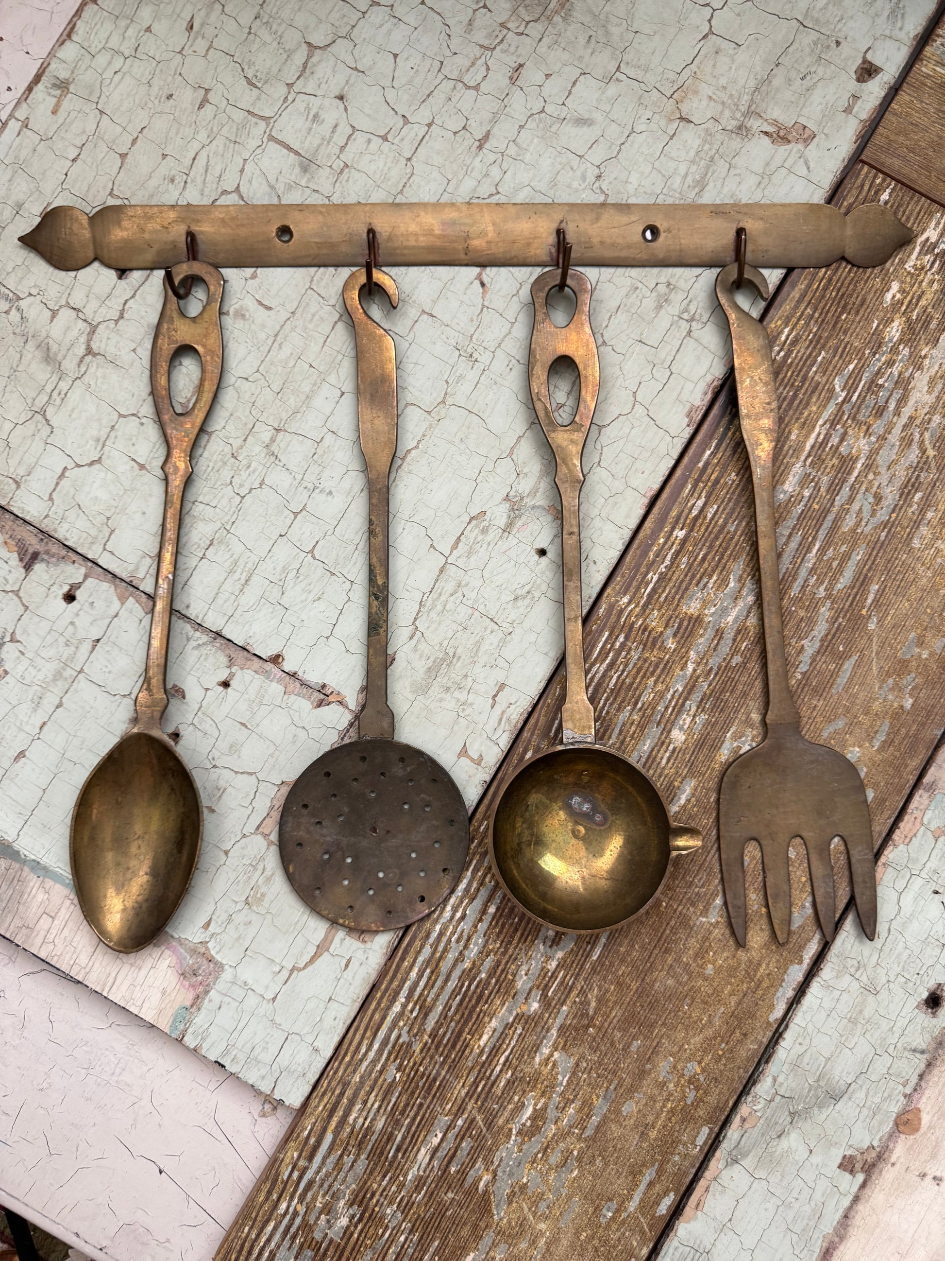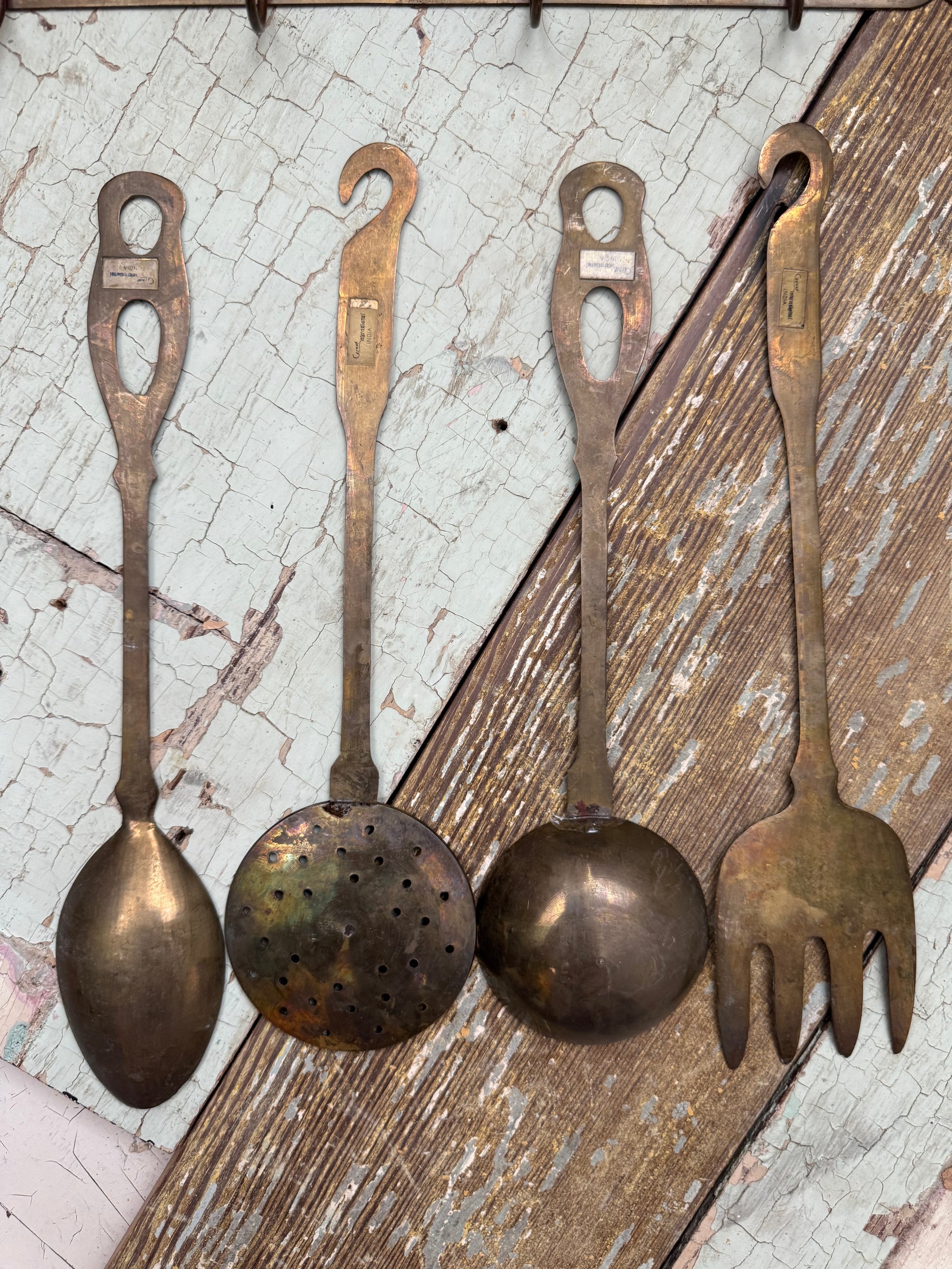 Set of 4 solid brass serving utensils with hook wall plate. Marked India, some patina. The utensils range from 10 3/4" to 11 1/2" long. The hook plate is 15 1/2" wide. A beautiful and rare set!