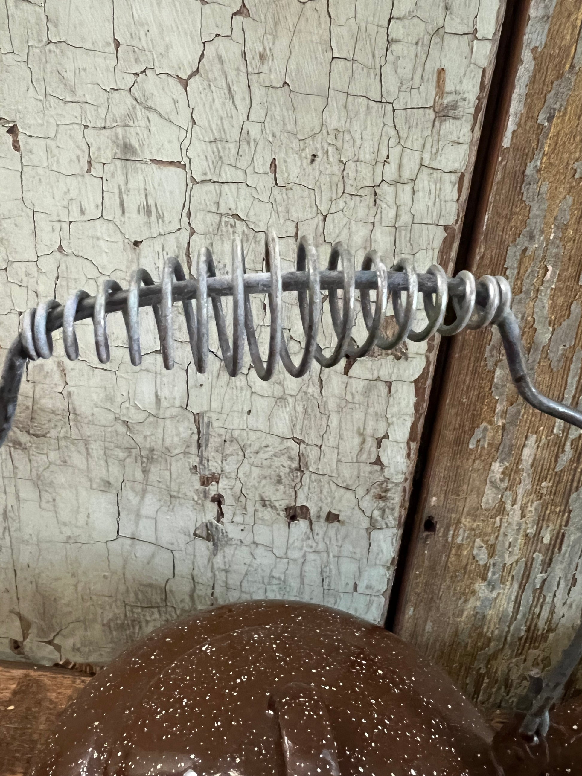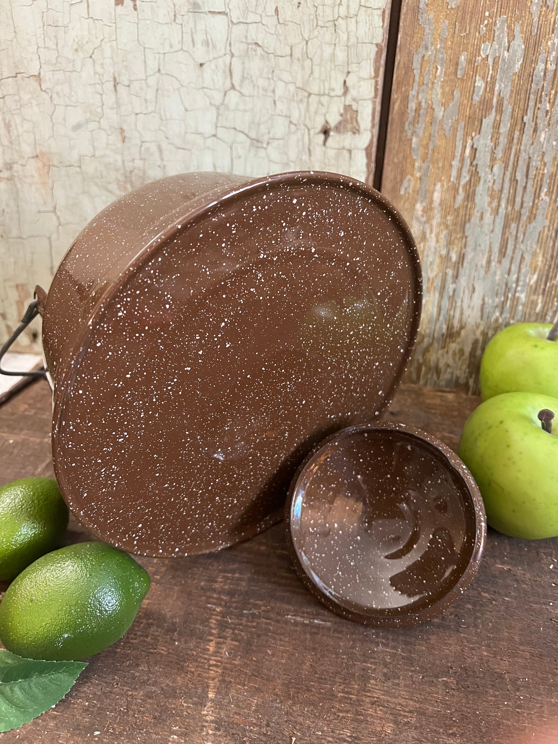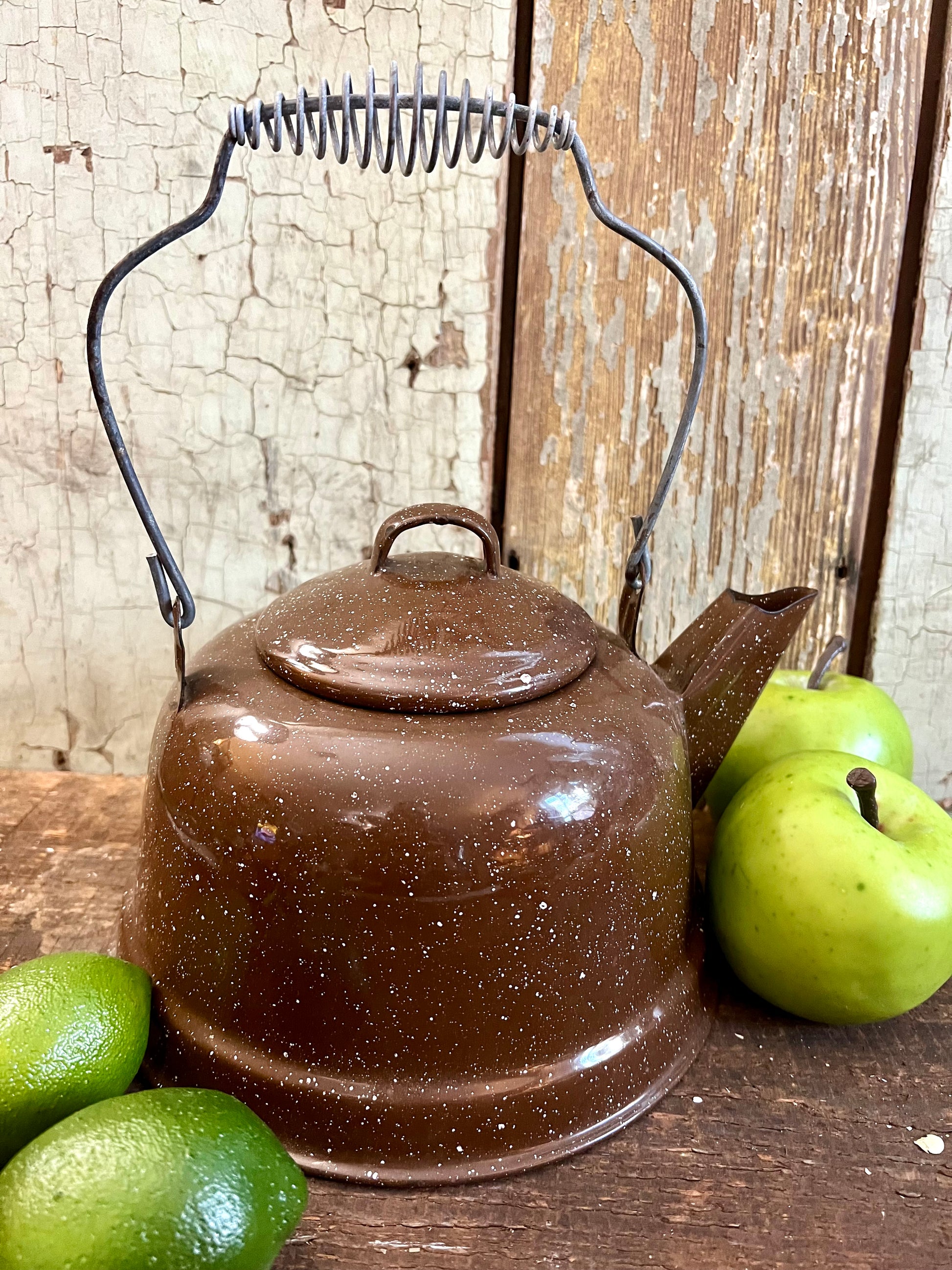 Brown enamelware vintage kettle. Wire handle. Great condition with very little patina. 8 1/4" diameter and 12" tall with handle extended.
