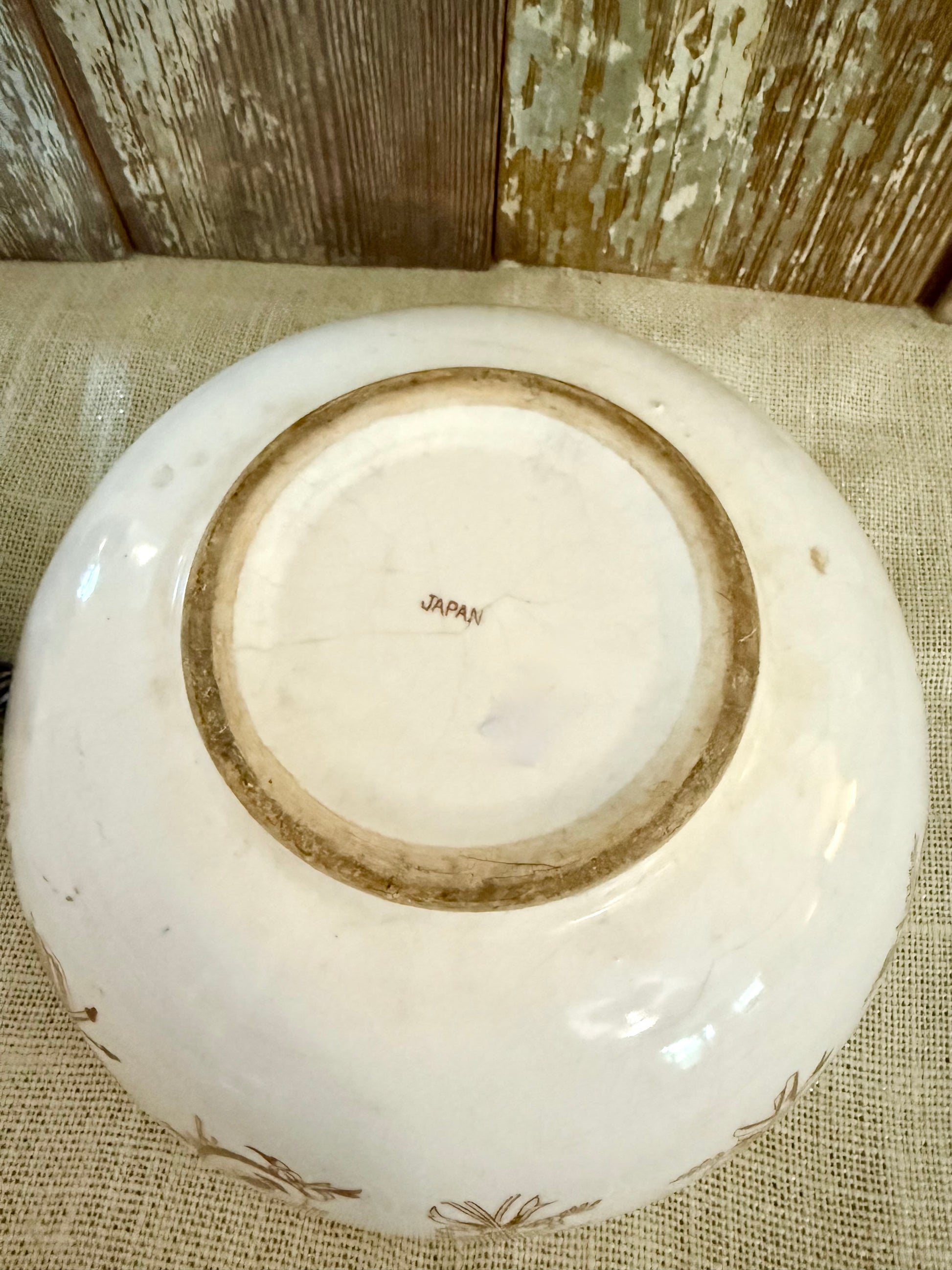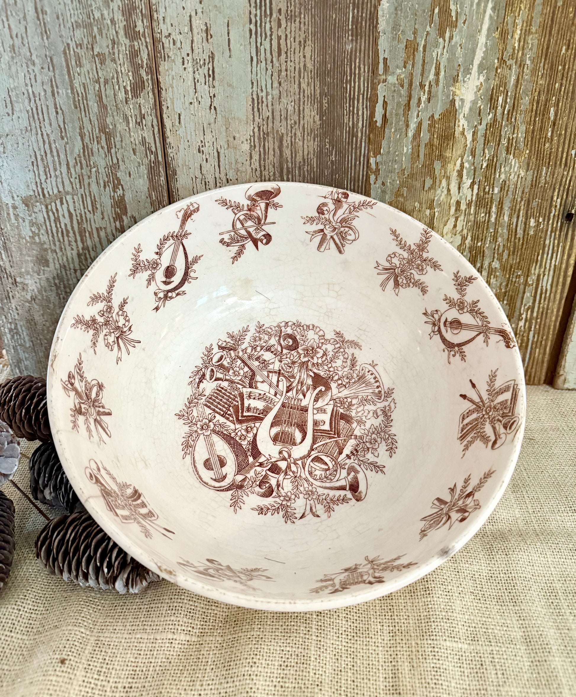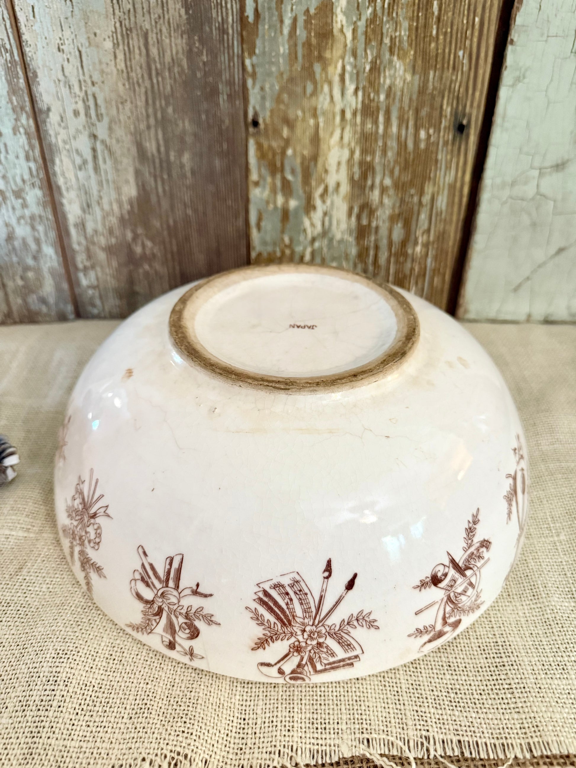 Brown Transferware bowl with gorgeous musical instrument detail. 10" marked Japan. Stained & Crazed
