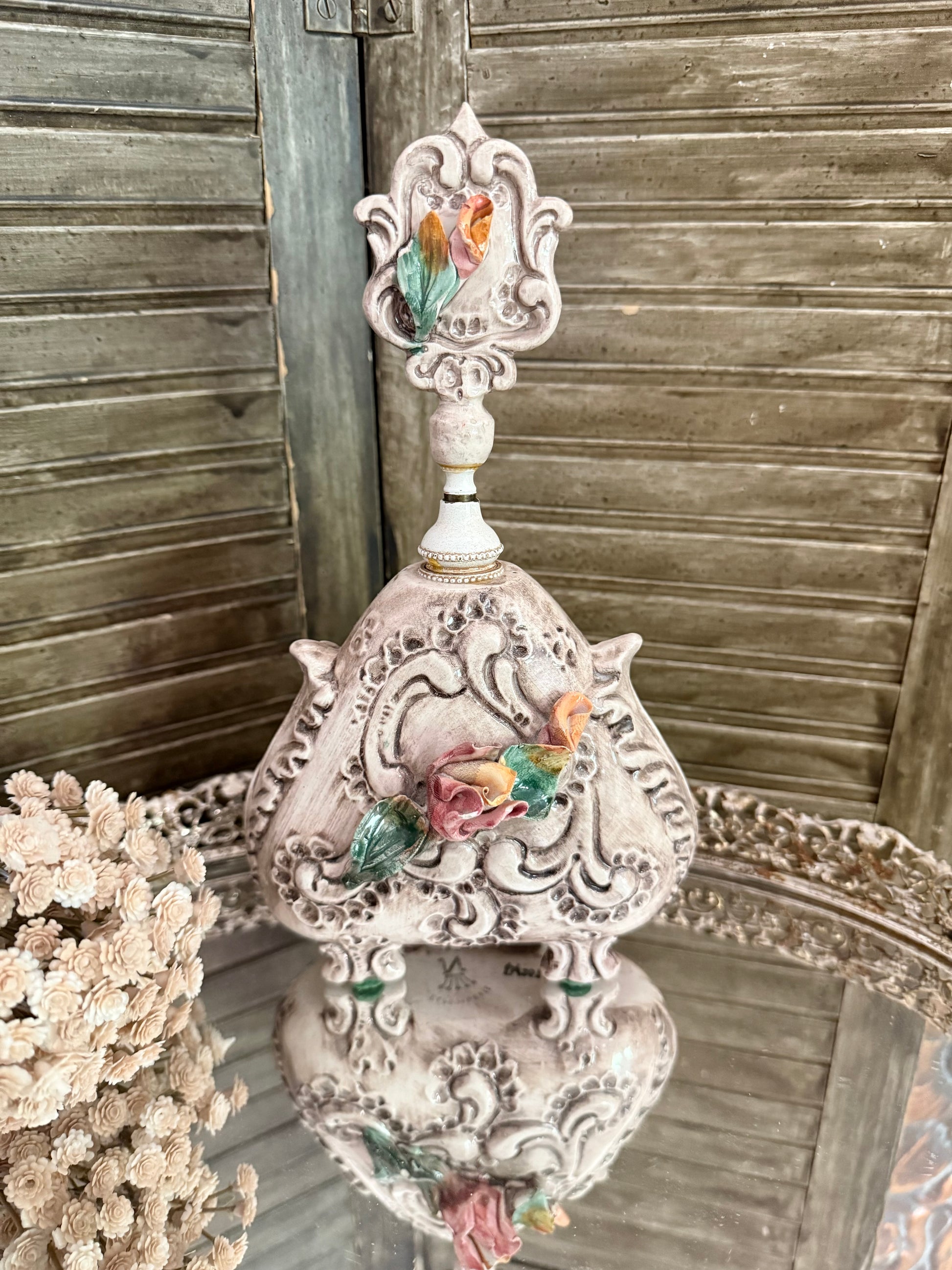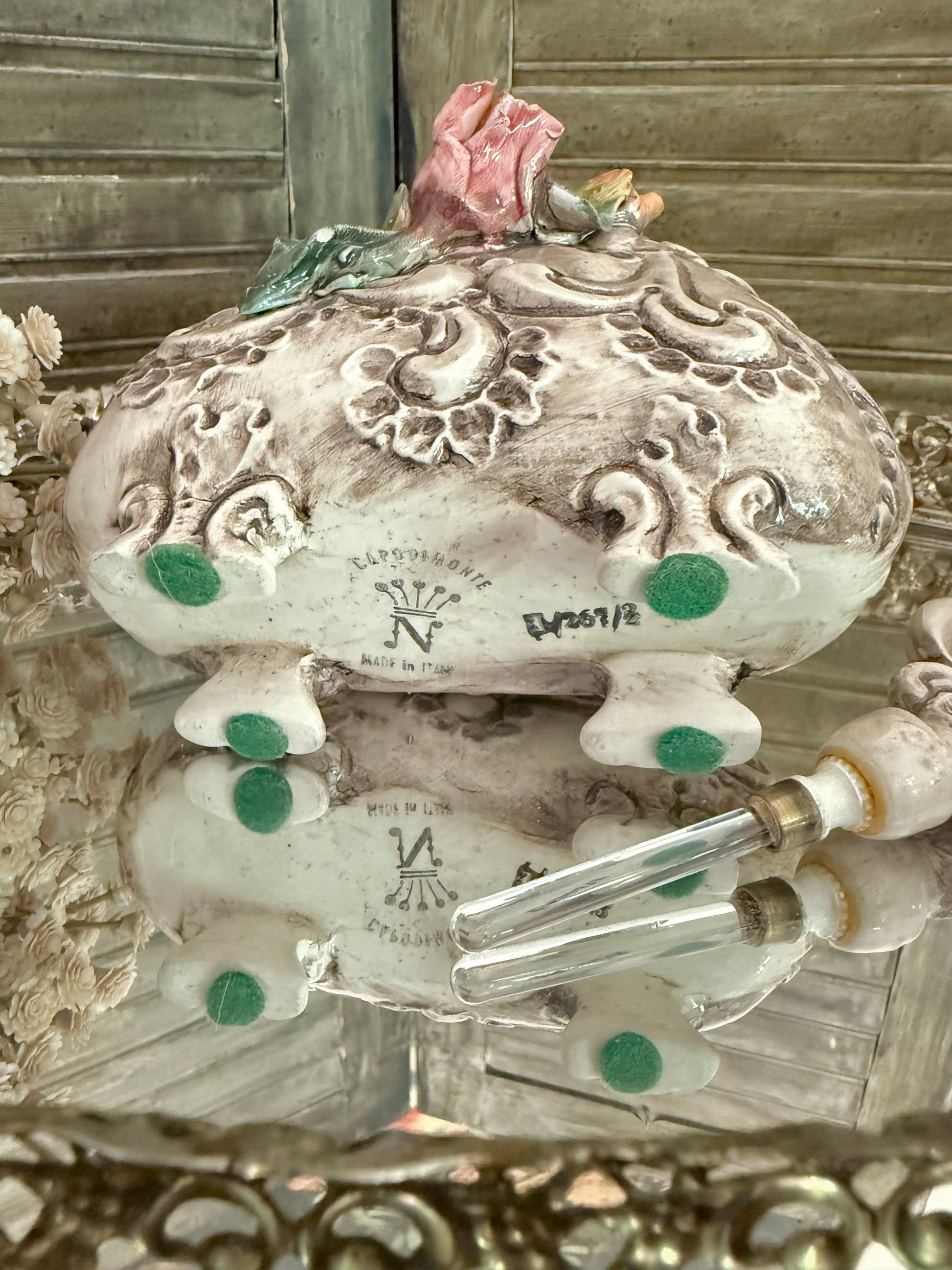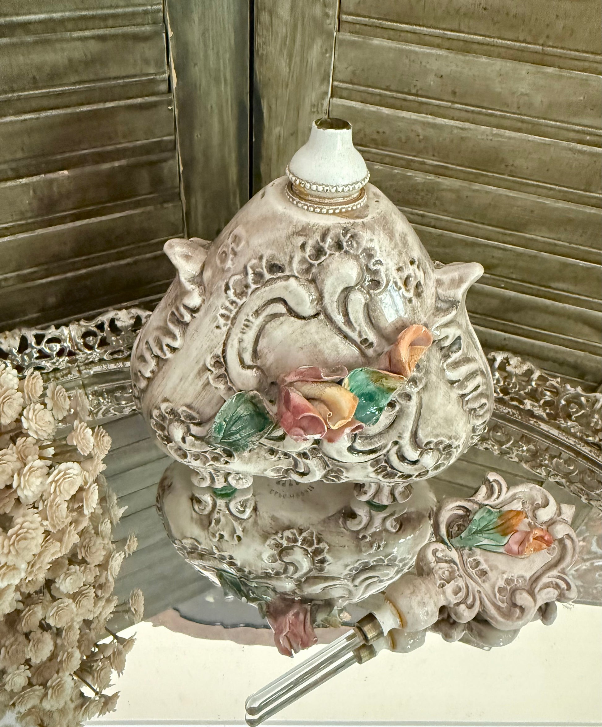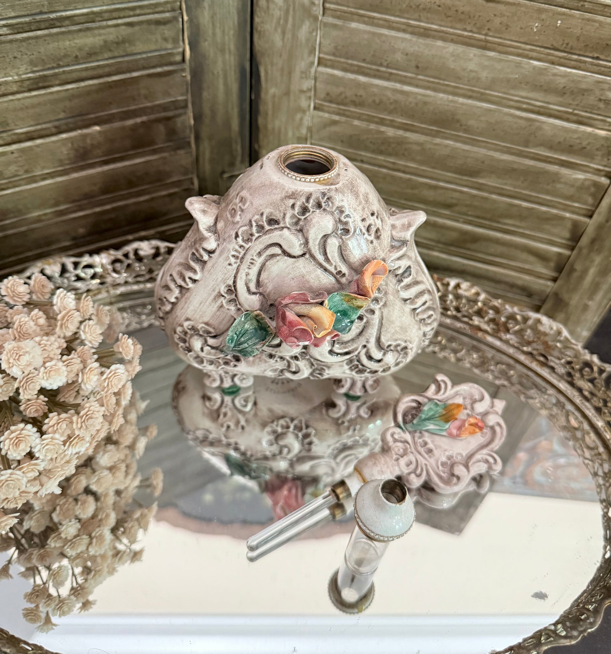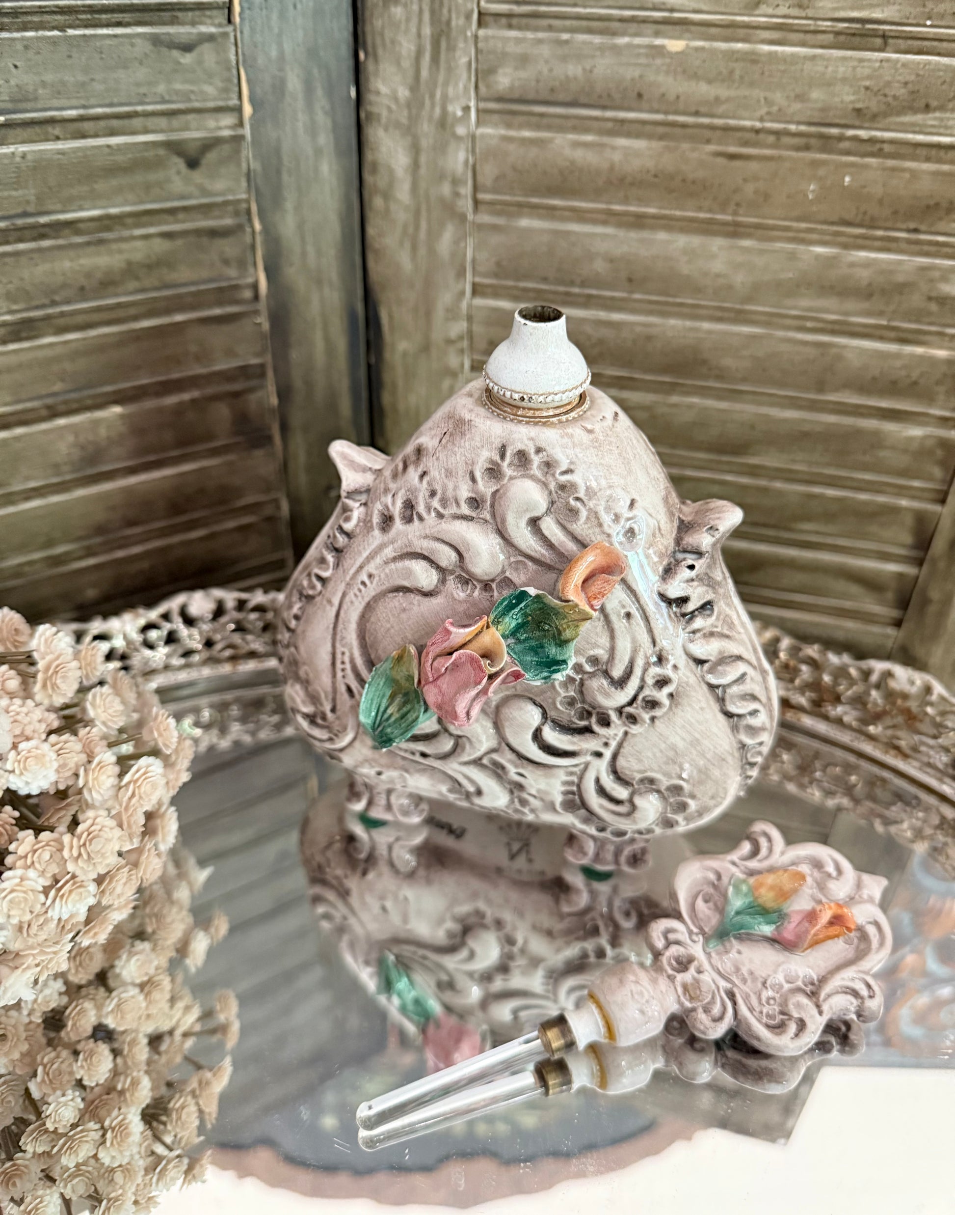 Antique Capodimonte porcelain Perfume Bottle with glass Atomizer. Marked Italy. Beautiful three dimensional floral design. The detail is stunning! A beautiful addition to your bathroom vanity or dressing table. 9" tall, 5 1/2" wide