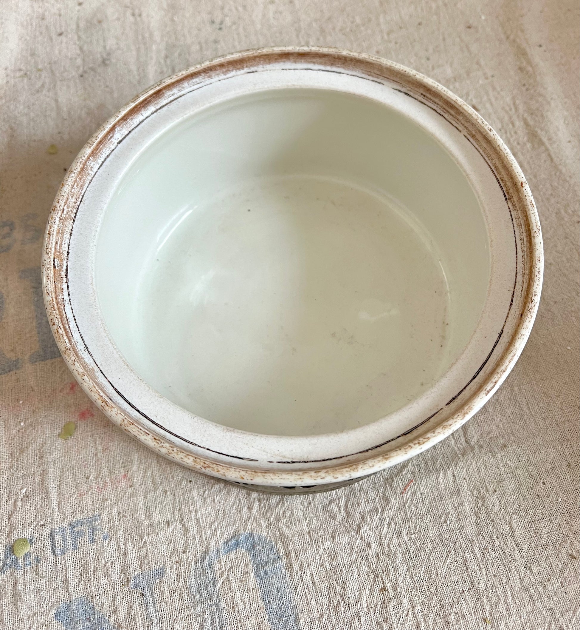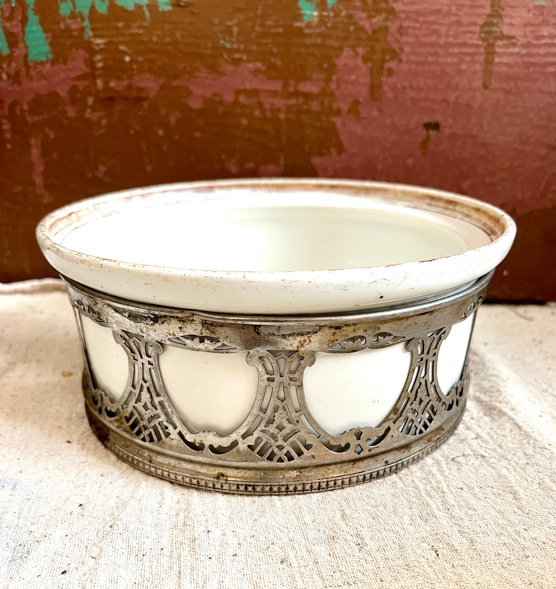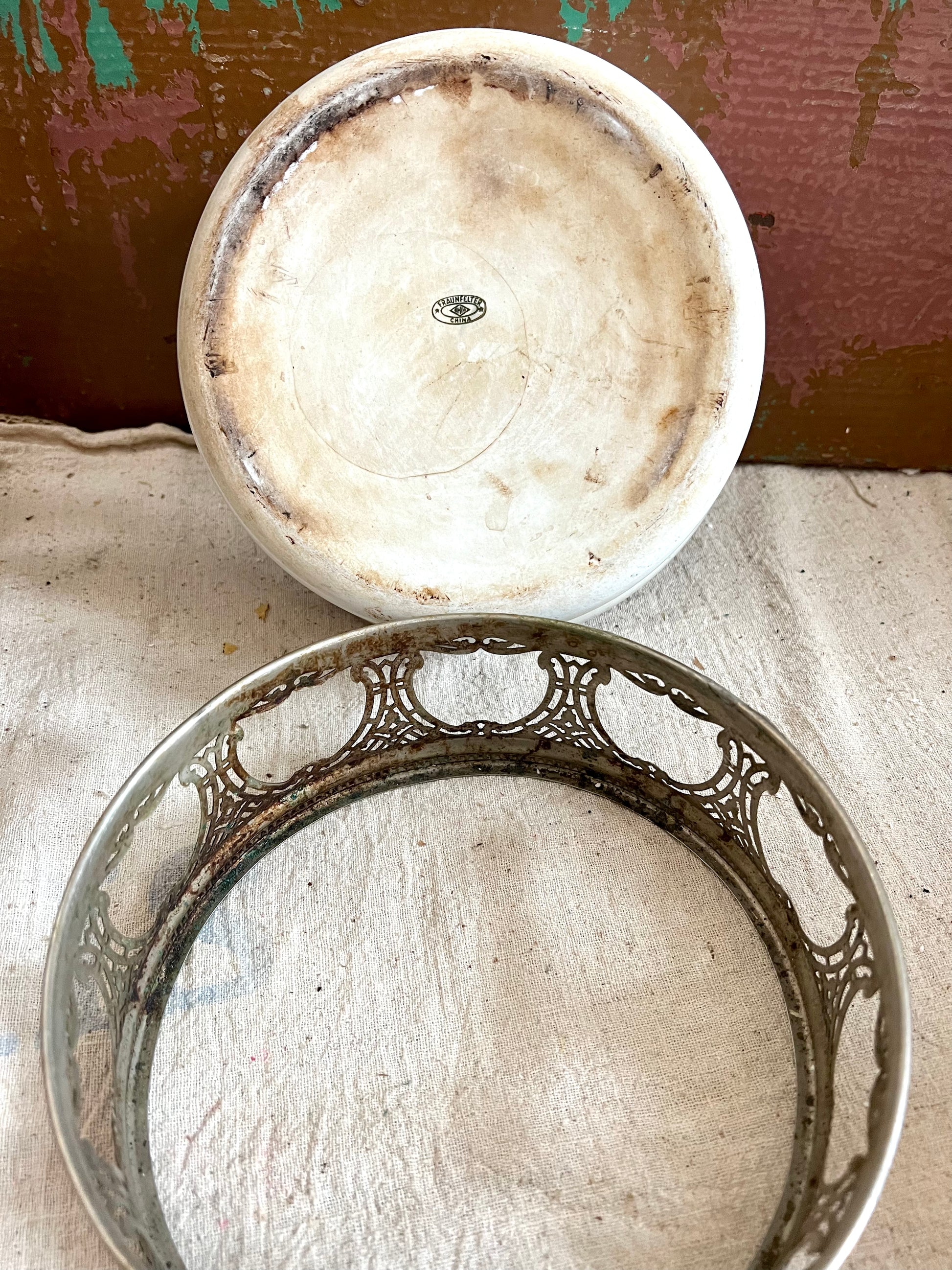 Fraunfelter casserole dish with metal band. 8 1/2' diameter