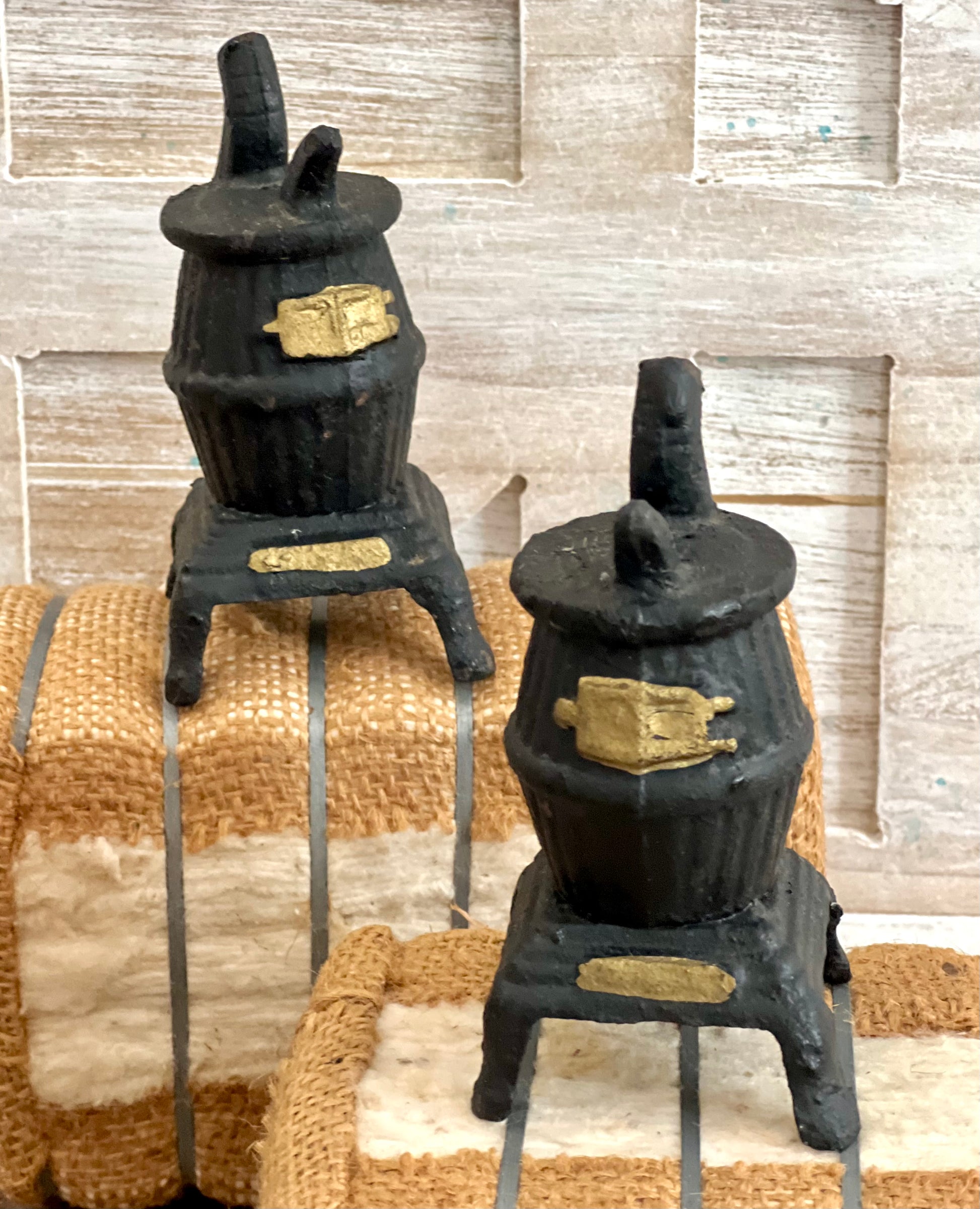 Cast iron pot bell stove salt and pepper shakers. Stoppers in tact. 4" tall