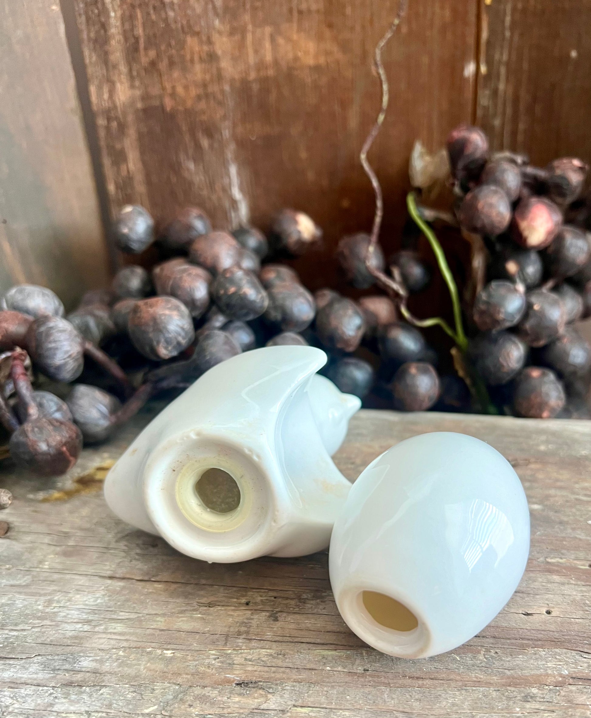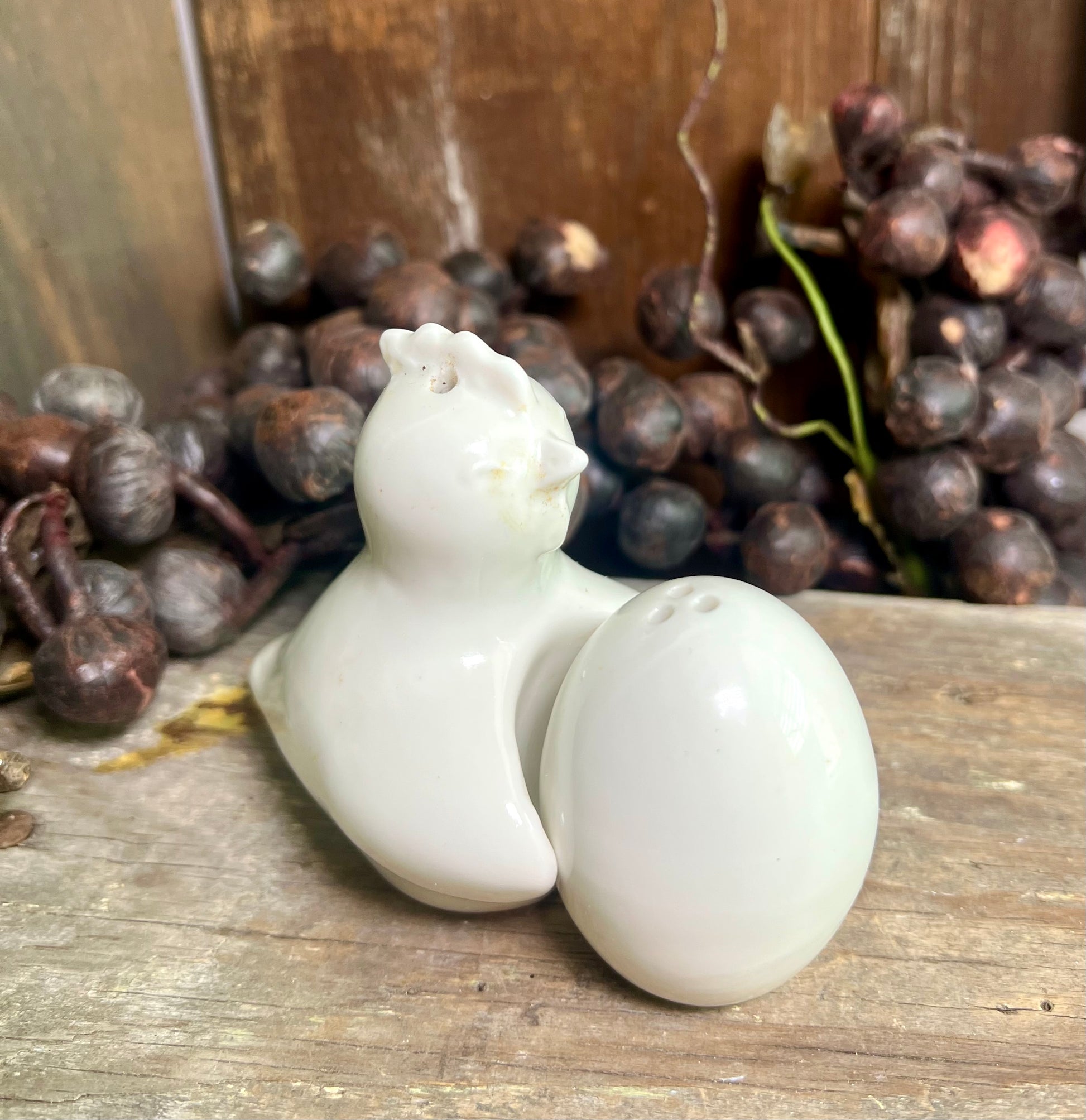 Ceramic chicken and egg salt and pepper shakers. The egg is missing the stopper but that can easily be replaced. The chicken is 3 1/4" tall.