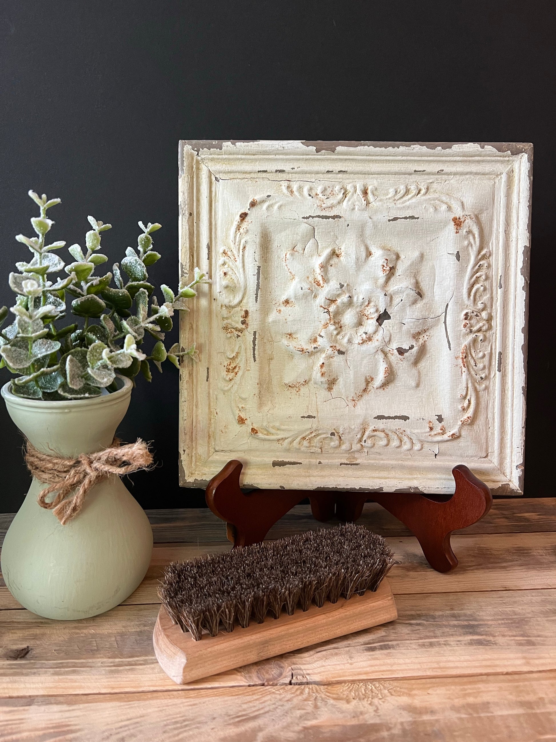 Distressed cream decorative tile. Can be hung or propped as shown. Lightweight and measures 9 1/2" x 9 1/2"