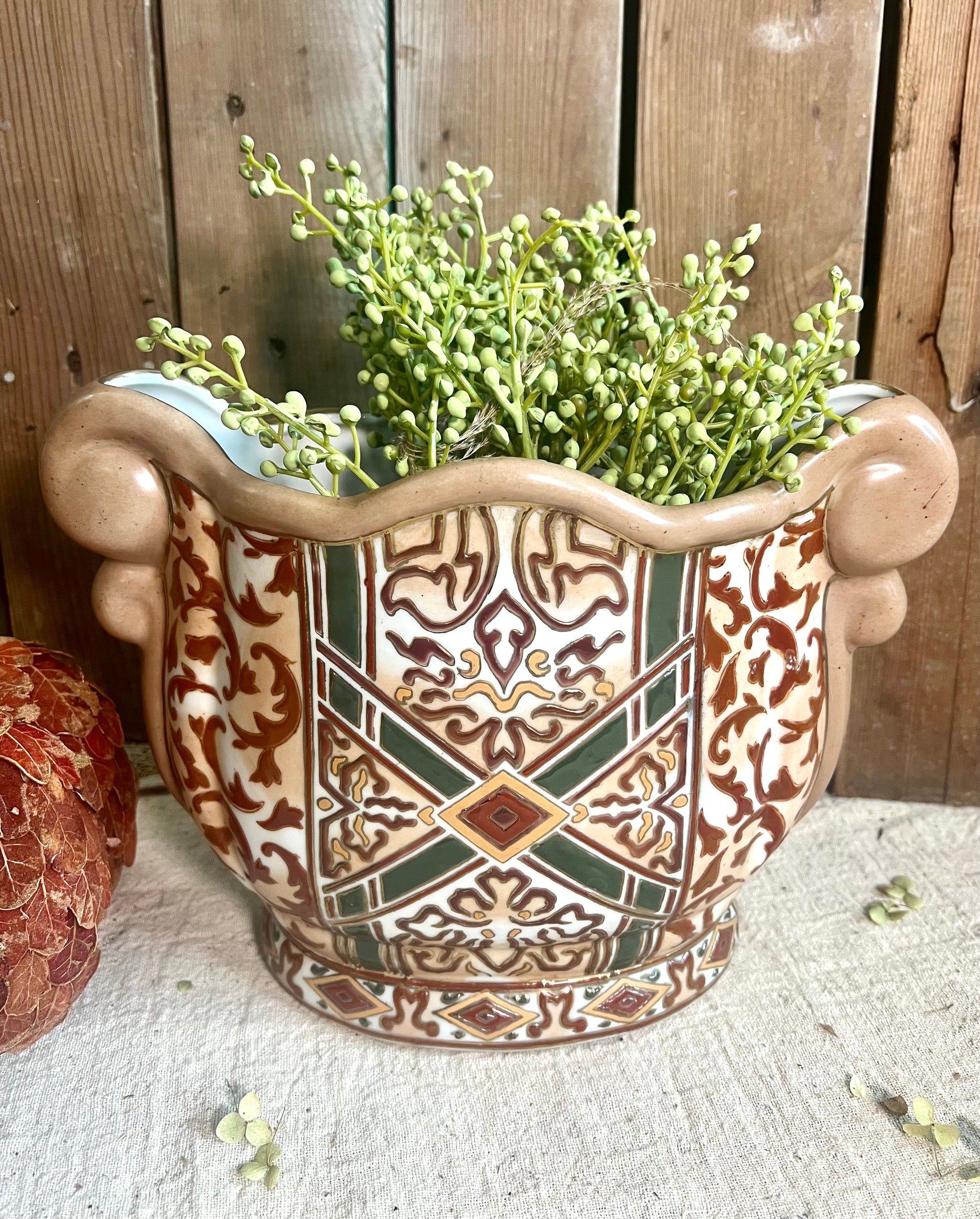 Ceramic Urn with beautiful rust & dark green detail. 8” tall, 10 1/2” handle to handle and 4 1/2” deep.