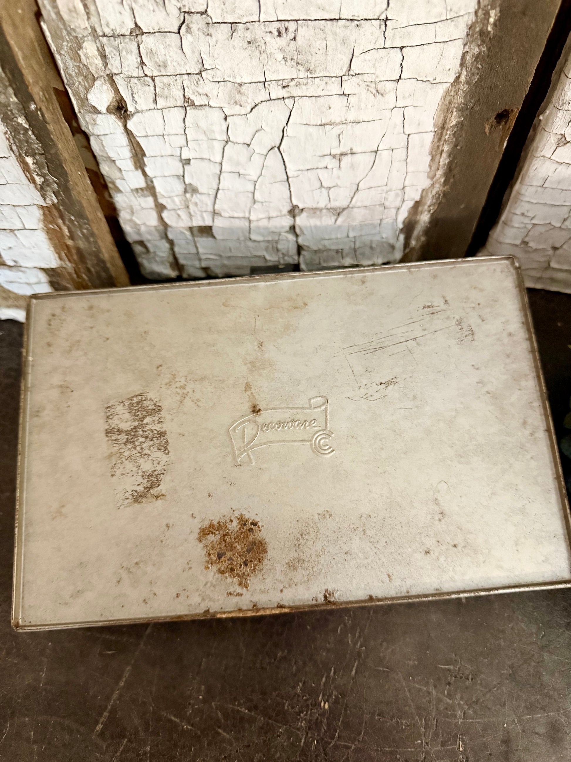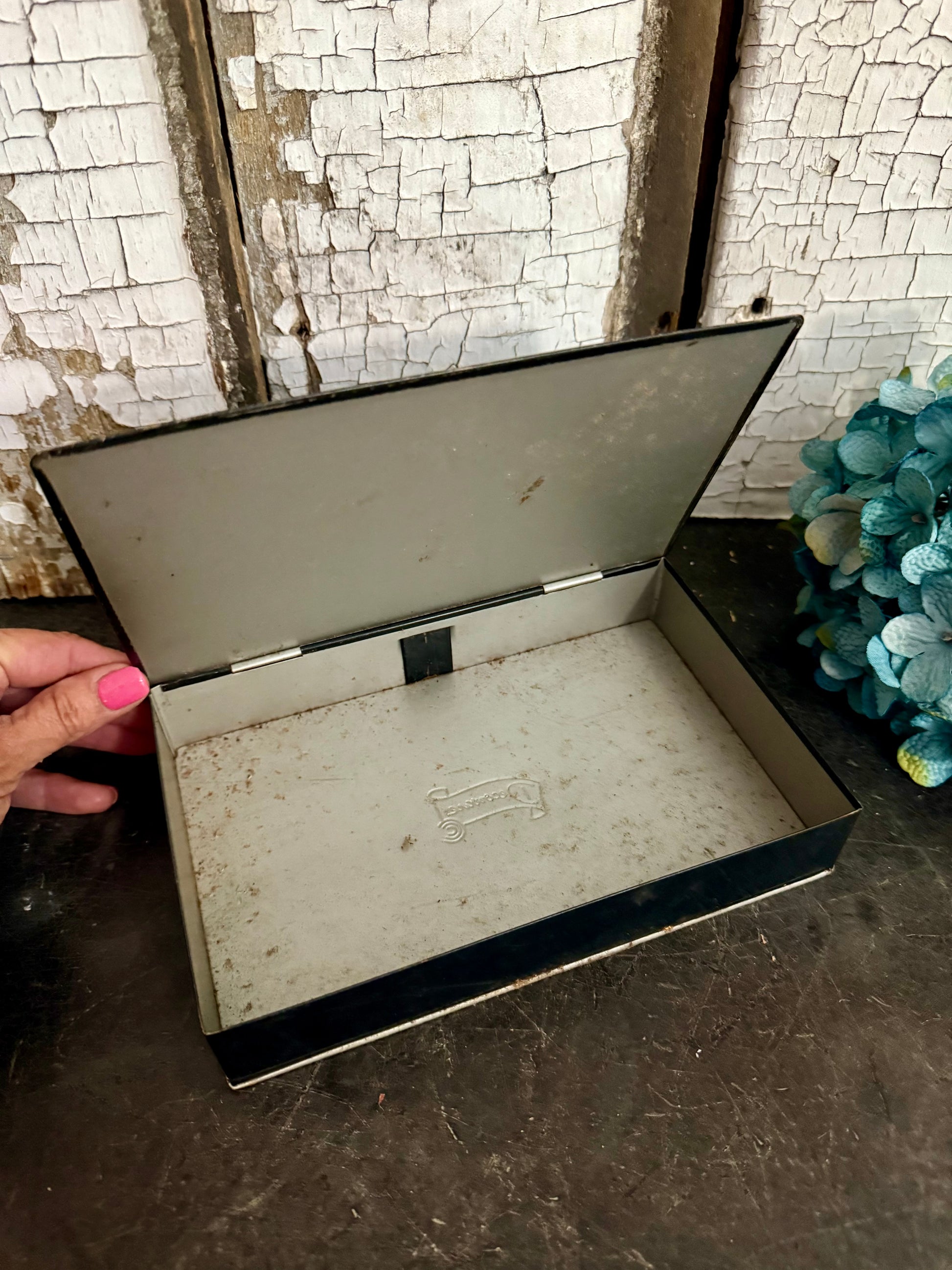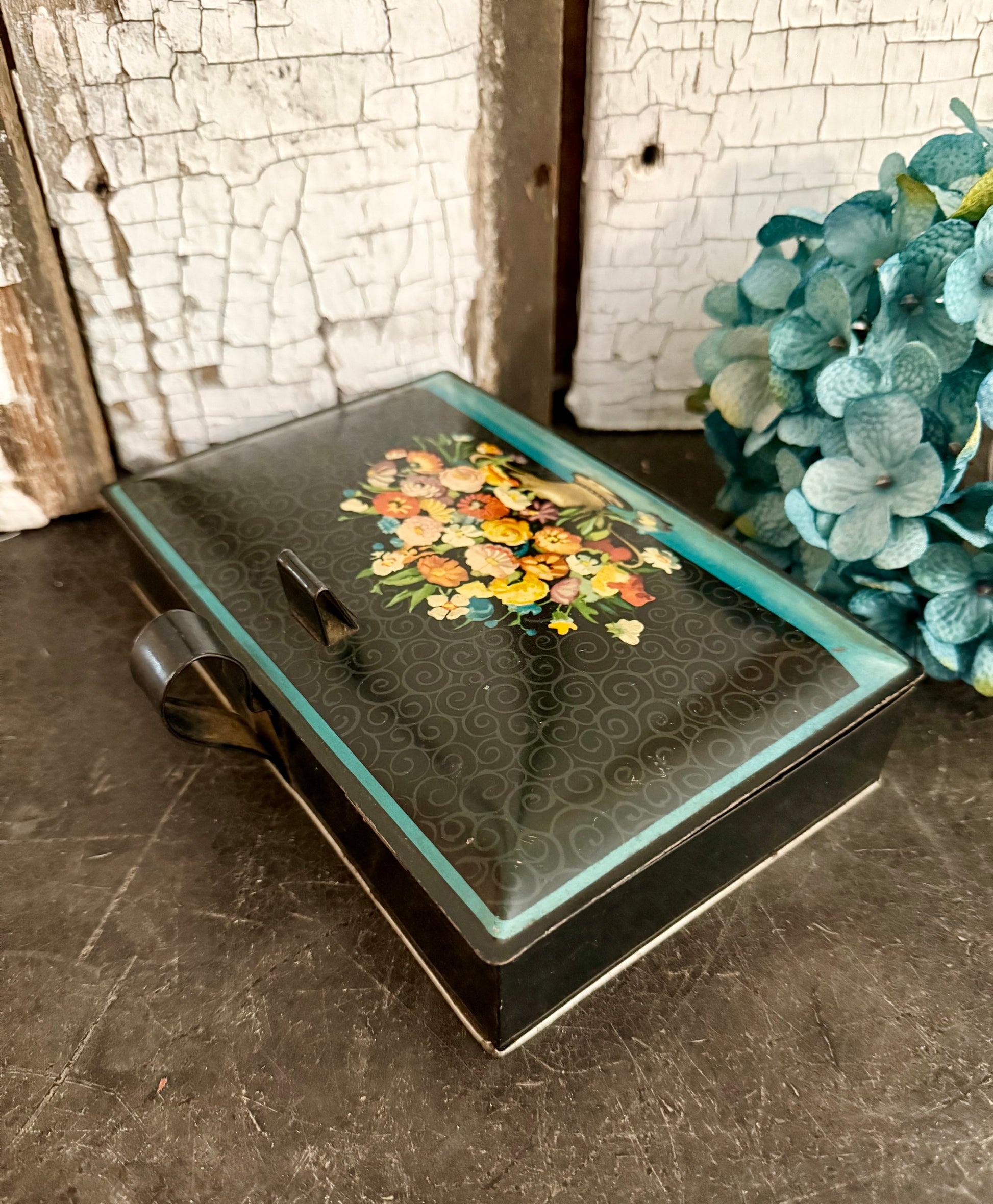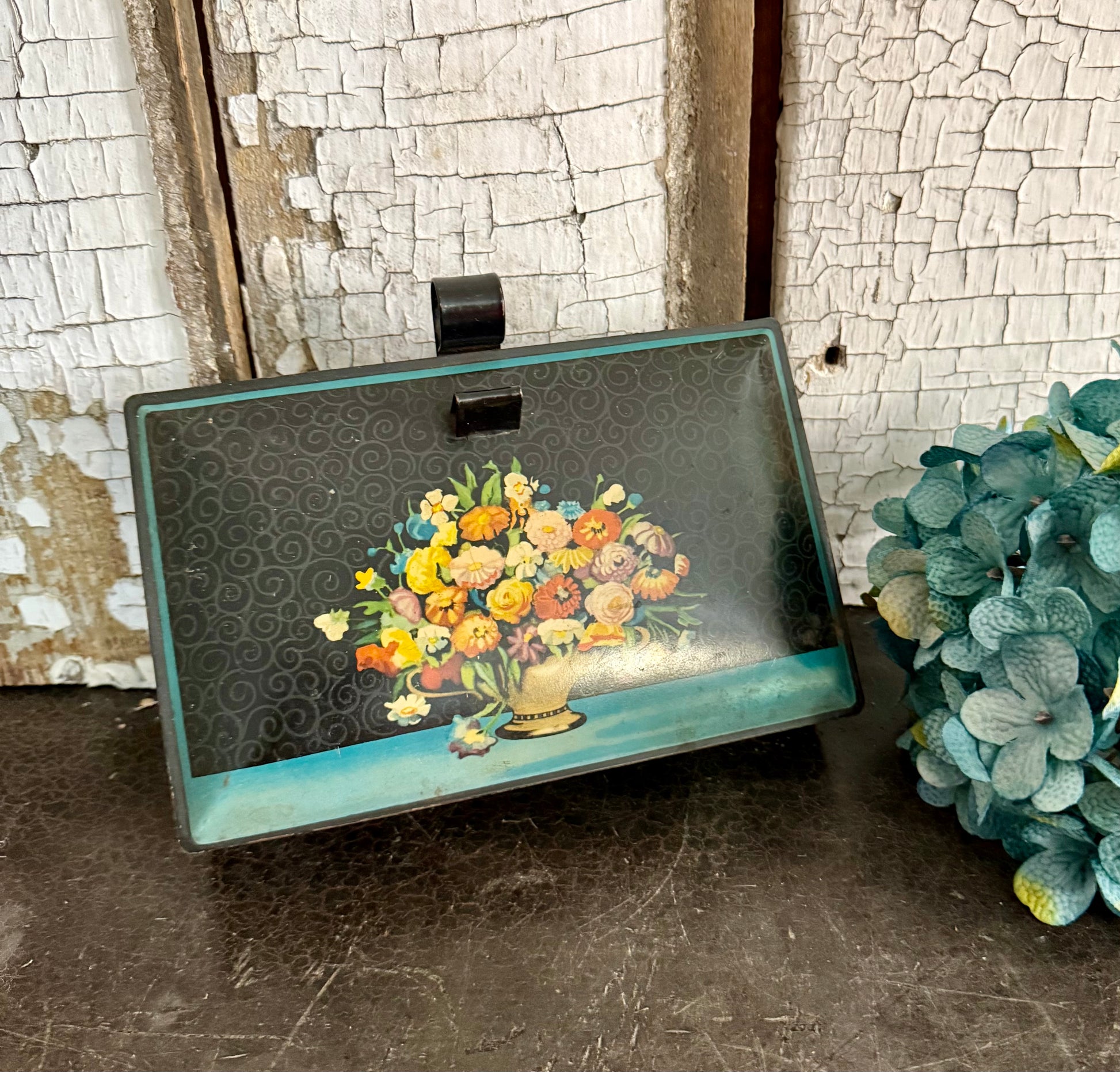 Vintage Decoware tin silent butler. Black background with floral design and teal trim. Some wear due to age but overall in great vintage condition. 5"x 8"x 1 1/2". A great kitchen decor item or impress your guests with this fancy cleaning accessory at your next dinner party!