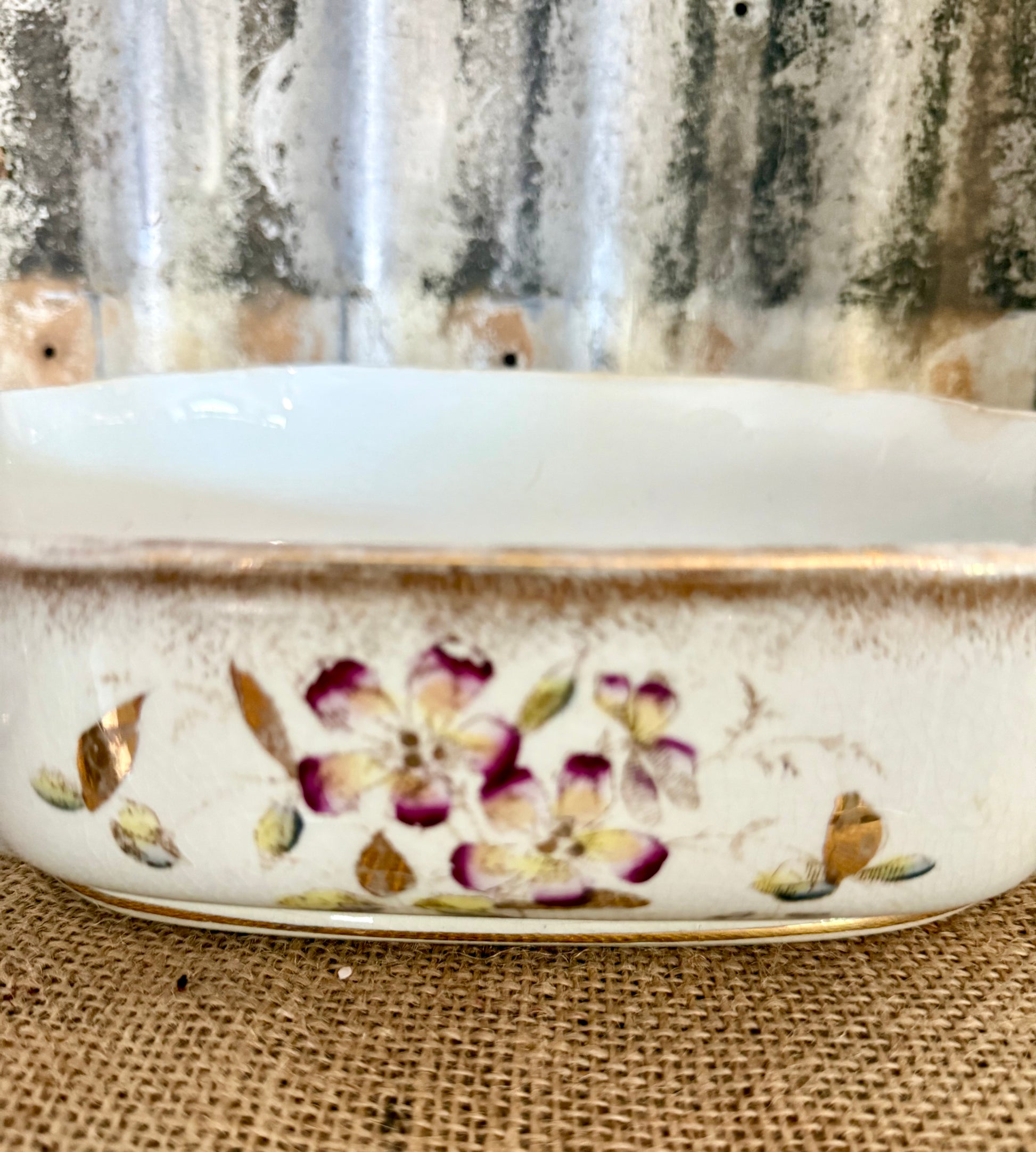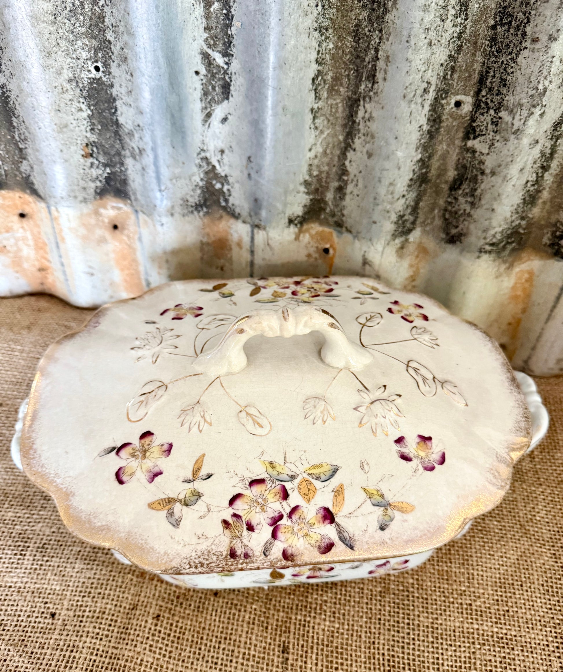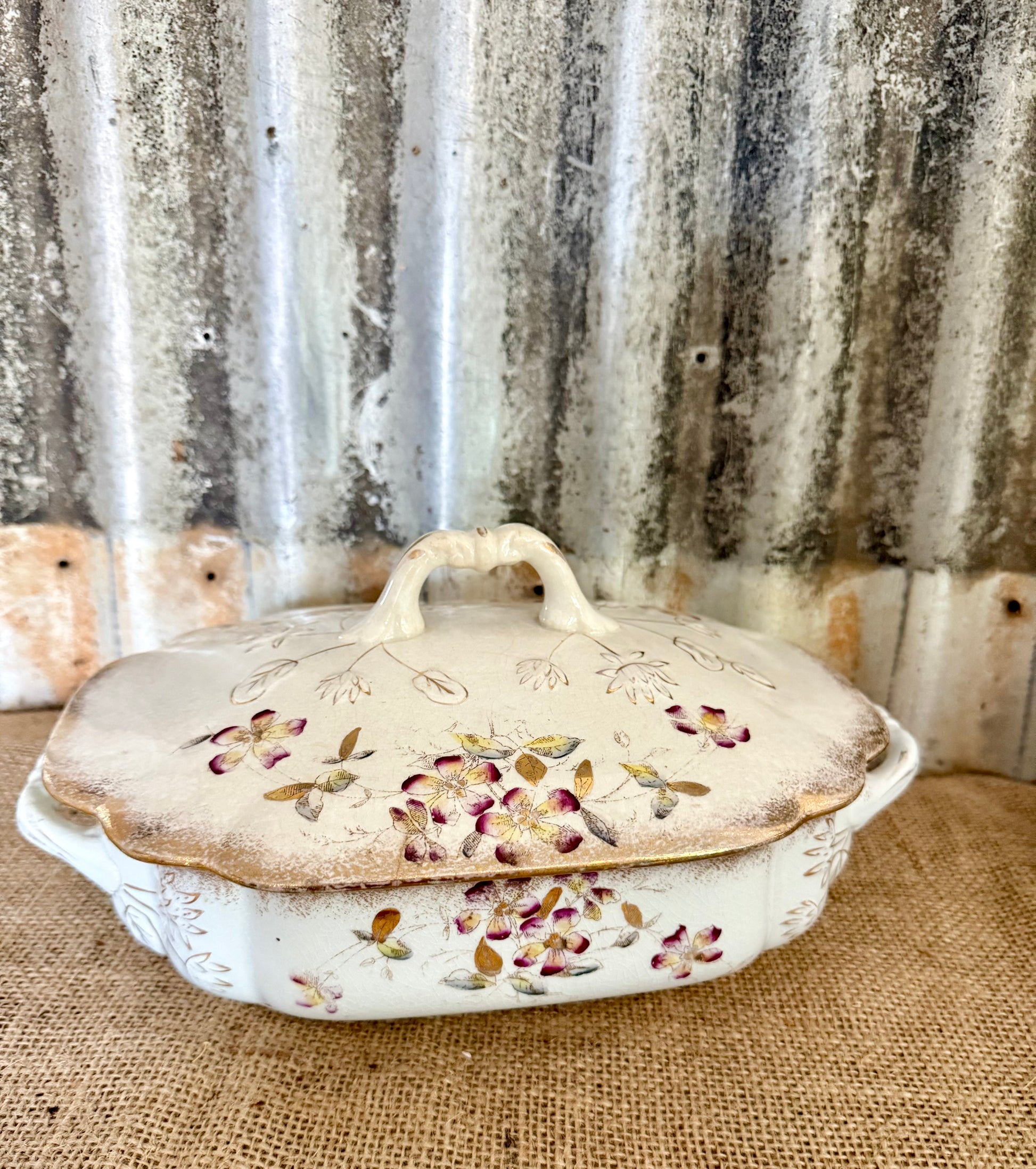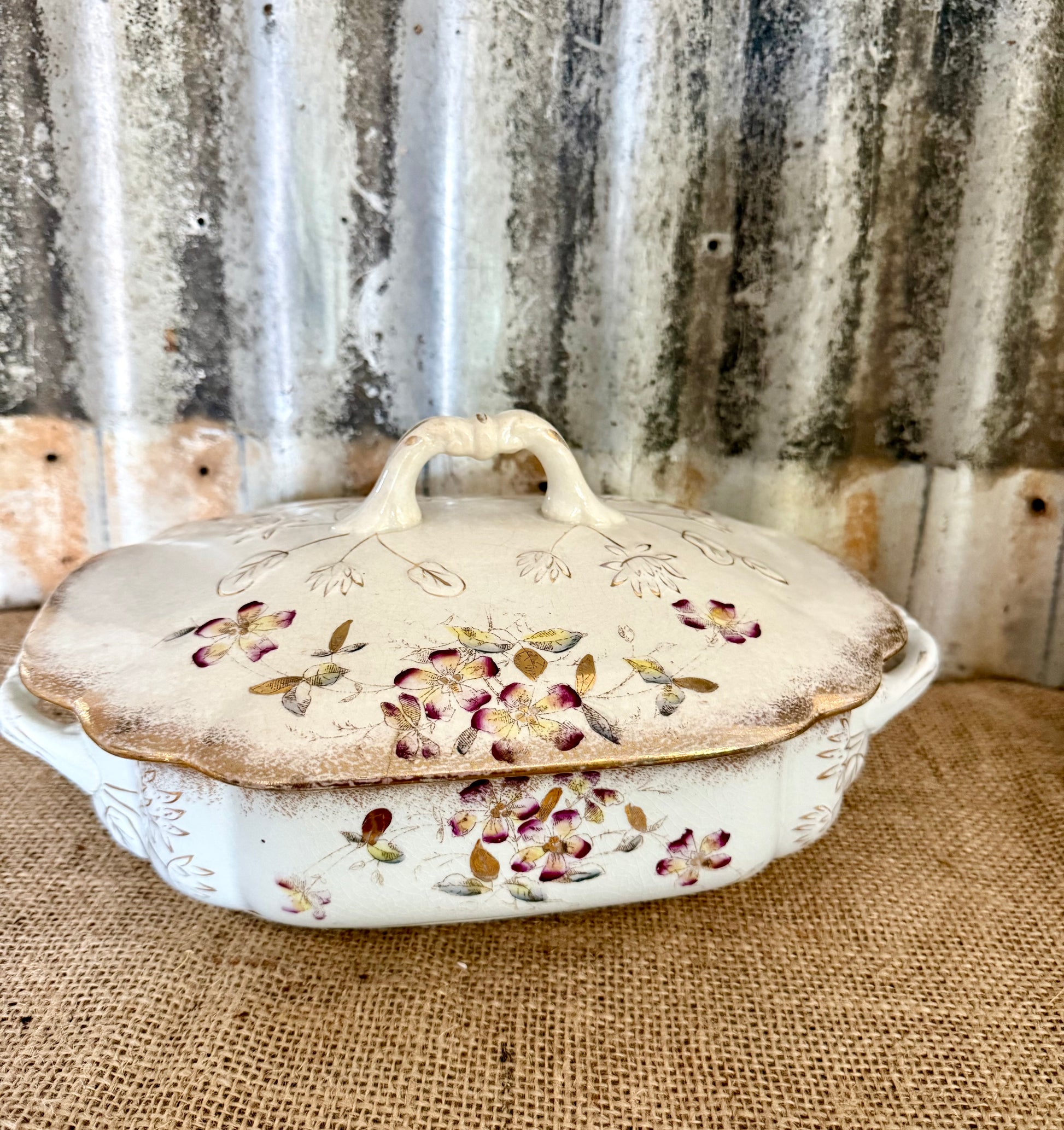 Beautiful floral Dresden covered casserole dish. Wine, yellow, and green flowers with gold accents. 11 1/2" handle to spout, 7 1/2" wide and 6" tall. There is a small hairline on the lid but it is stable. A wonderfully old piece!