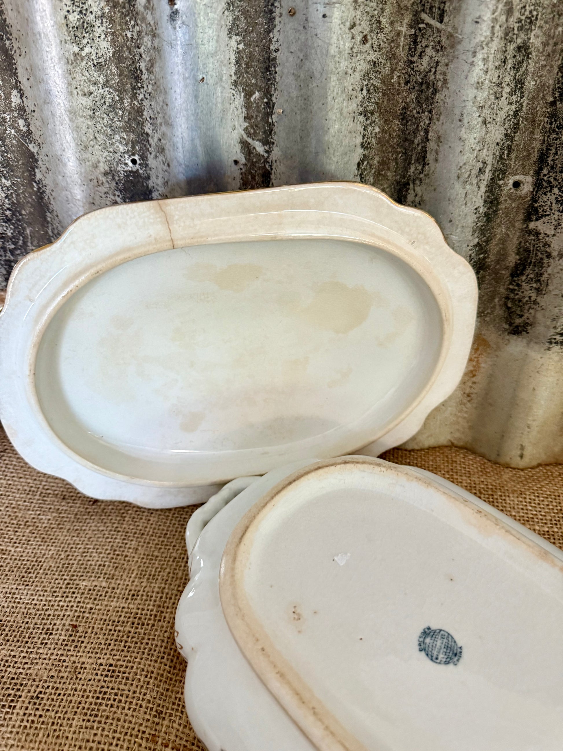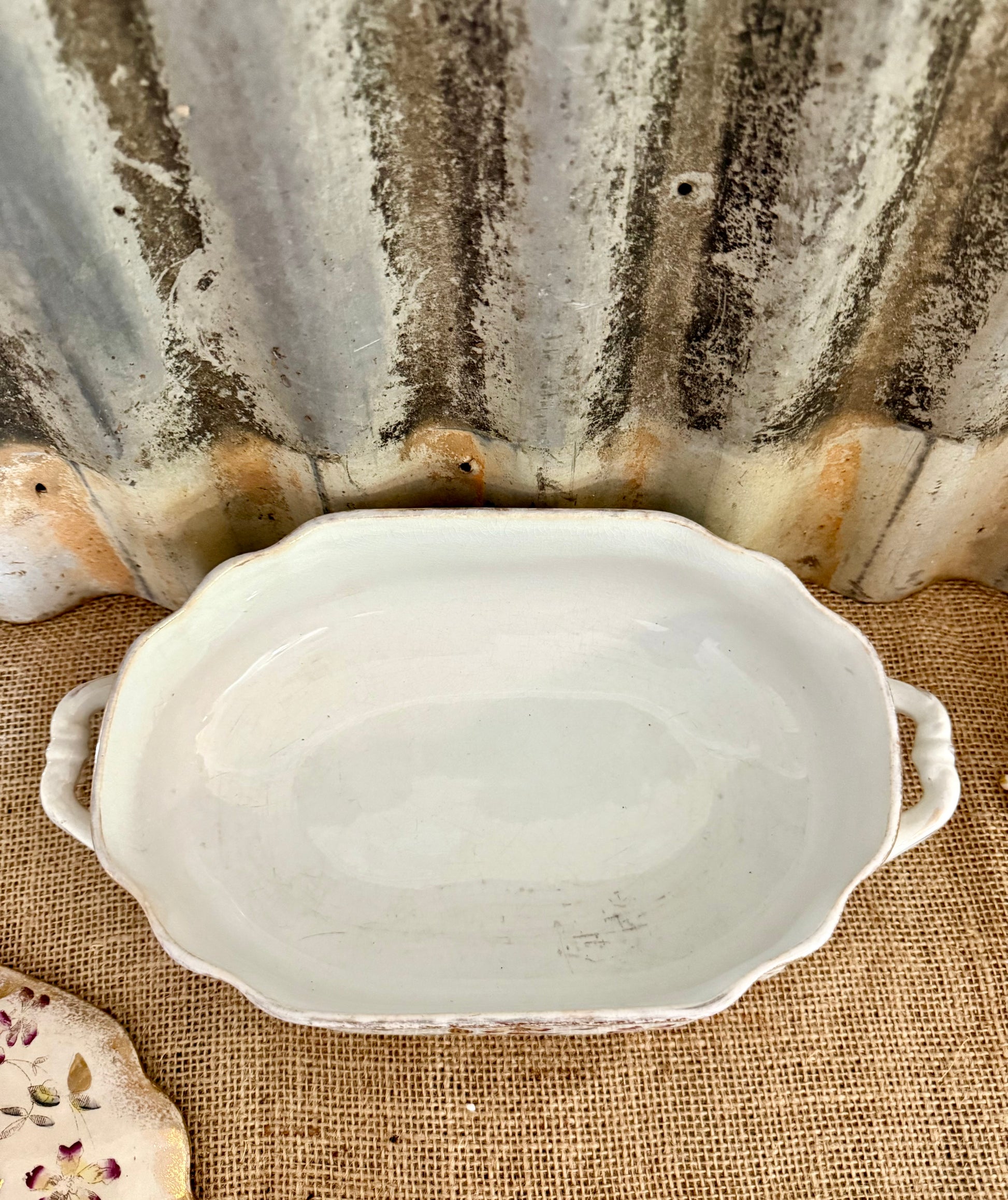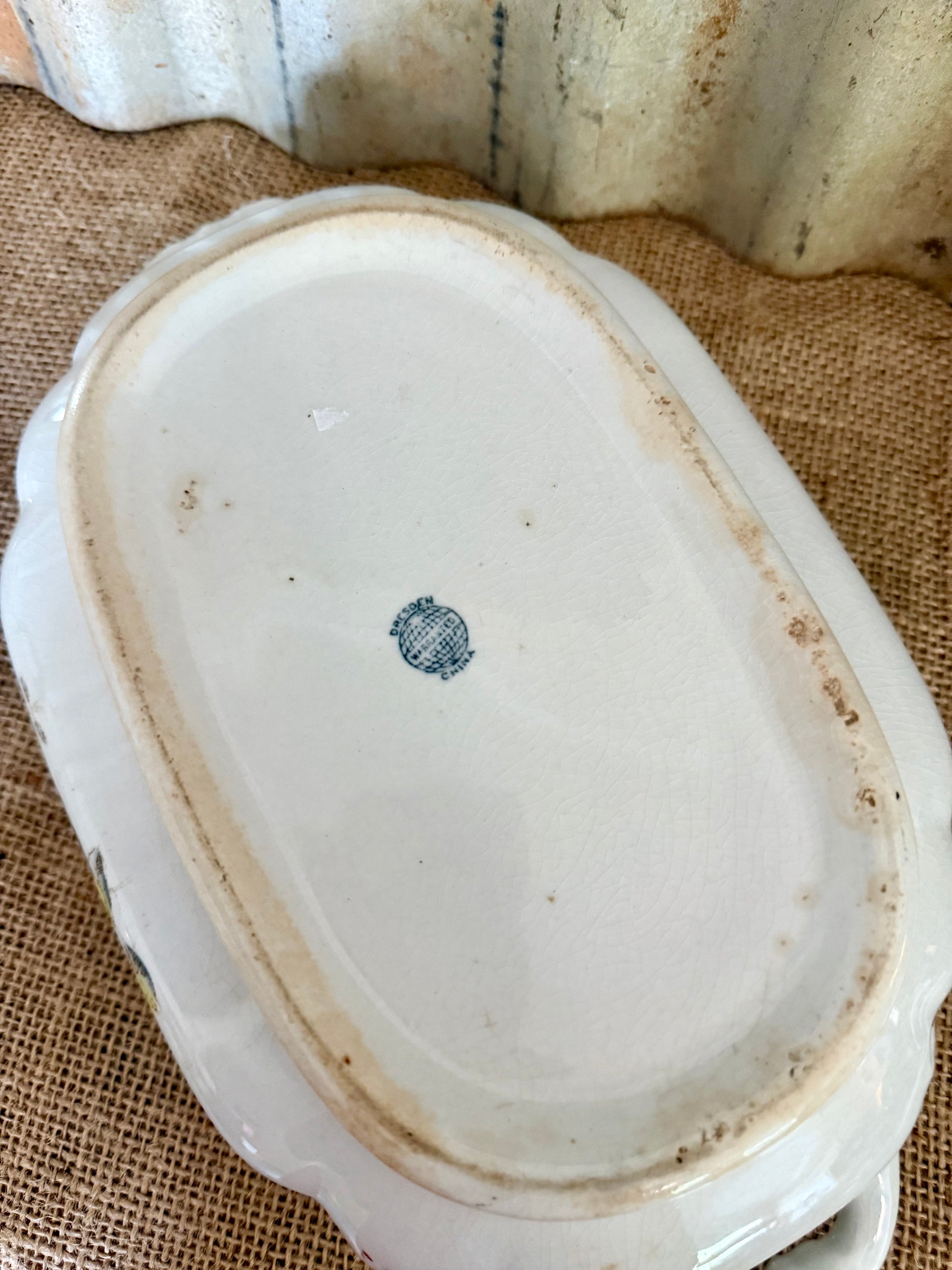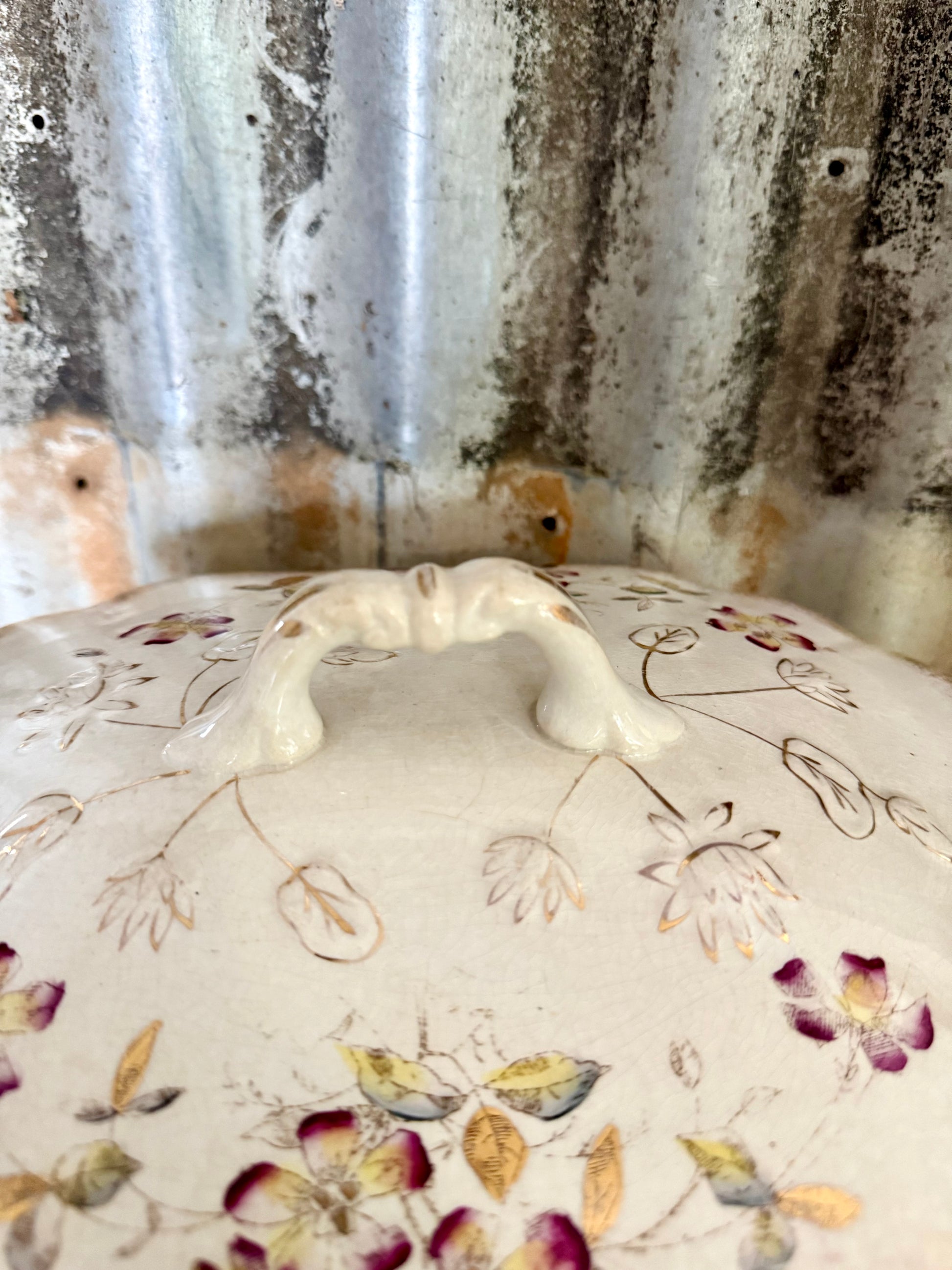 Beautiful floral Dresden covered casserole dish. Wine, yellow, and green flowers with gold accents. 11 1/2" handle to spout, 7 1/2" wide and 6" tall. There is a small hairline on the lid but it is stable. A wonderfully old piece!