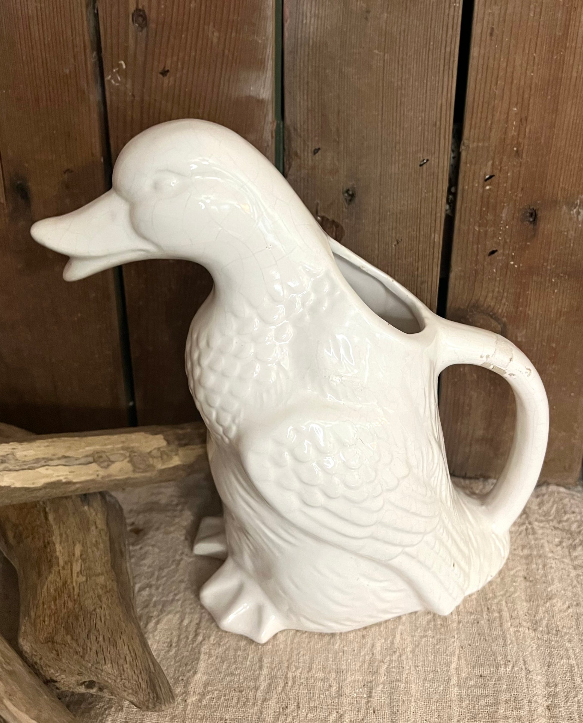 Vintage white ceramic duck pitcher. Beautiful feather detail with the bill as the spout. 10" tall, 9" wide. Crazing throughout.