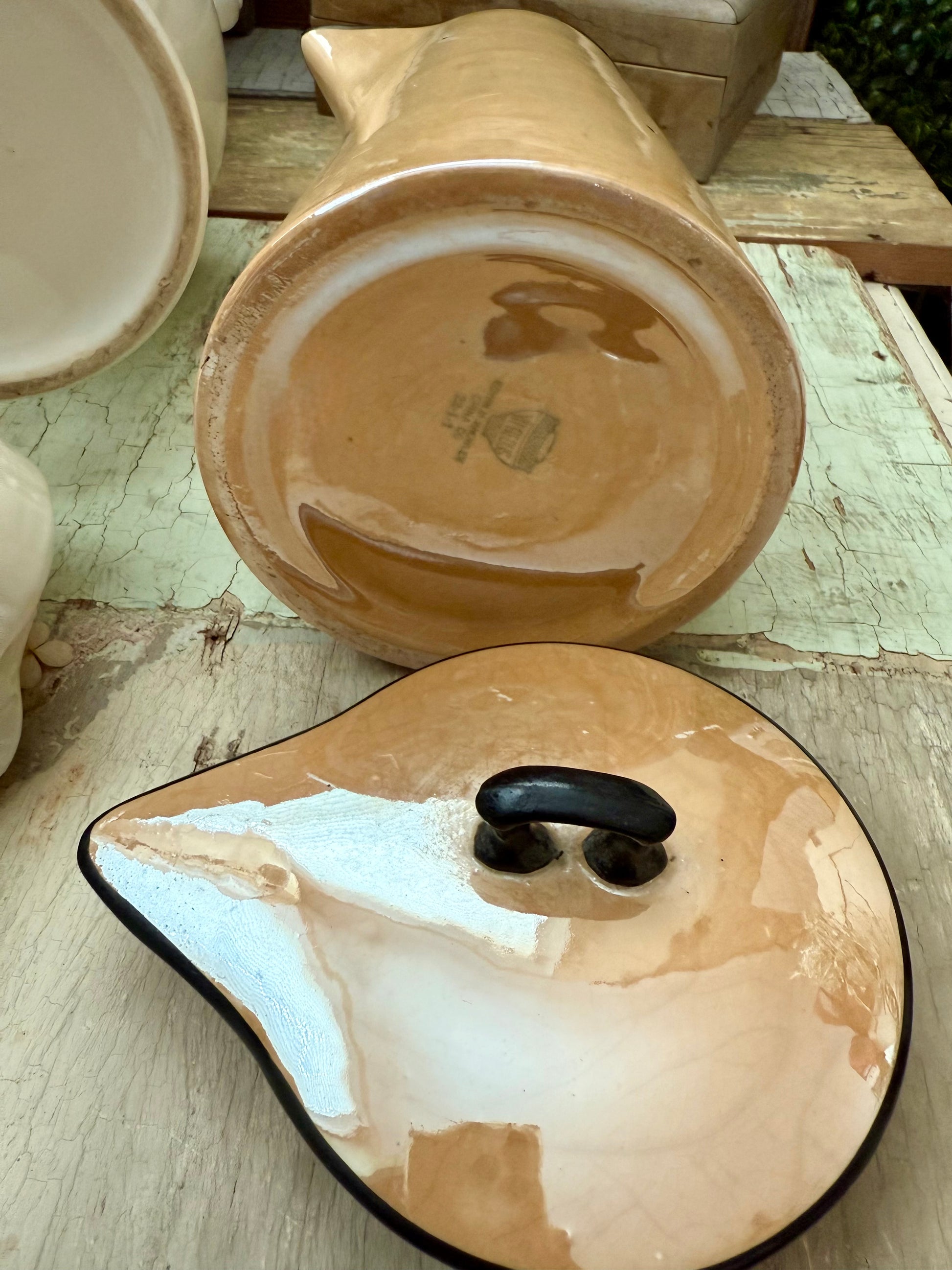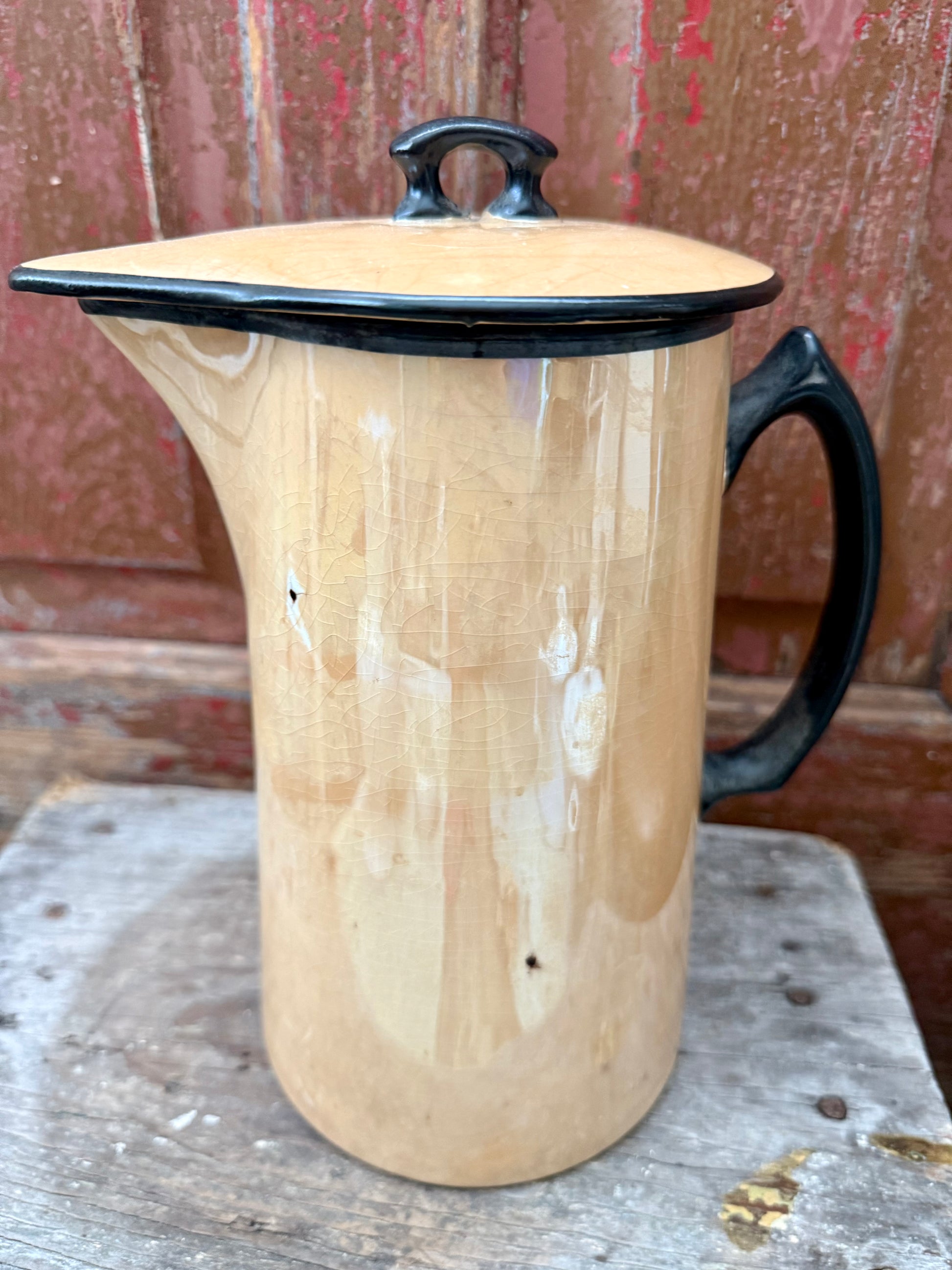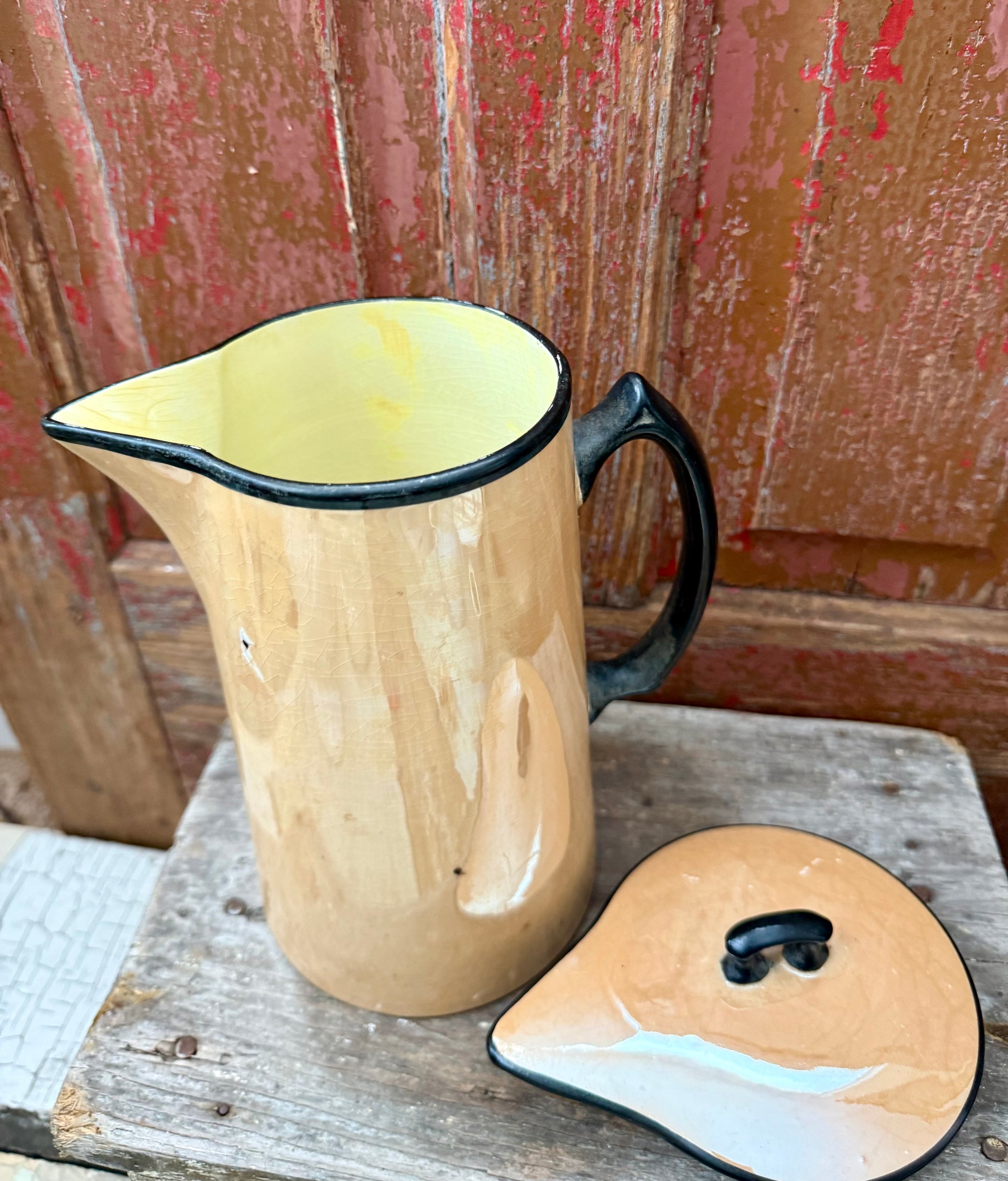 Edwin M. Knowles yellow & black lidded pitcher. Lusterware with crazing throughout.