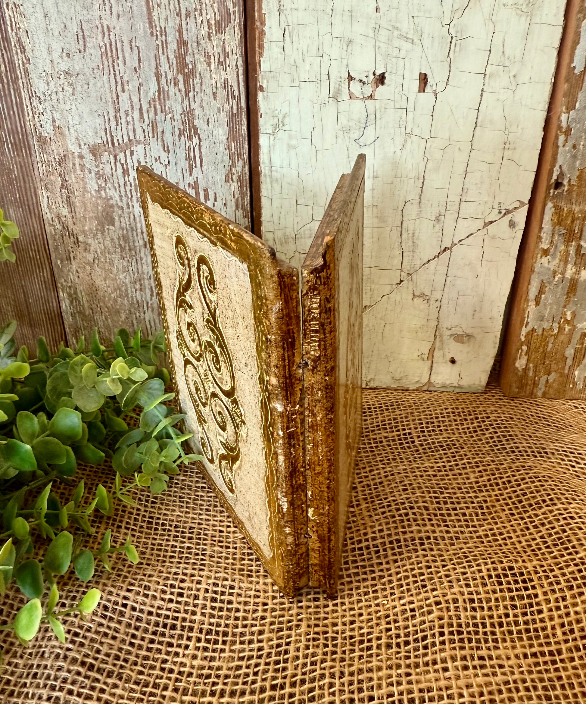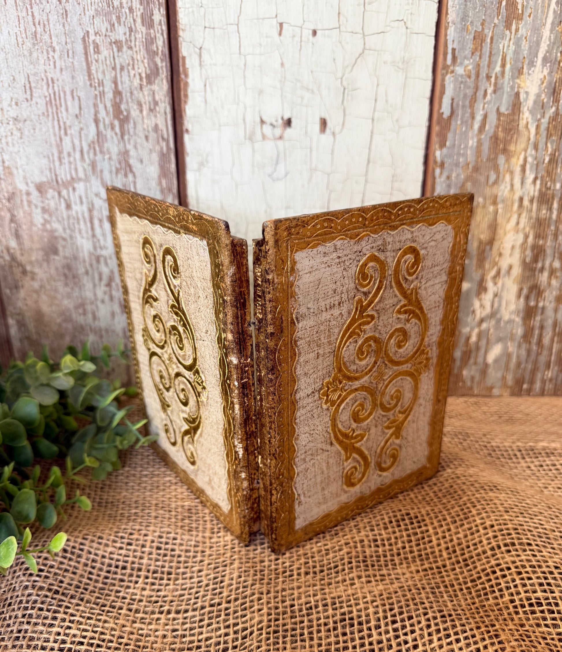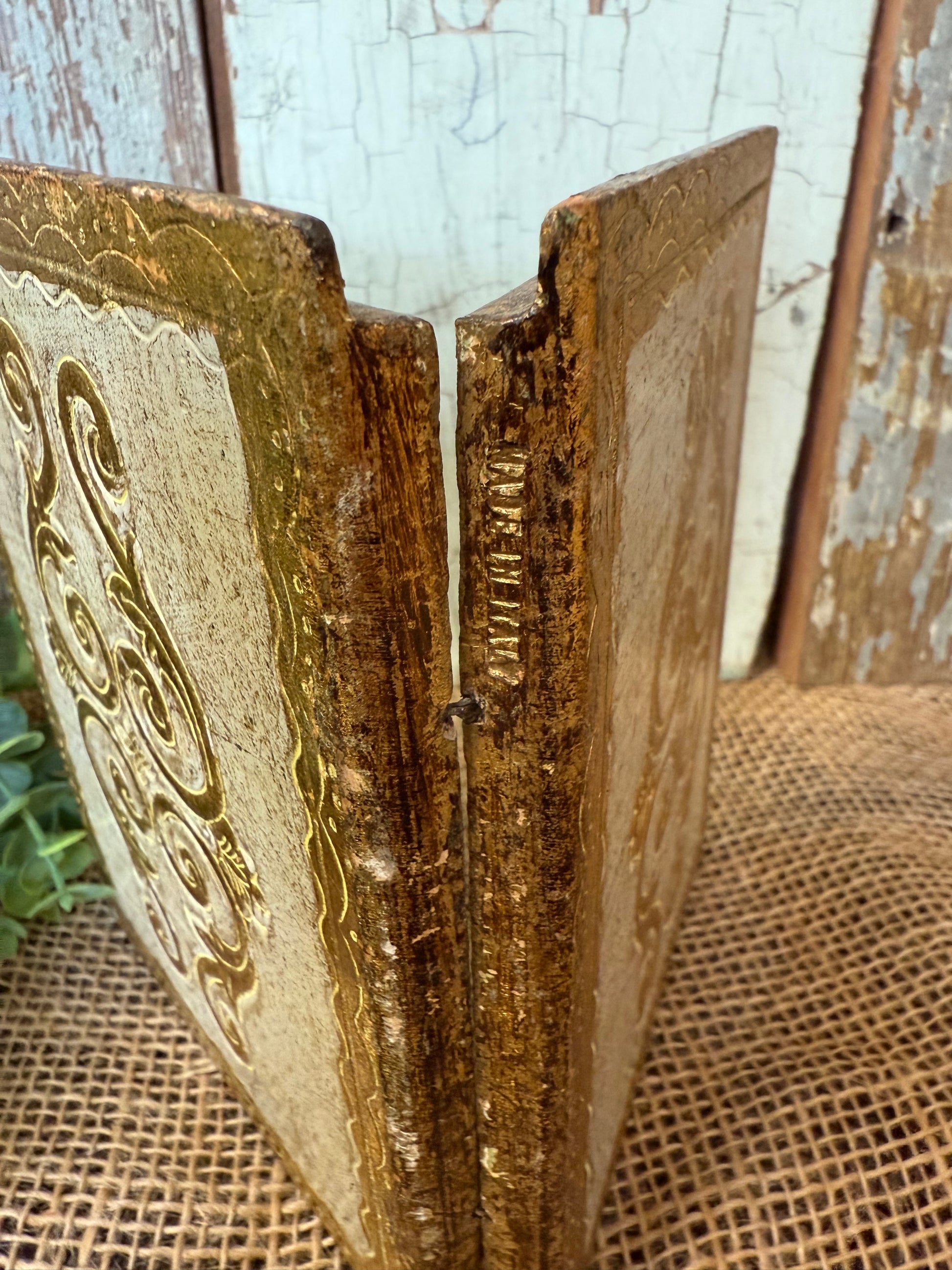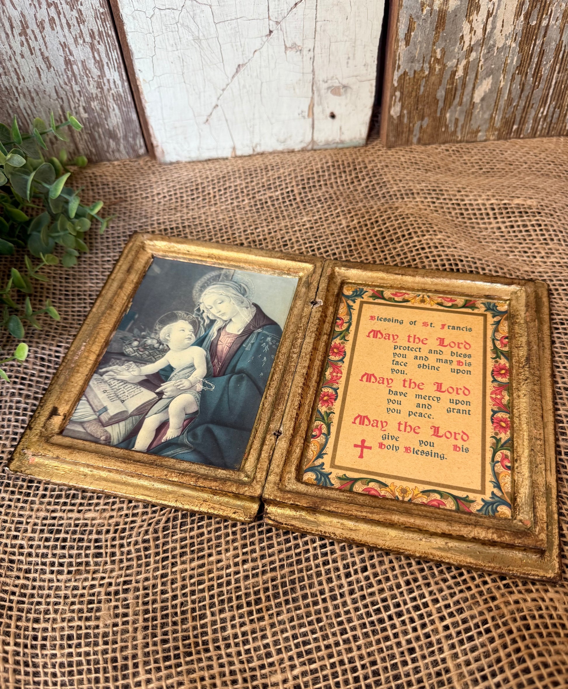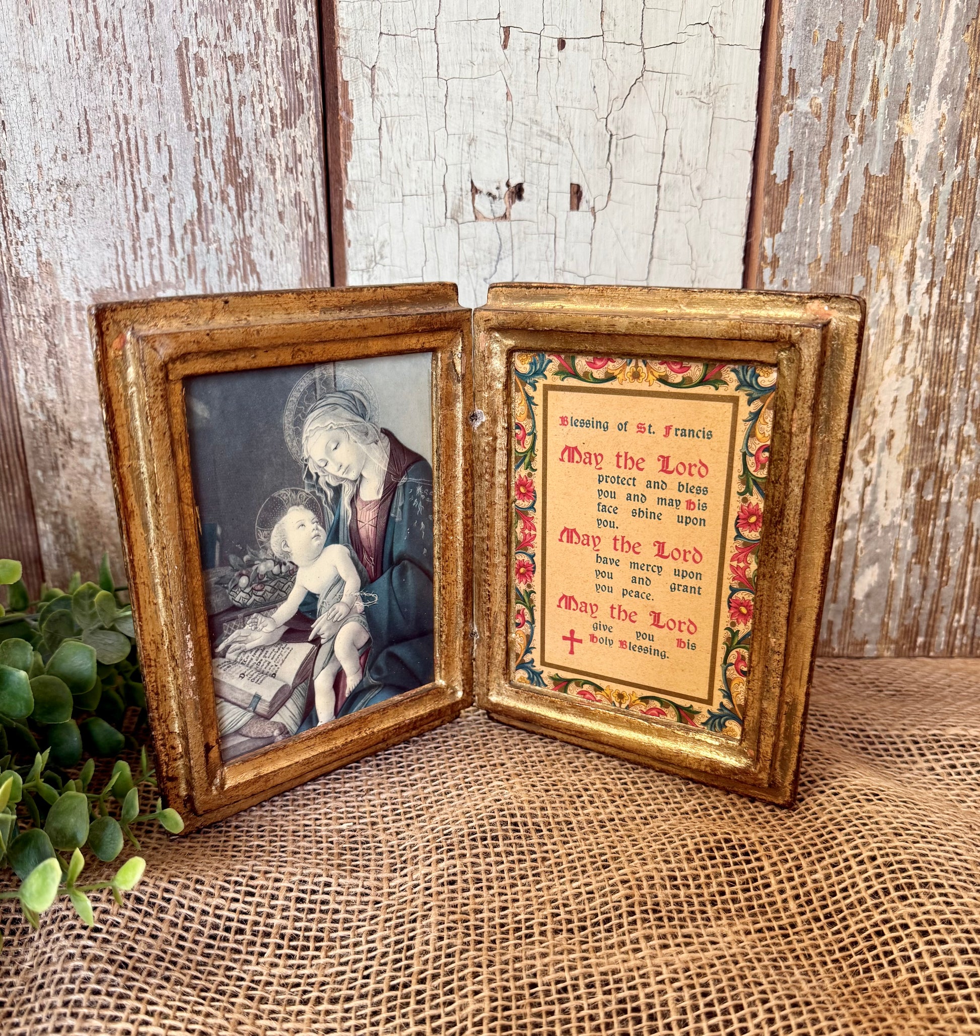 Beautiful depiction of the Madonna and child and the Blessing of St. Francis in a double Florentine hinged frame. The picture and the Blessing are both 6 1/2" x 5". In great vintage condition!