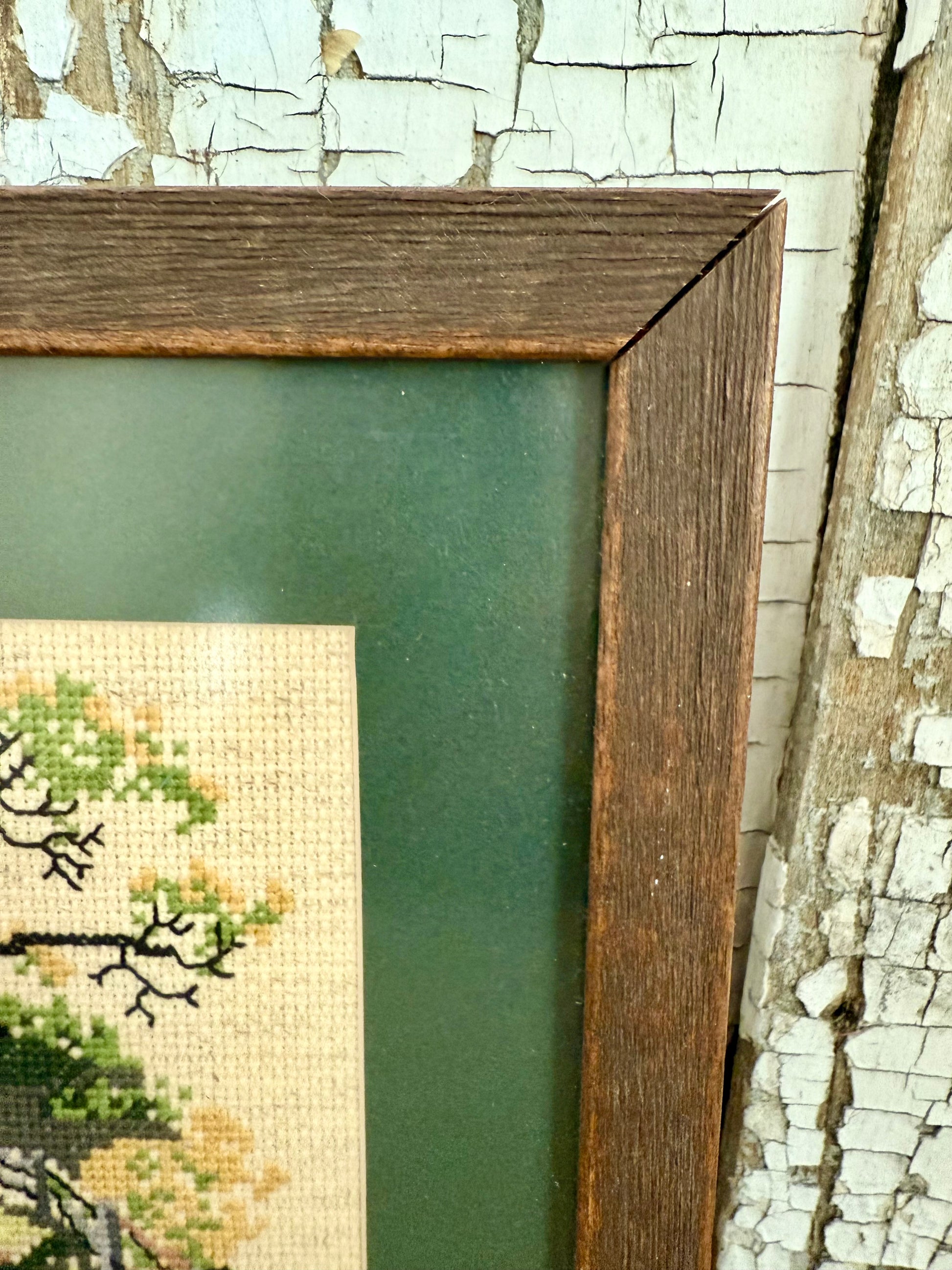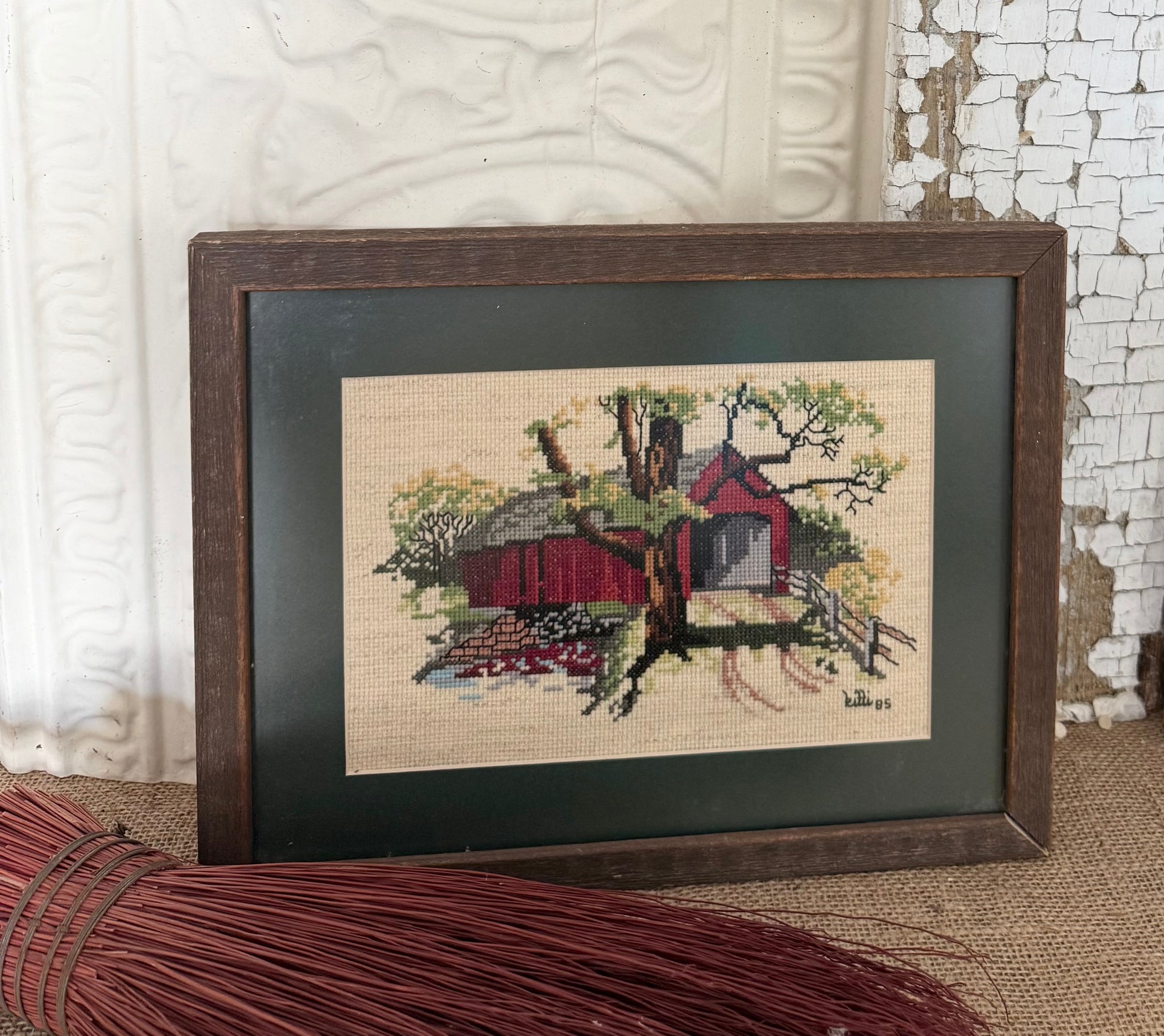 Barn Cross Stitch picture with Hunter green mat and wooden frame