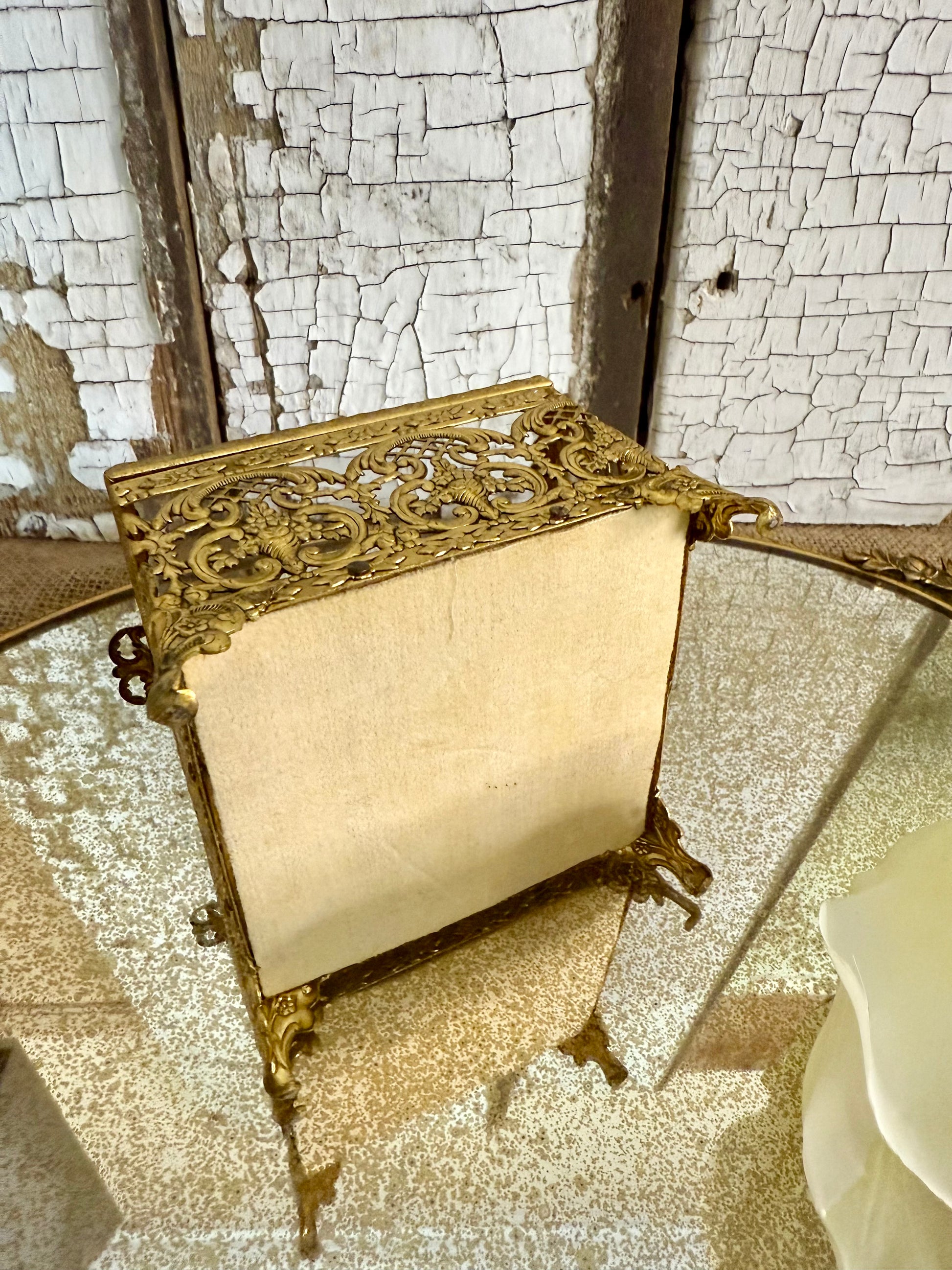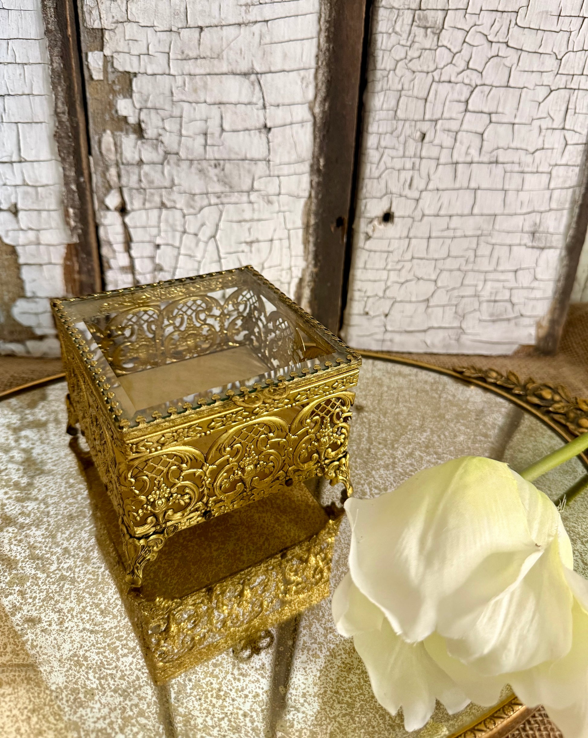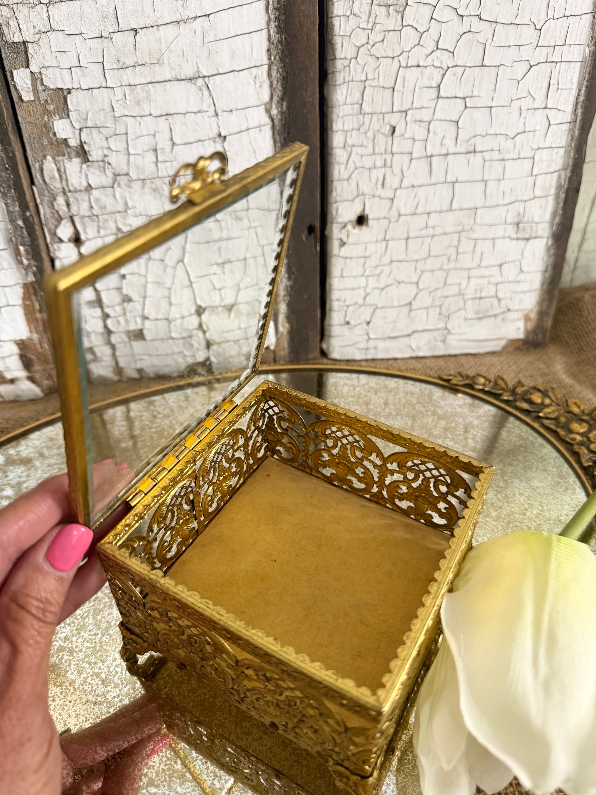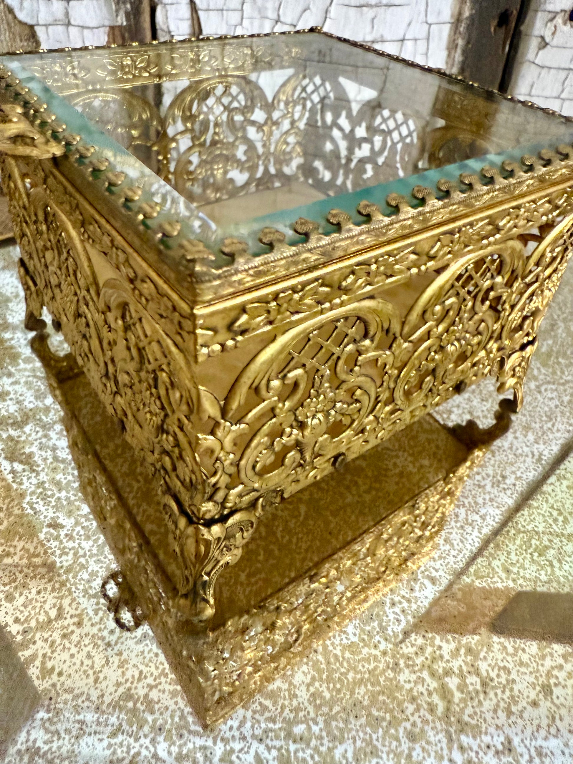 Absolutely gorgeous footed gold filigree jewelry casket. 4"x4"x 3 1/4" with velvet interior and beautiful ornate detail. In exceptional condition.