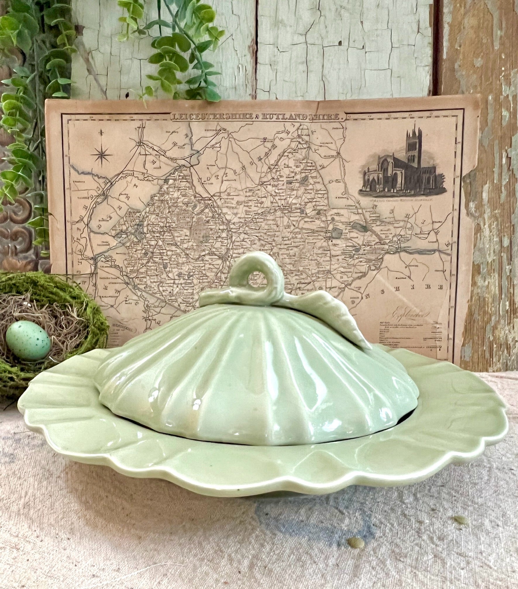 Lynn Hollyn green covered dish. 12" diameter 6" tall. Beautiful fluted detail on edges and leaf and branch finial. Made in Portugal.