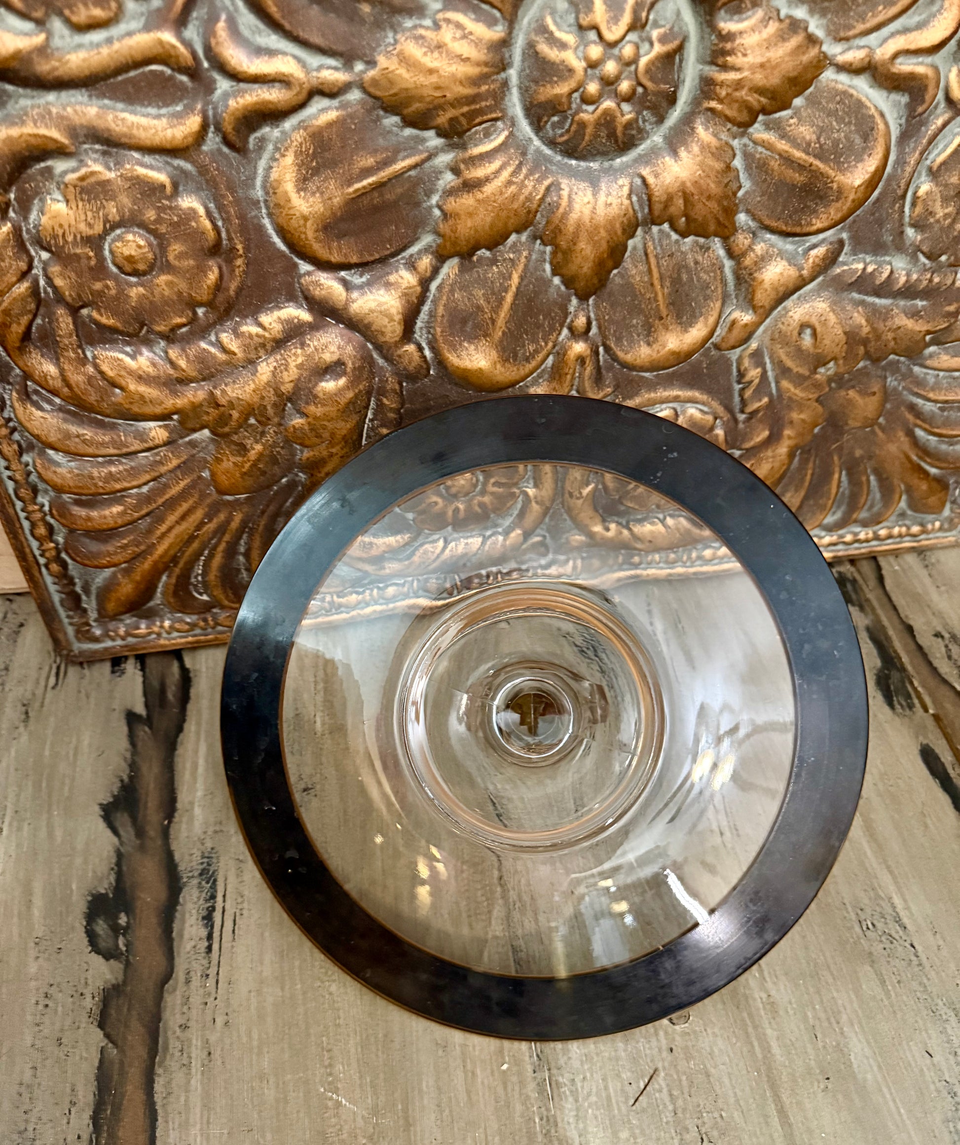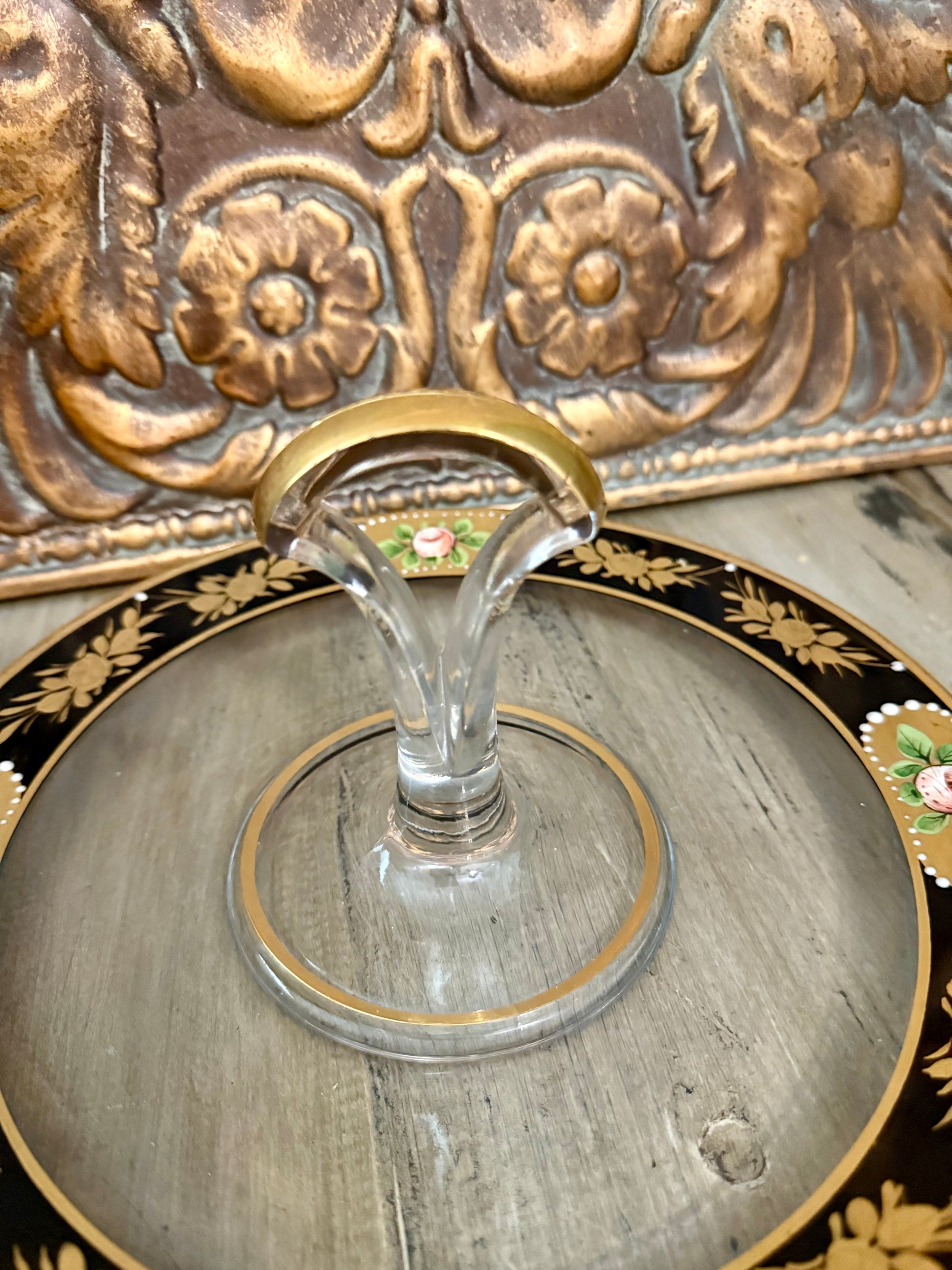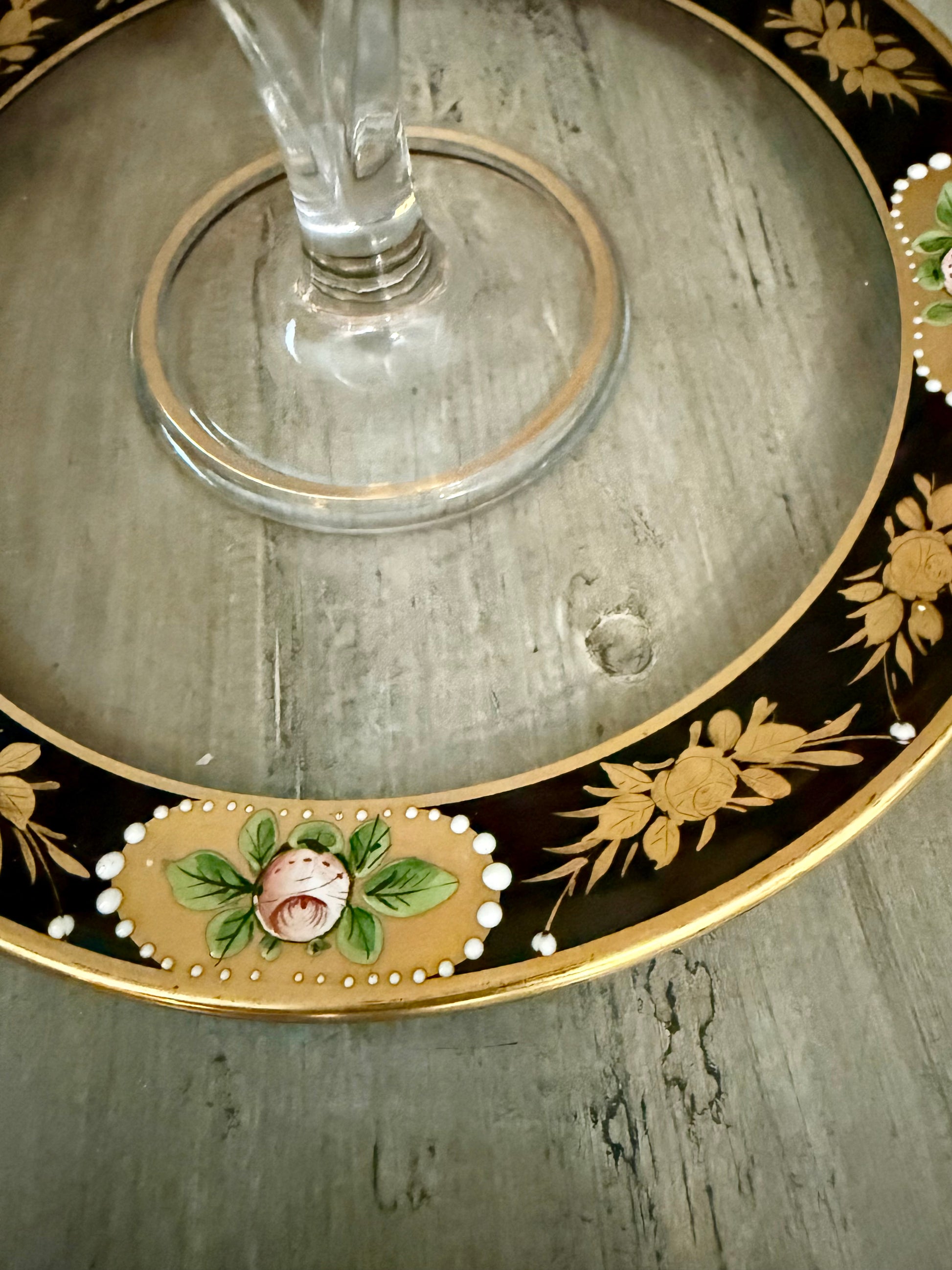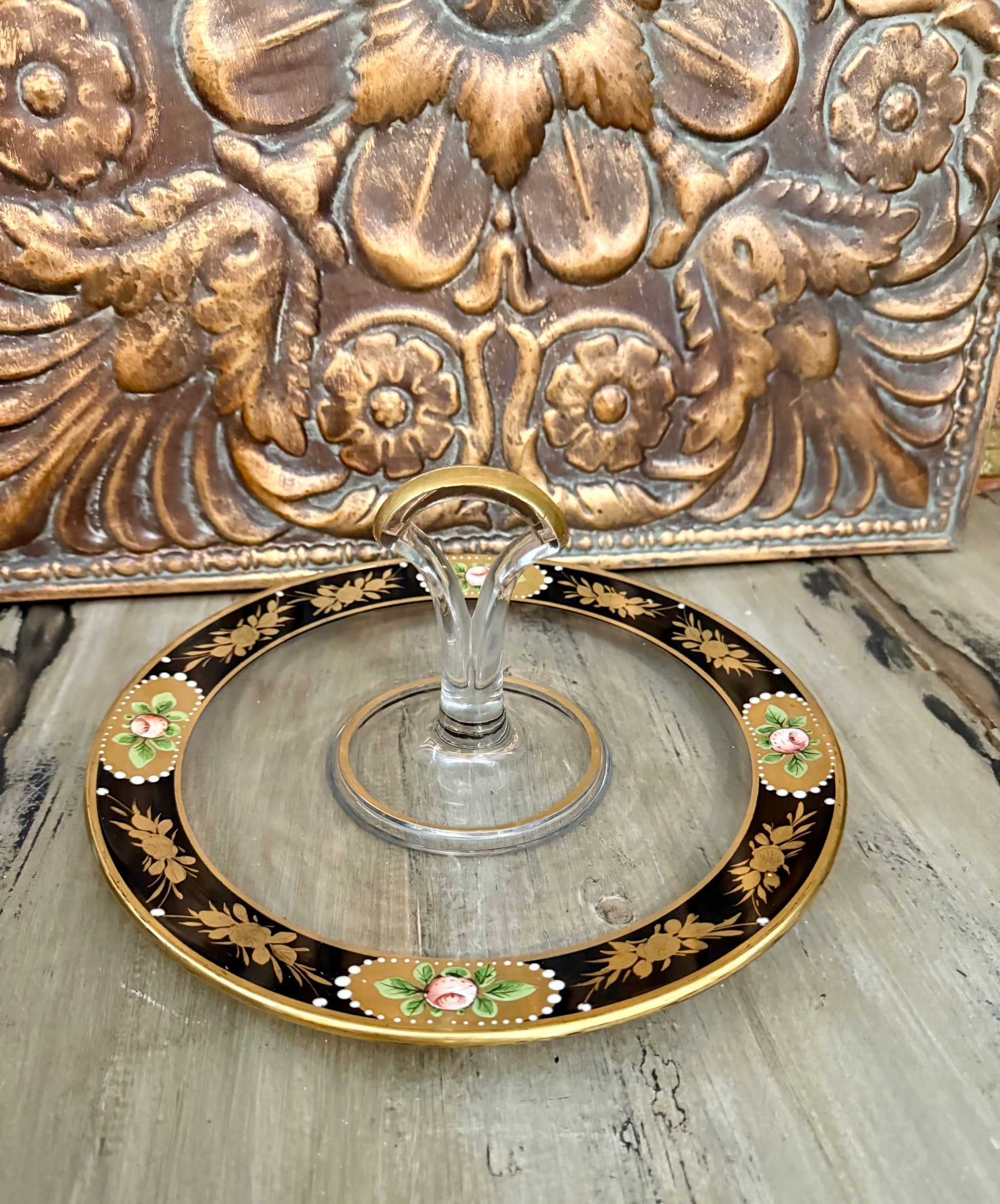 1930's handpainted glass hors d'oeuvre/sandwich tray with handle and hand painted detail. Black and gold with raised floral designs. 10" diameter and 6" tall with handle. A beautiful piece for entertaining!