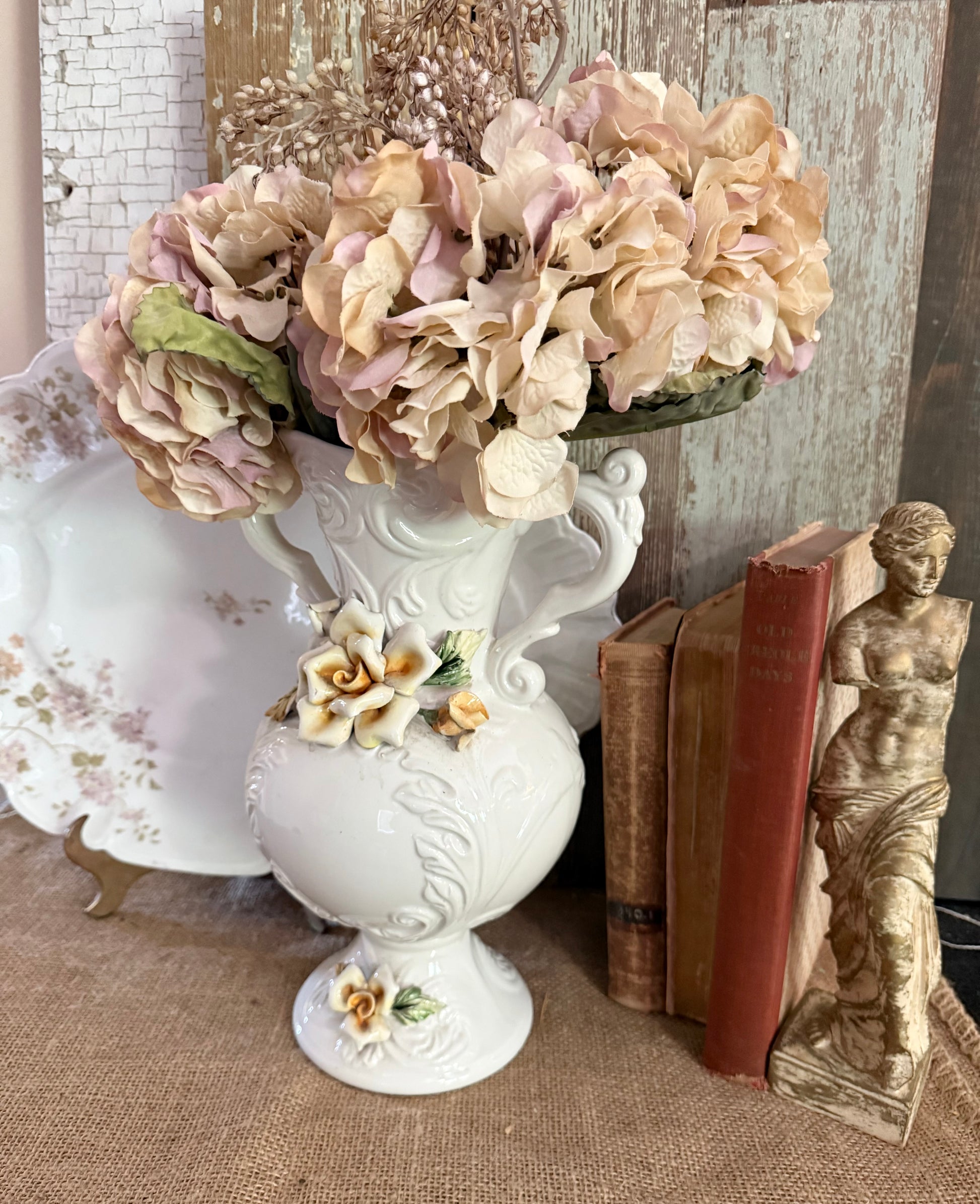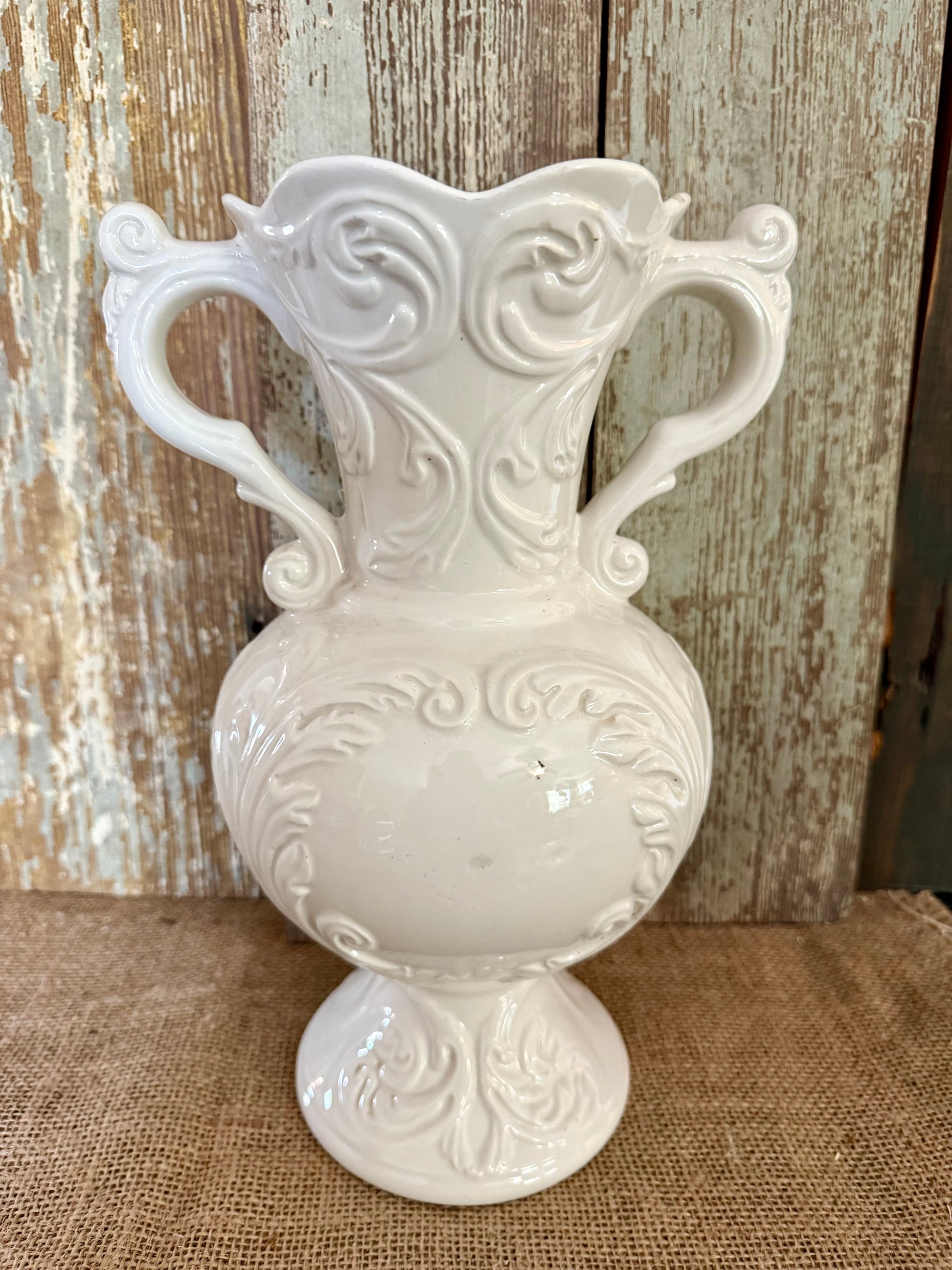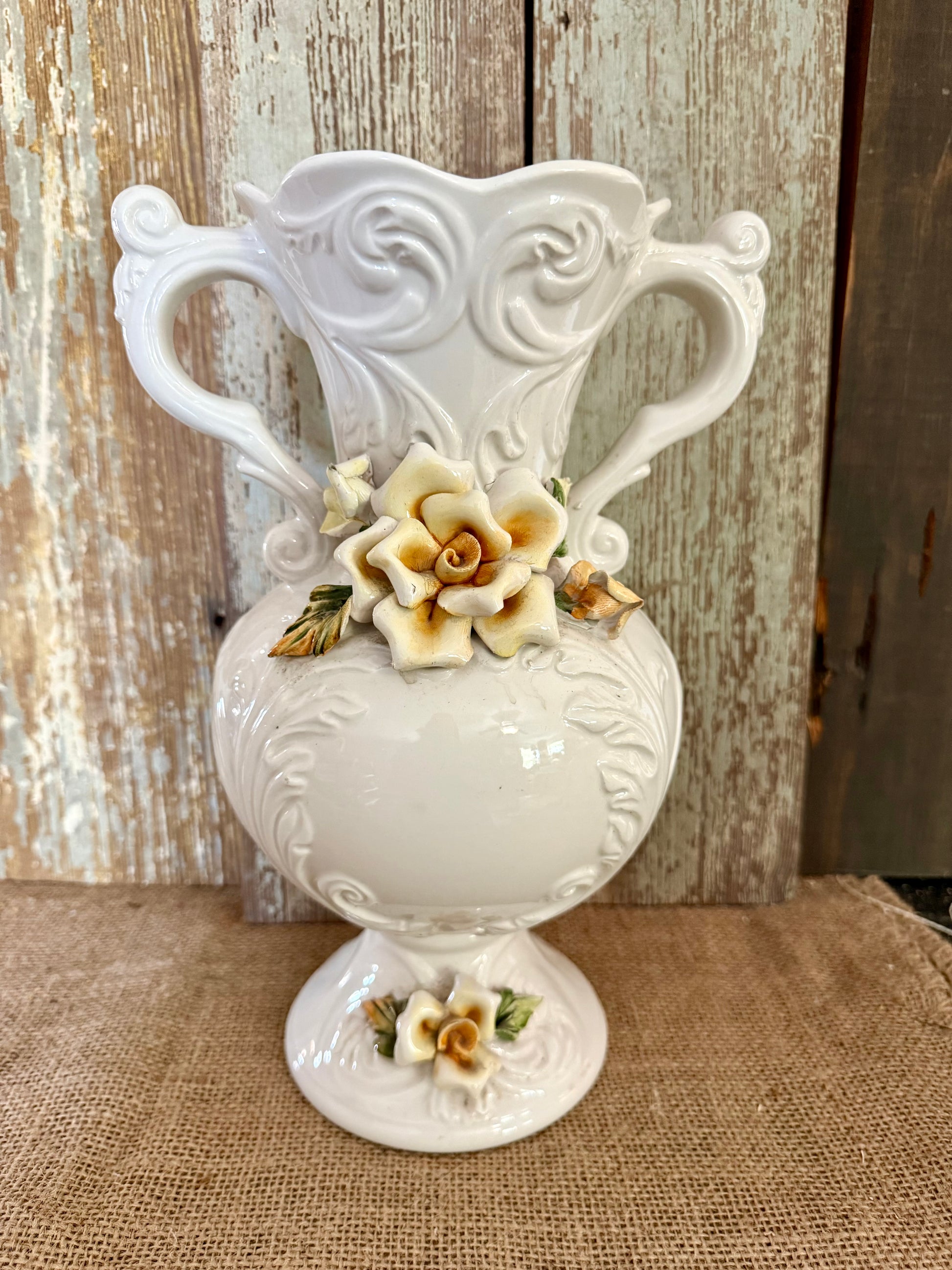 Norleans trophy style vase with double handles and three dimensional yellow rose detail. 12" tall, 8" handle to handle.