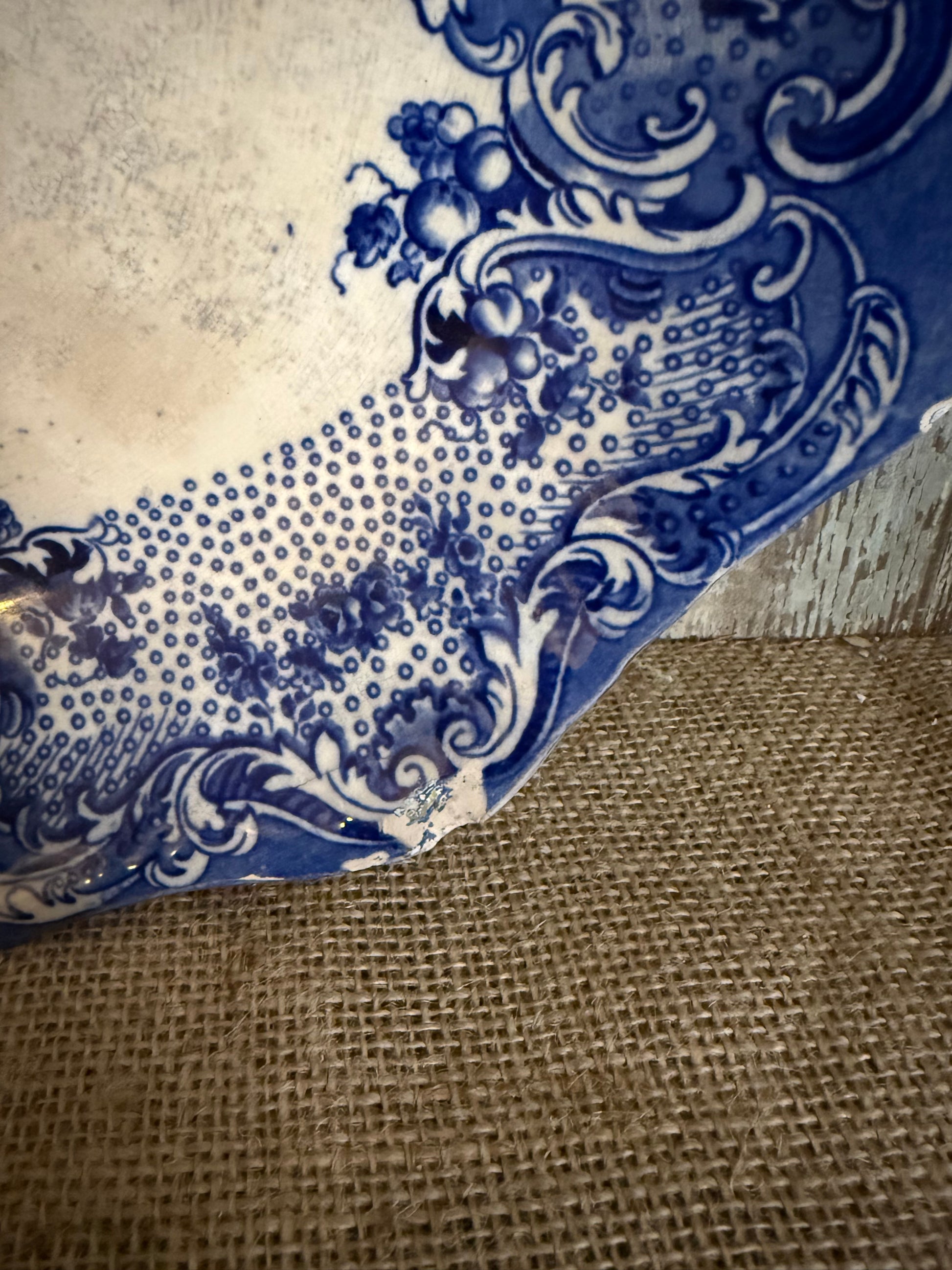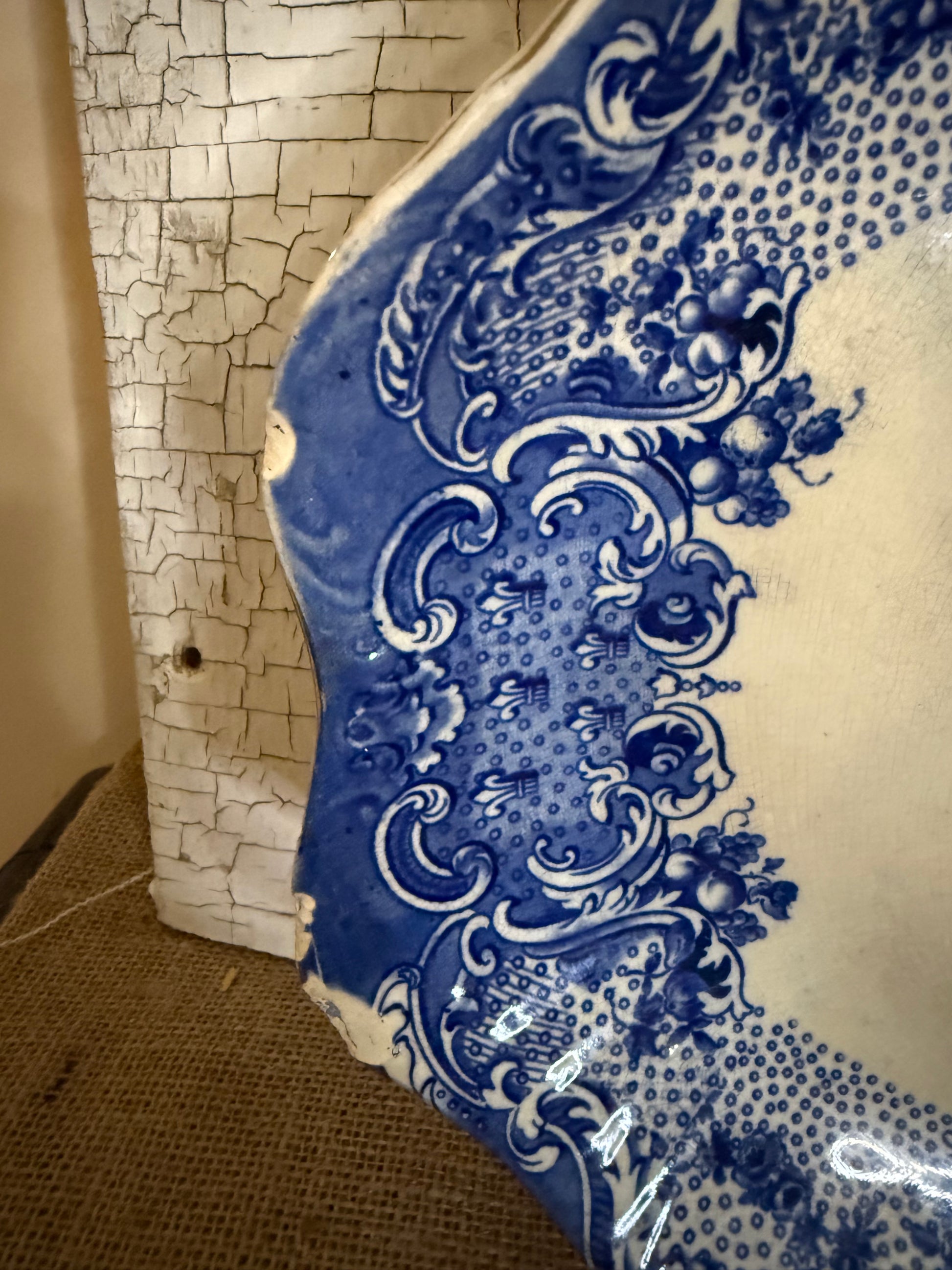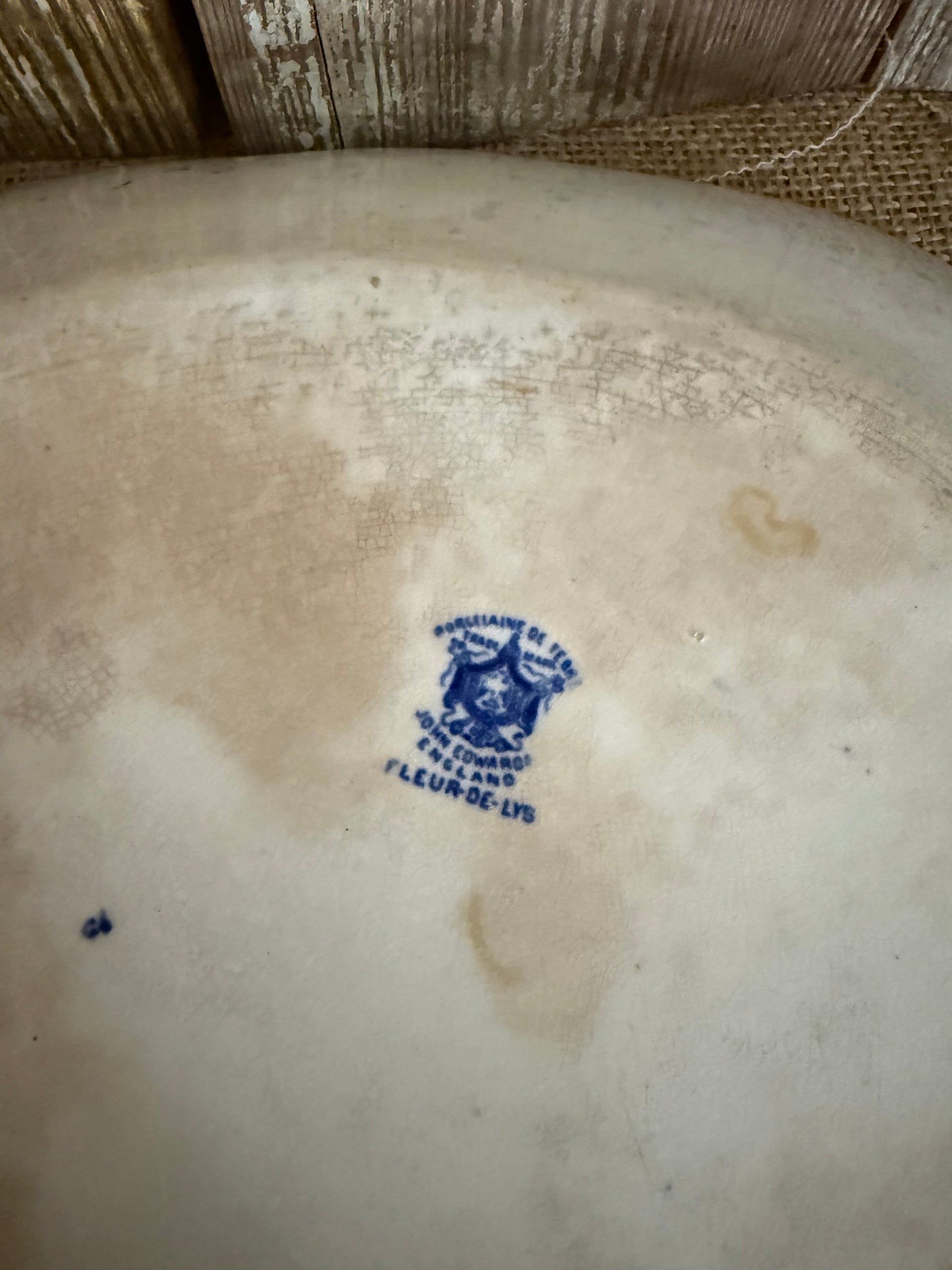 Antique John Edward blue Transferware platter from the 1800's. 12 1/2" x 15 3/4". This is a very old piece and it has quite a bit of staining and crazing. There are also several mature chips along the rim. Please look at pictures closely prior to purchase. Despite the disclaimers, it's a truly stunning platter!