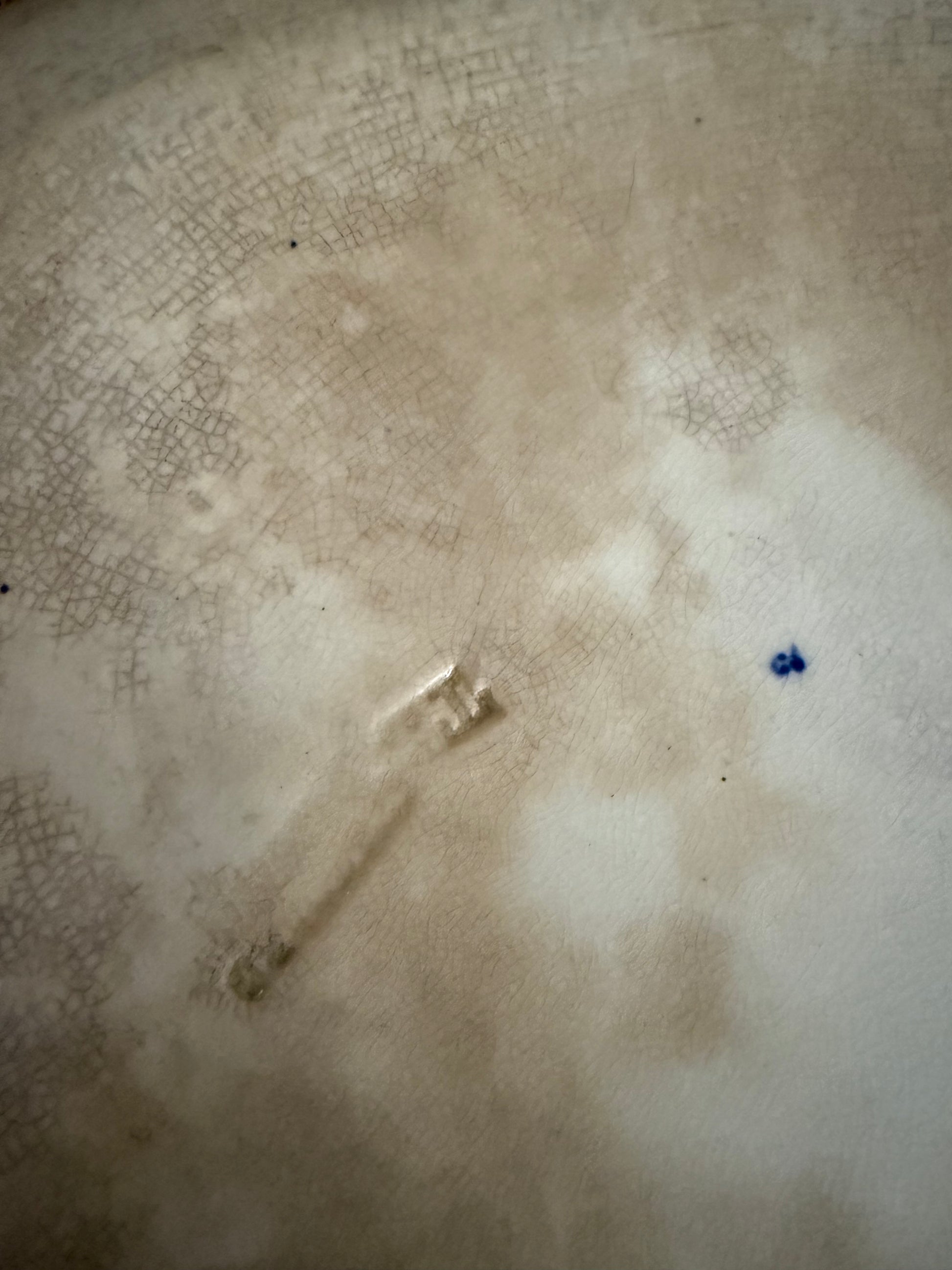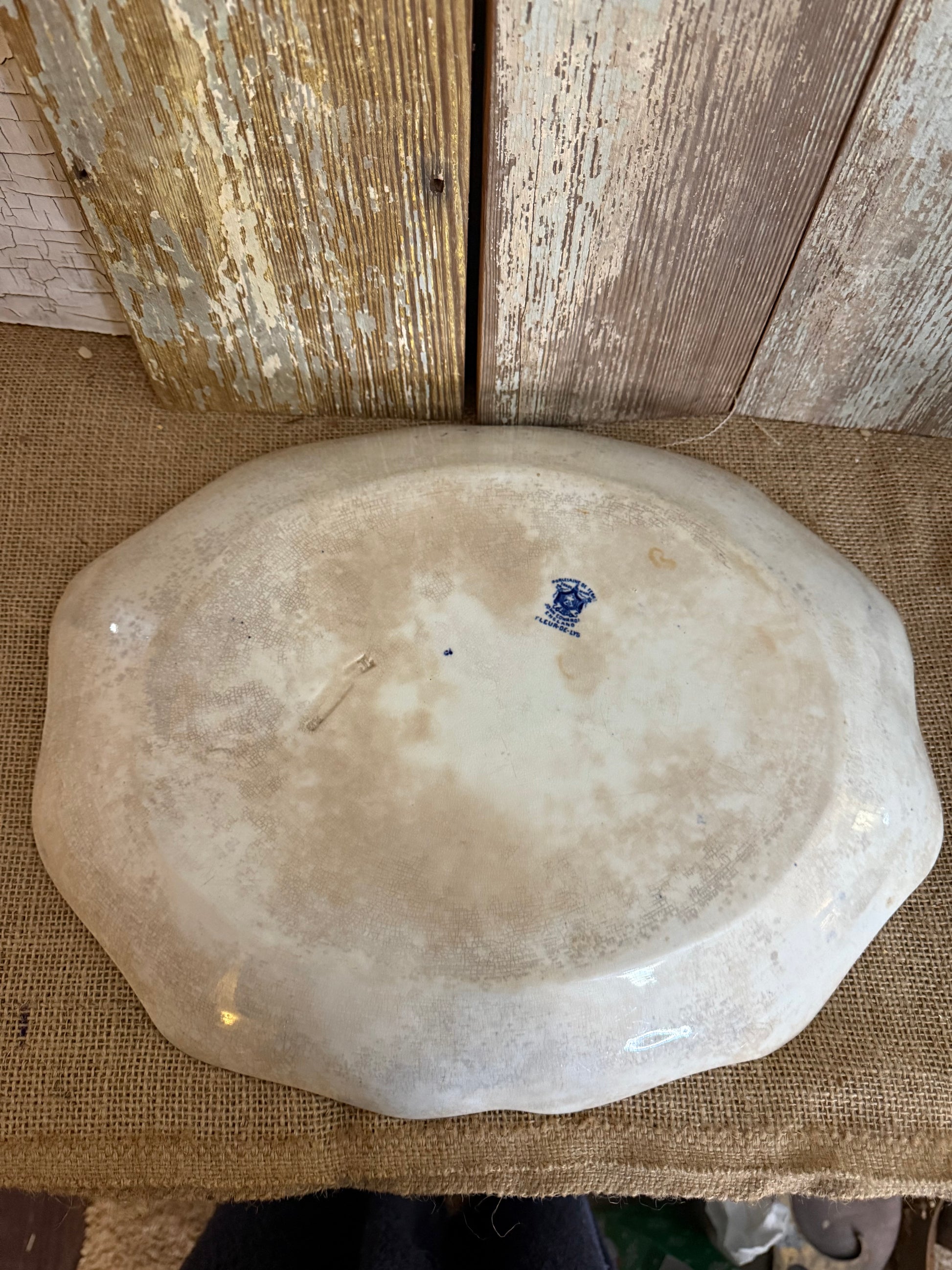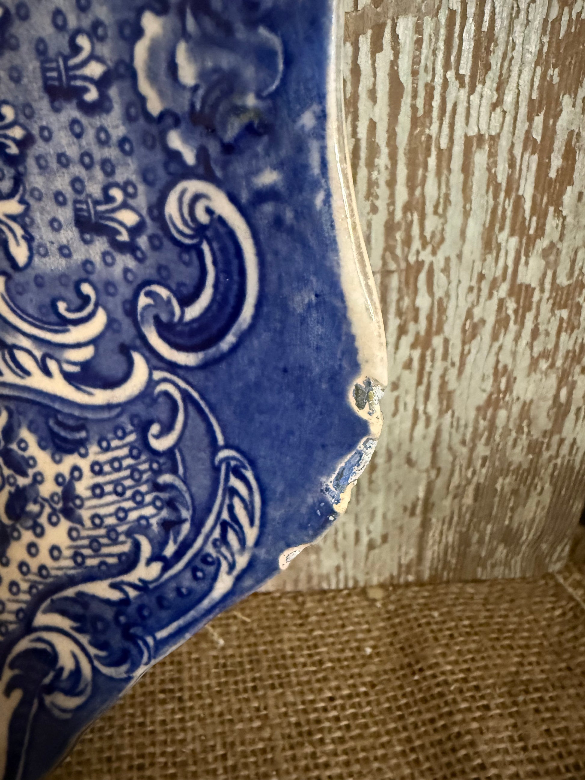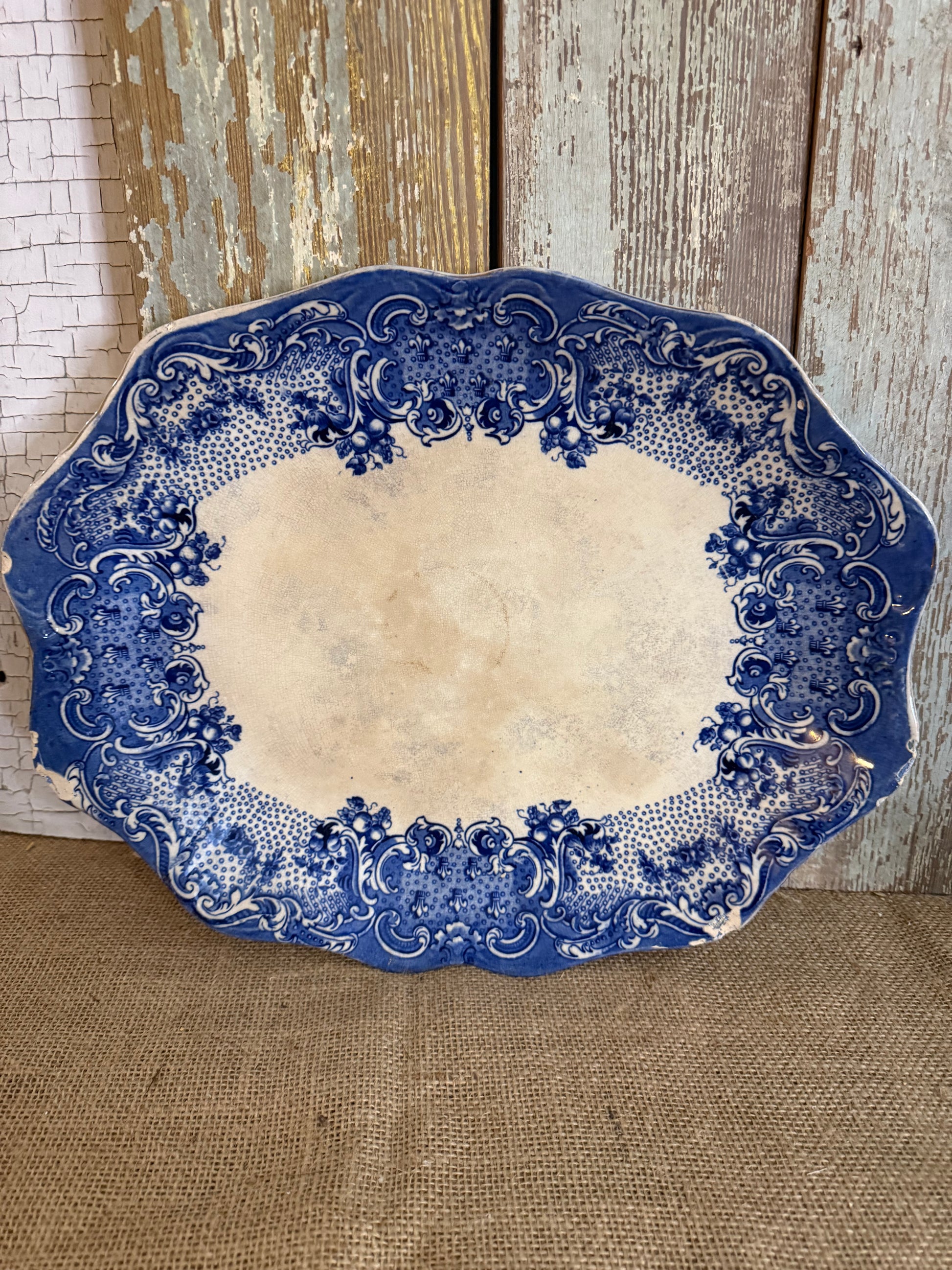 Antique John Edward blue Transferware platter from the 1800's. 12 1/2" x 15 3/4". This is a very old piece and it has quite a bit of staining and crazing. There are also several mature chips along the rim. Please look at pictures closely prior to purchase. Despite the disclaimers, it's a truly stunning platter!