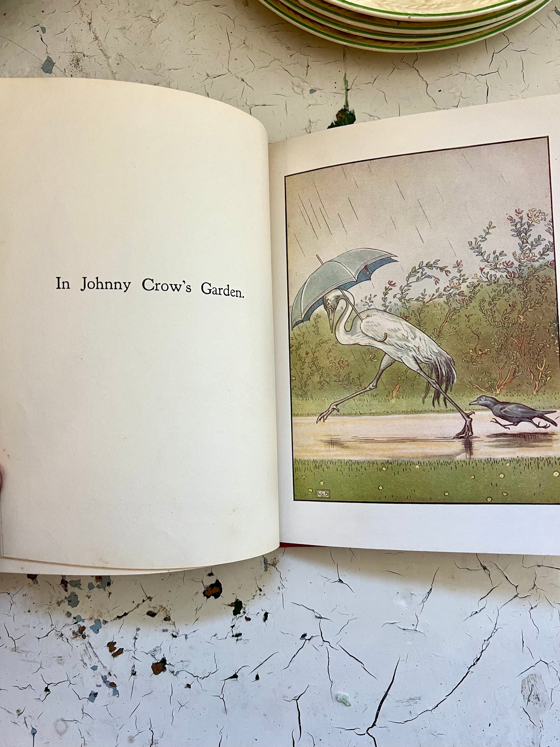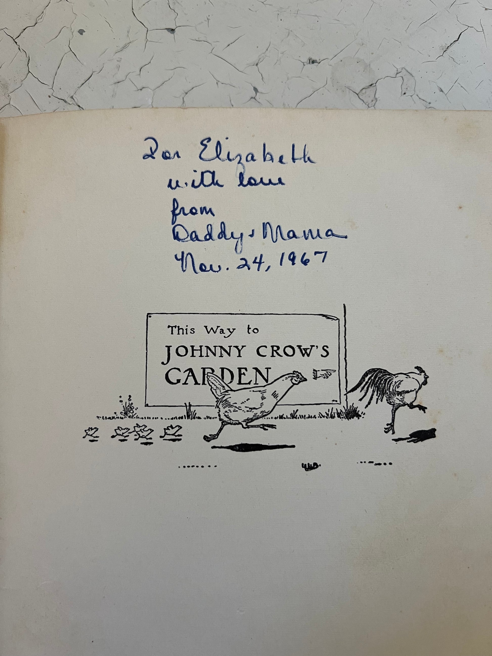 Vintage Johnny Crow's Garden: Printed from 1903-1965 in London, England. The inscription says it was given as a gift in 1967. A children's book with great animal illustrations and rhymes.