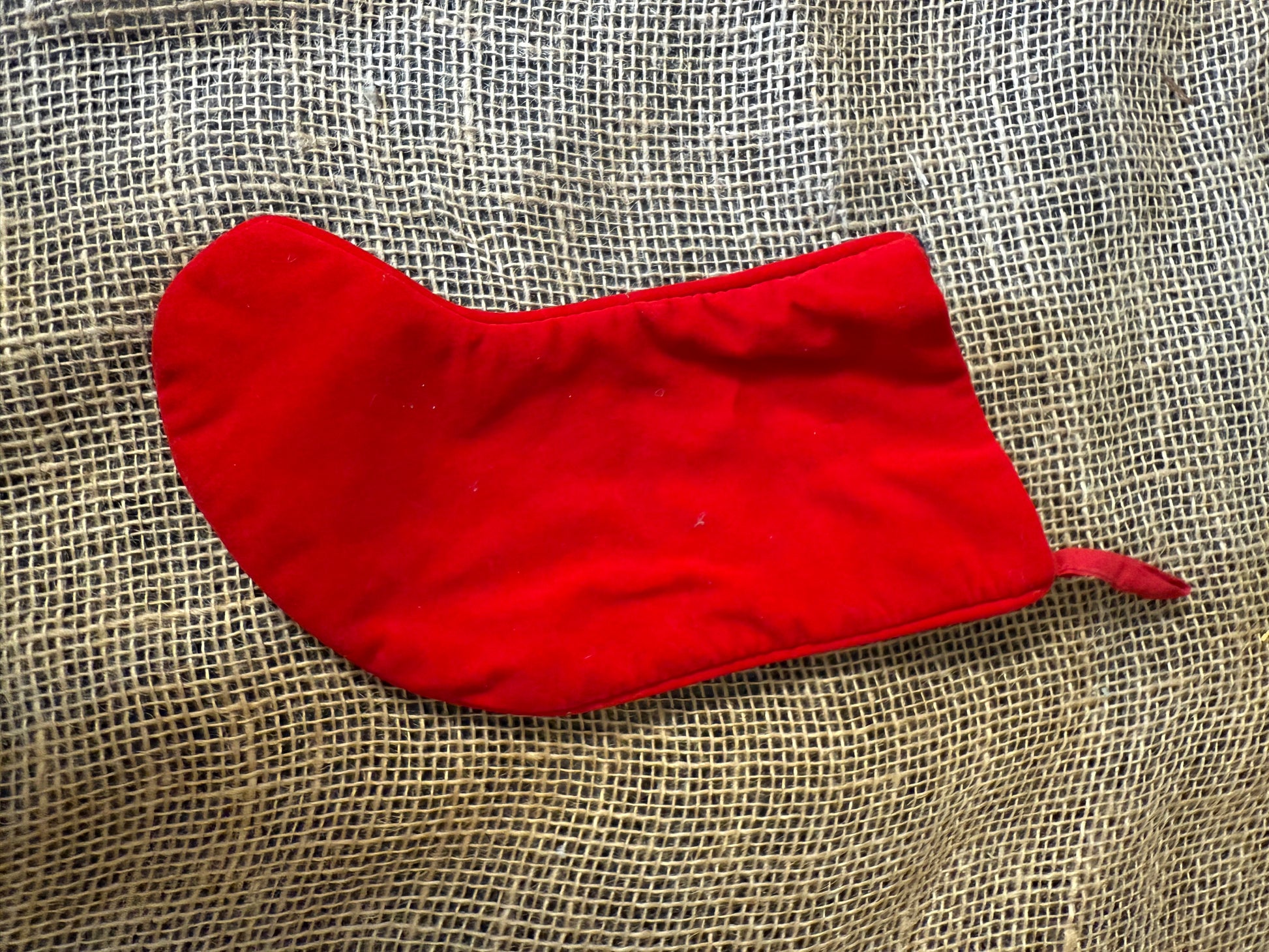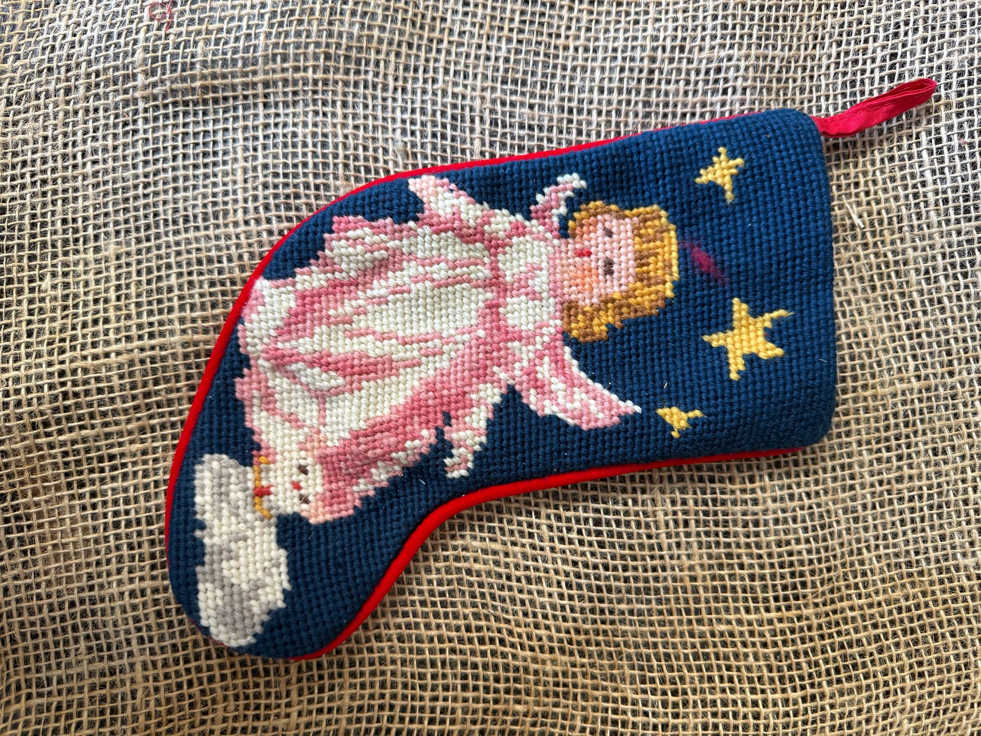 Needlepoint stocking with angel and lamb. Blue background on the front and red velvet backing. 6" x 9" In great condition!
