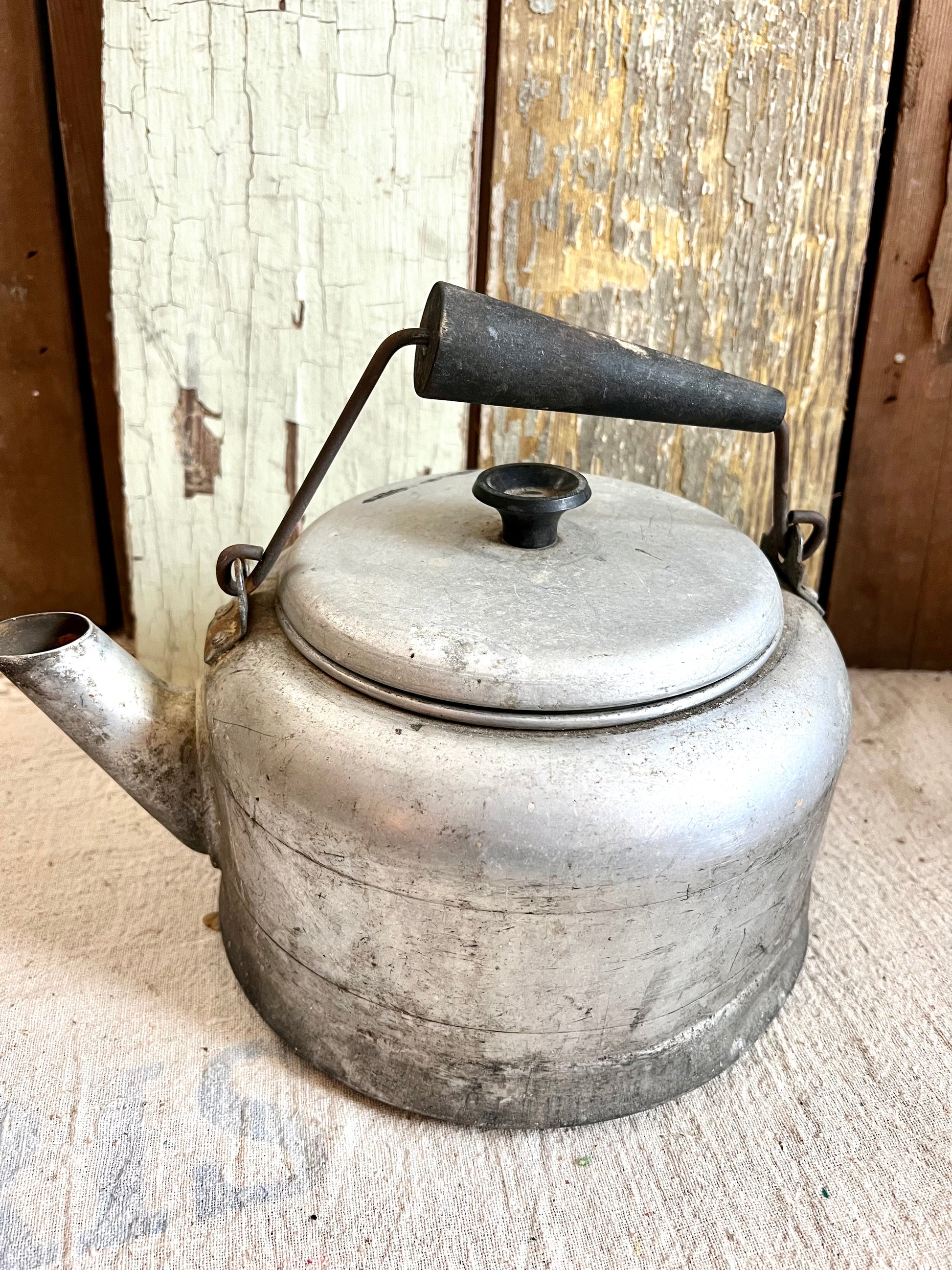 Very old aluminum kettle. Handle has some wear and lots of rust and crust. 10 1/2" tall, 7" wide.