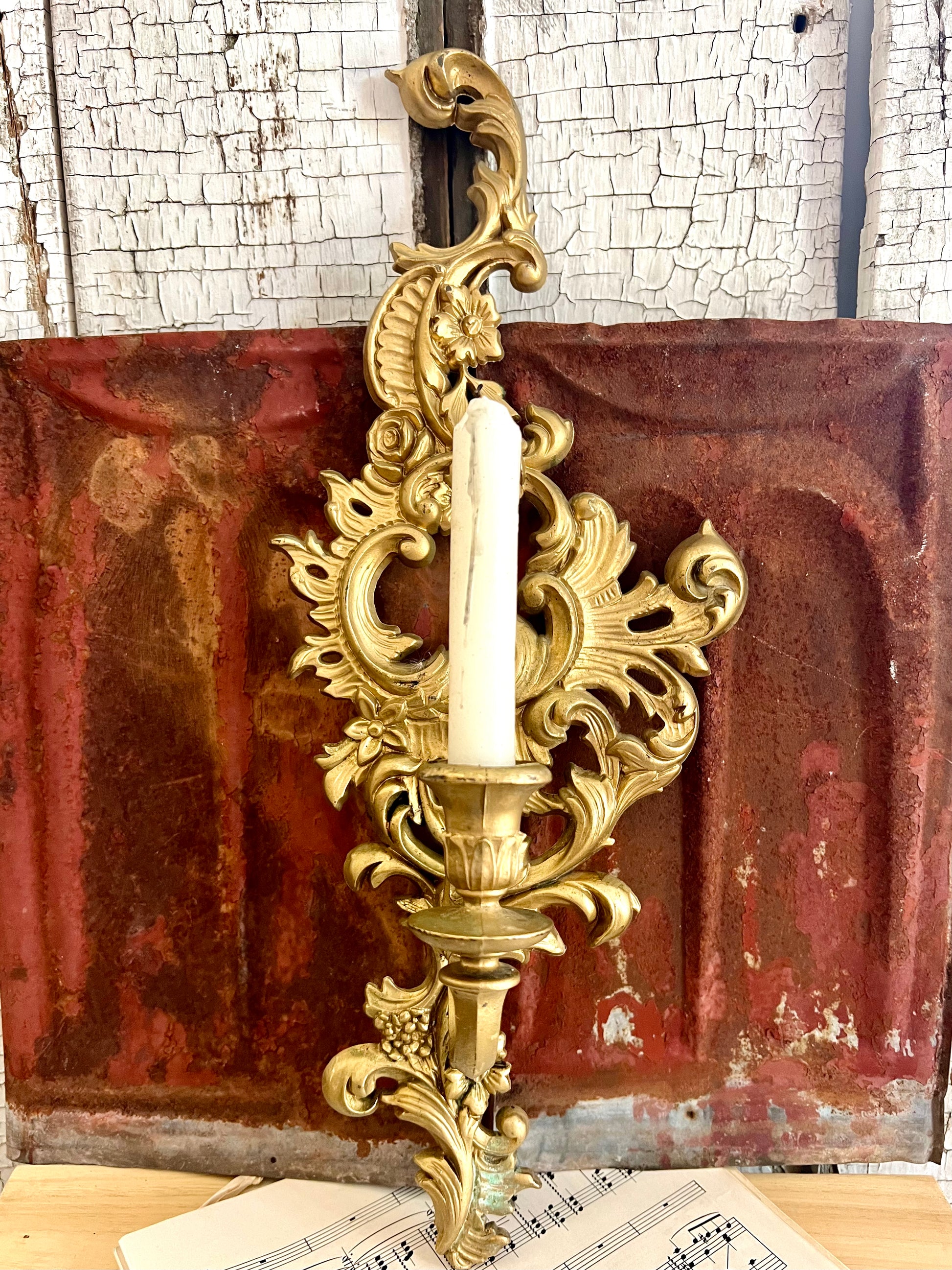 Ornate gold candle sconce with fabulous detail! Plastic like gold material. 18 1/2" long, 7 1/2" wide. Some patina.