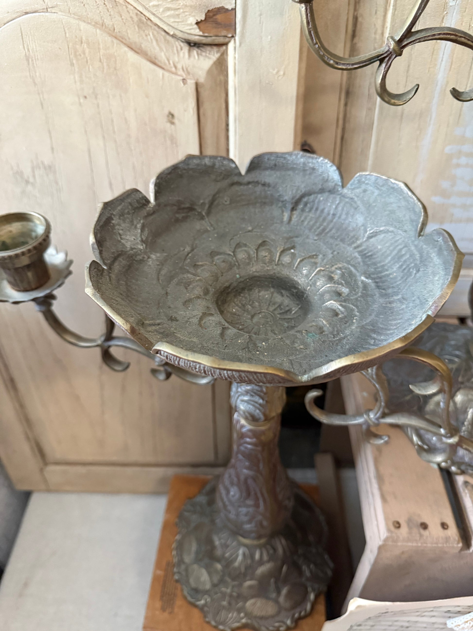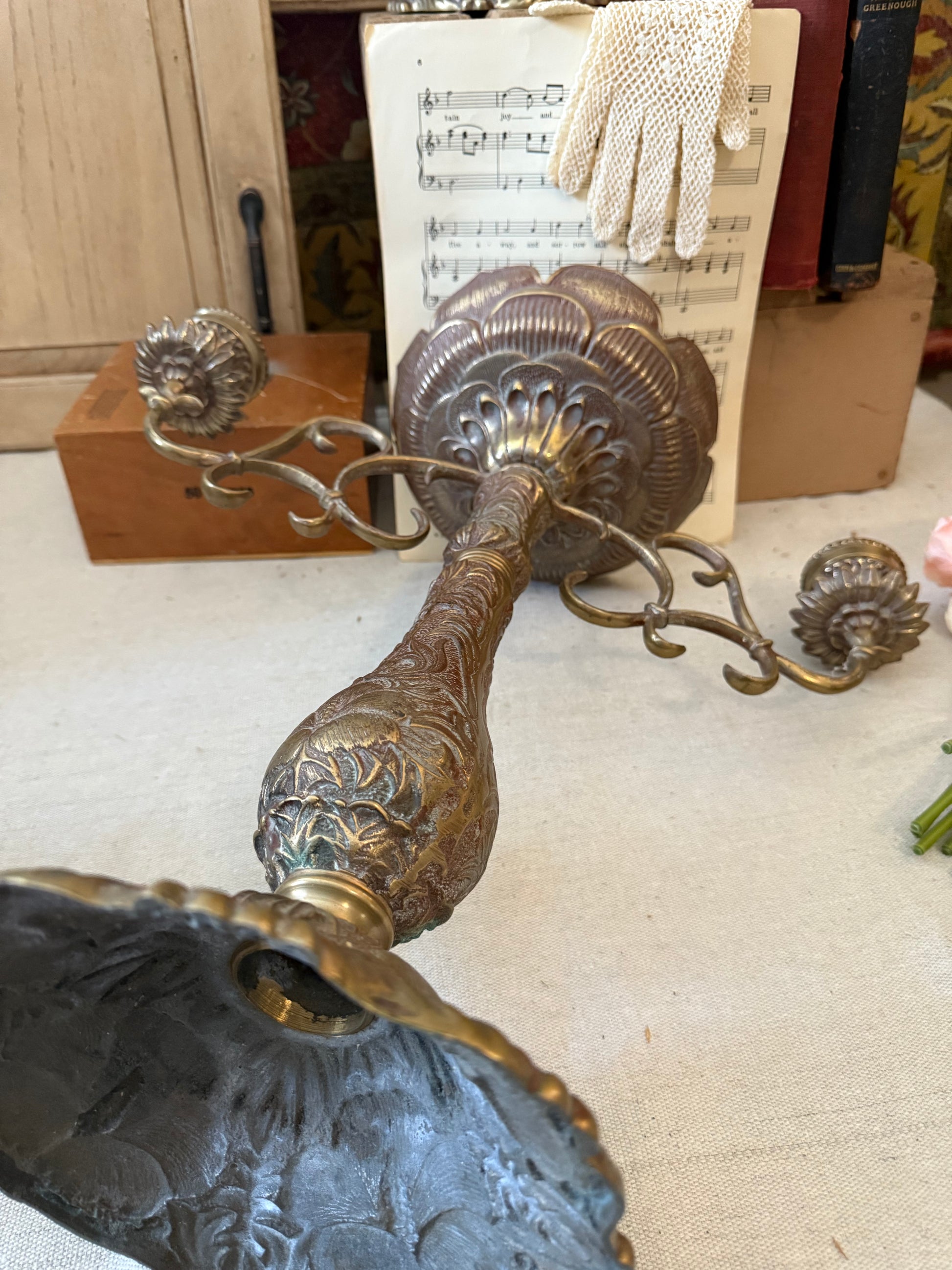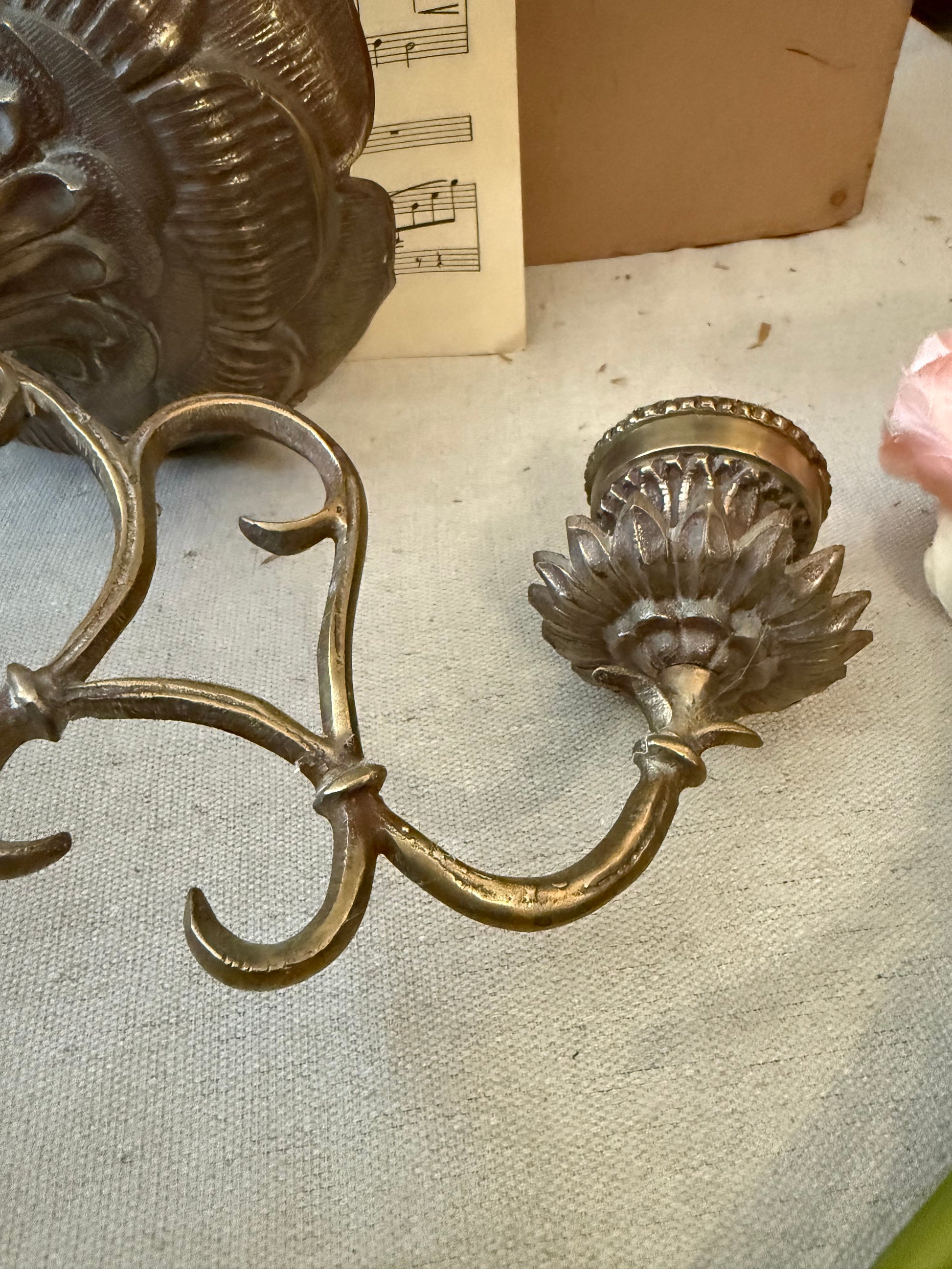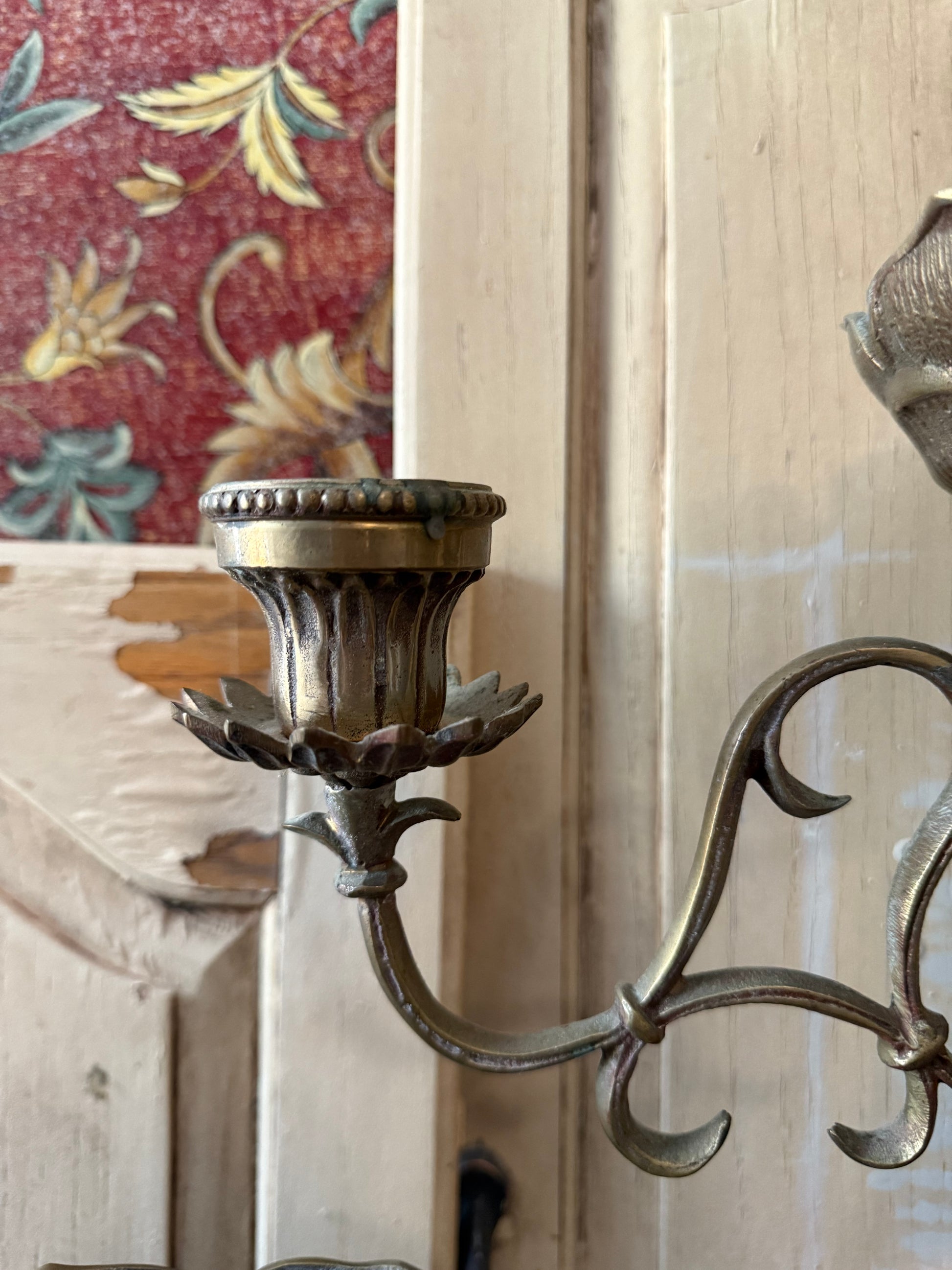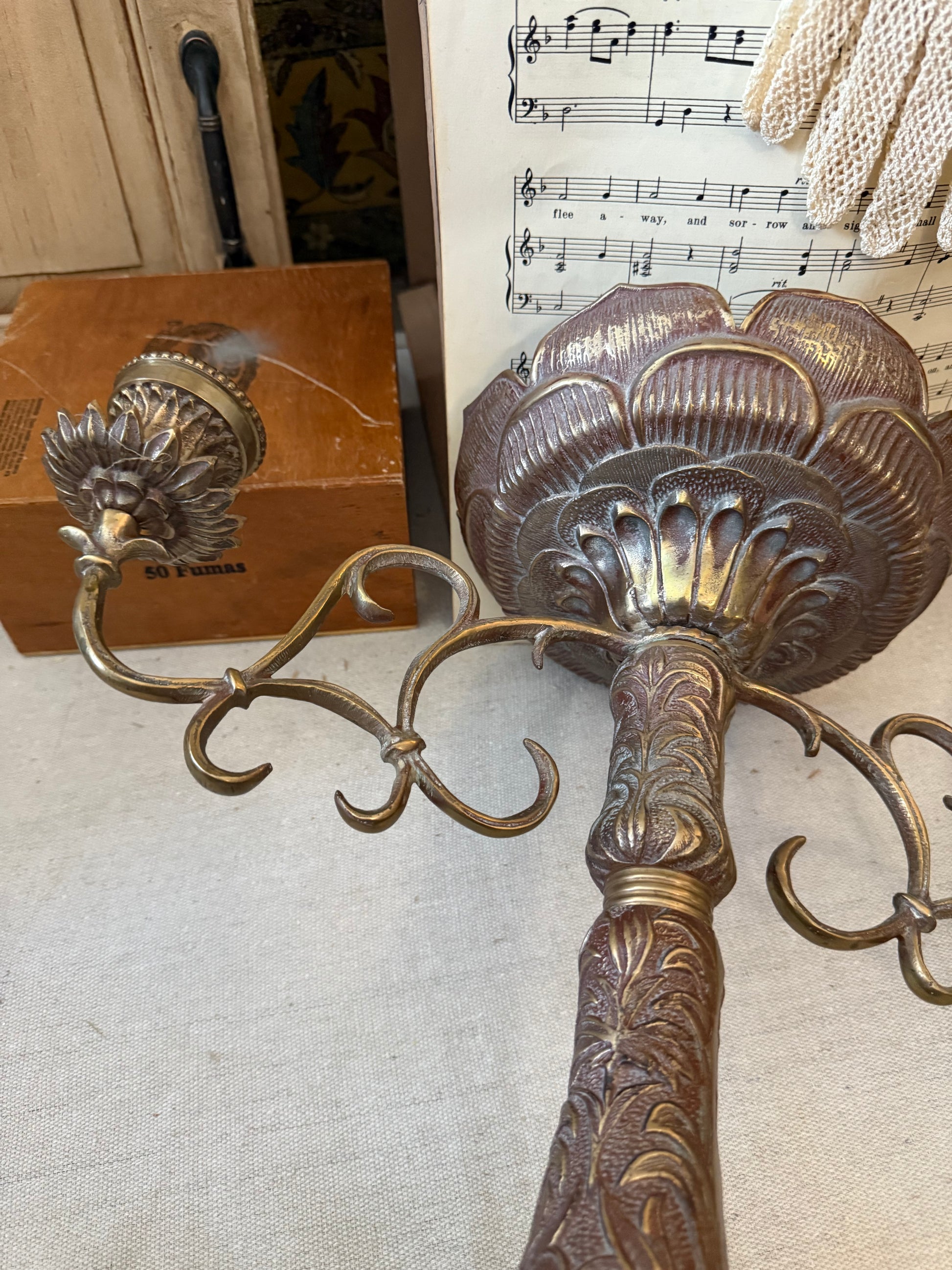 Large middle sconce with two smaller sconces on either side and gorgeous ornate detailing! The middle sconce is large enough to hold a vase or other floral vessel. Great patina and a flicker of red accents in the brass. Standing 17" tall and 17 1/2" wide (candle to candle), these will most definitely make a statement!