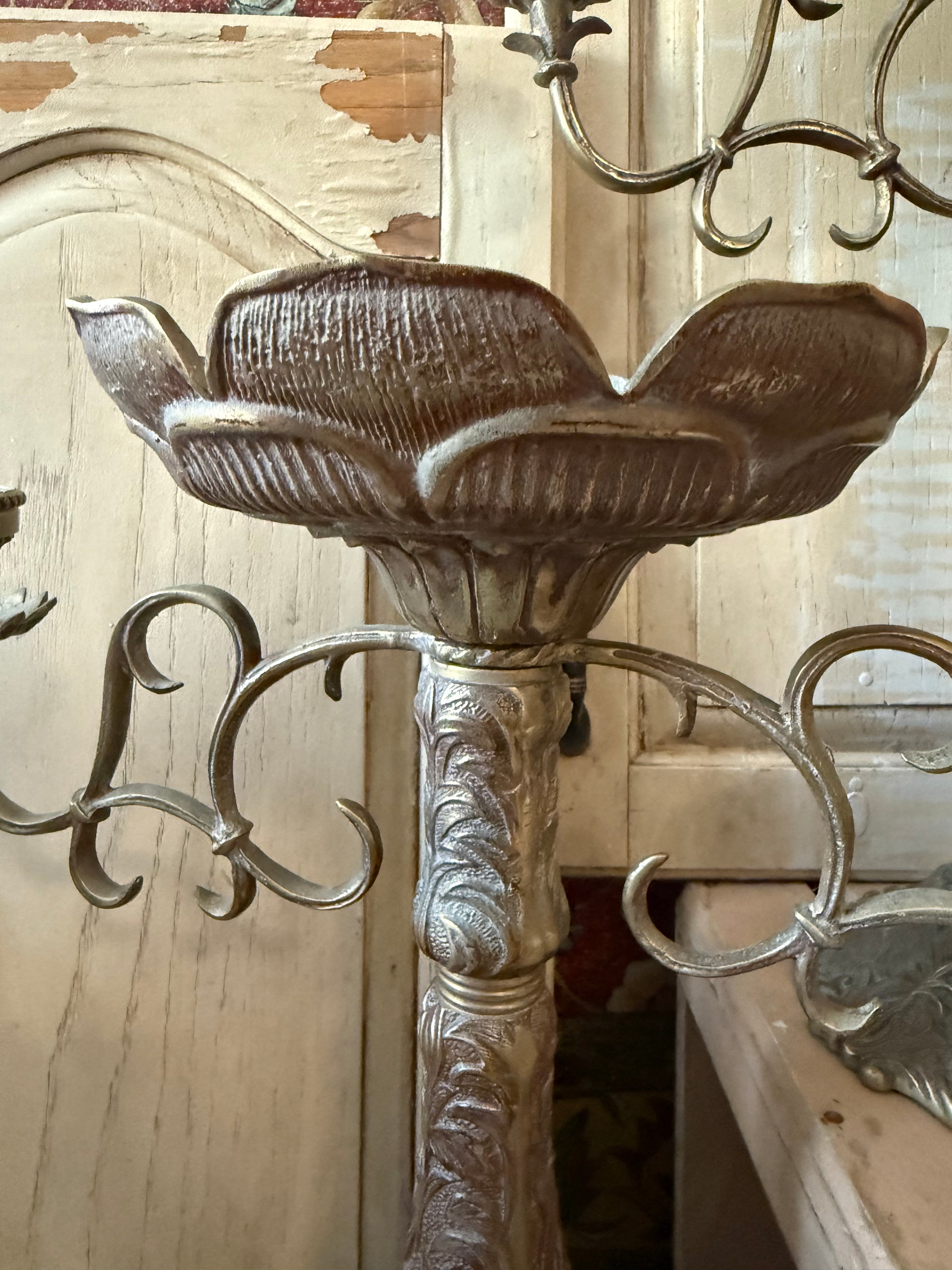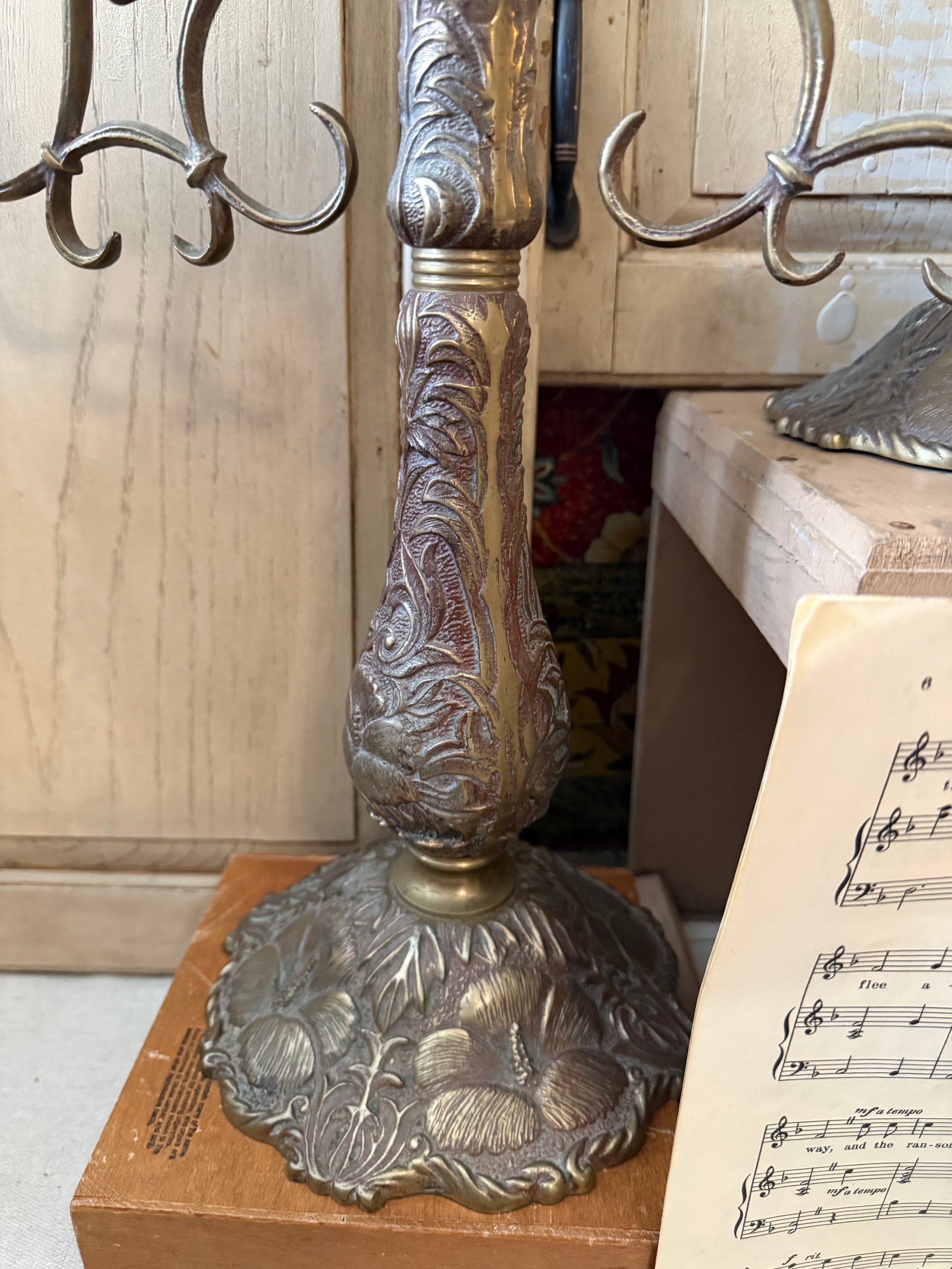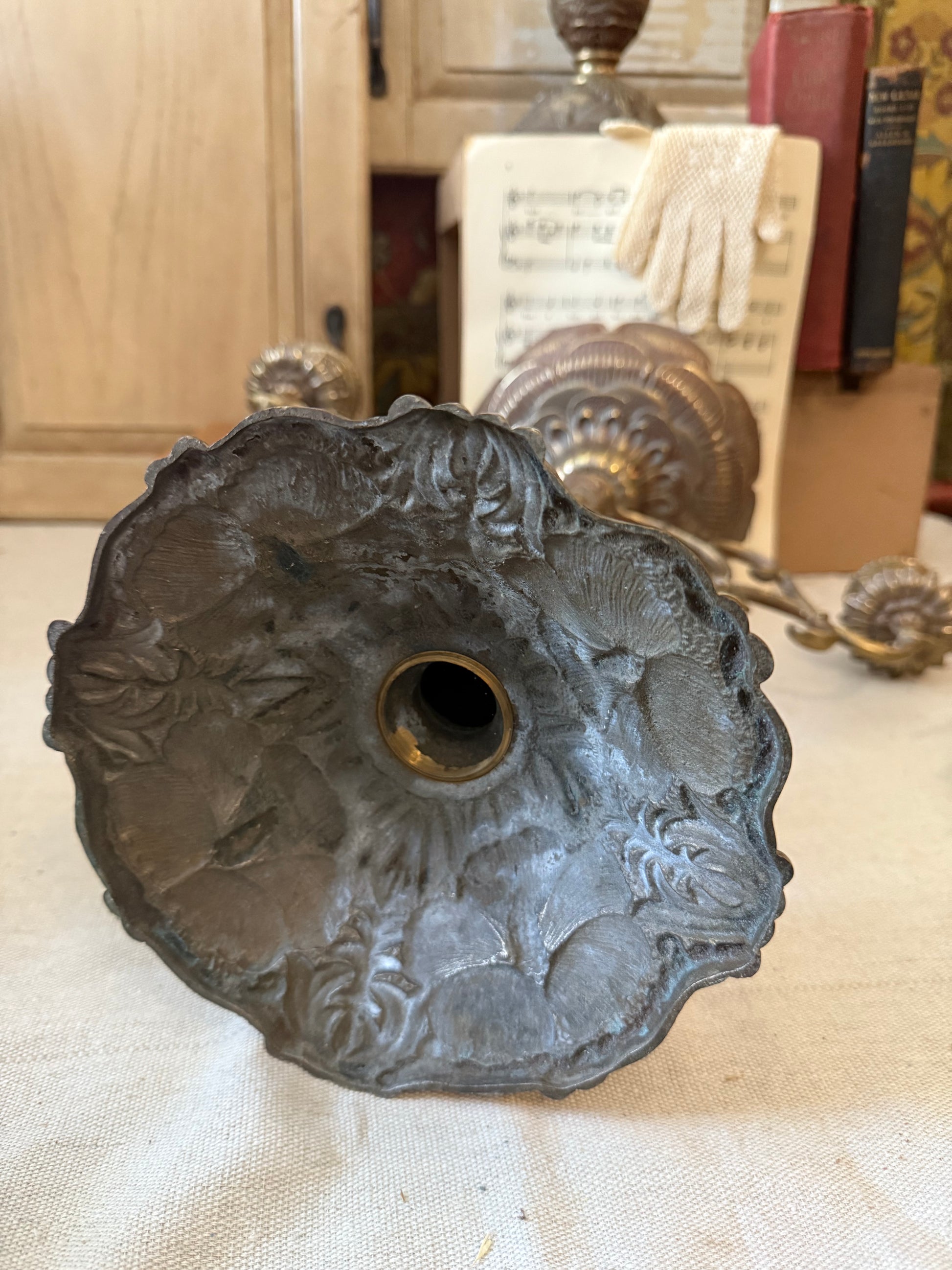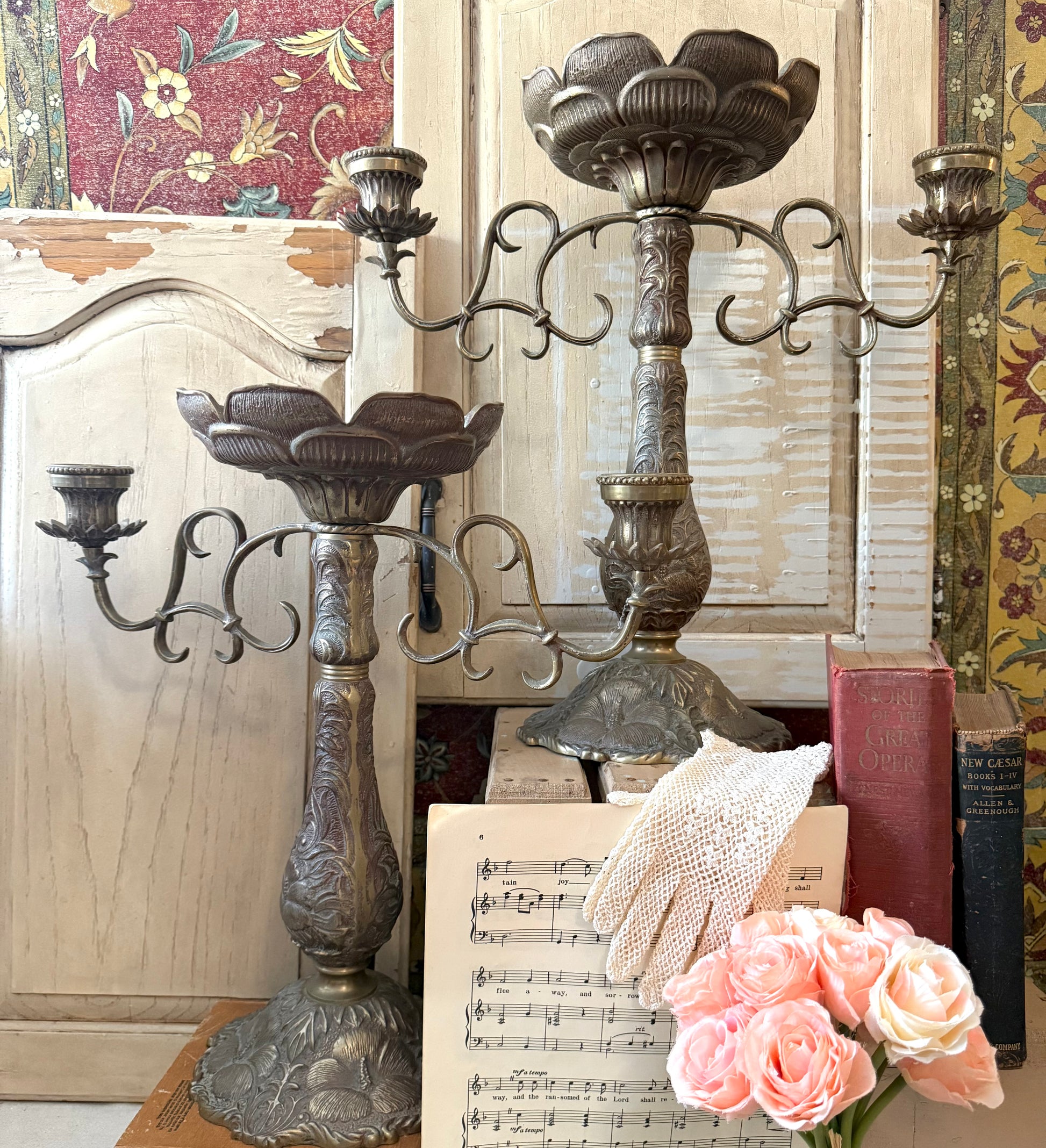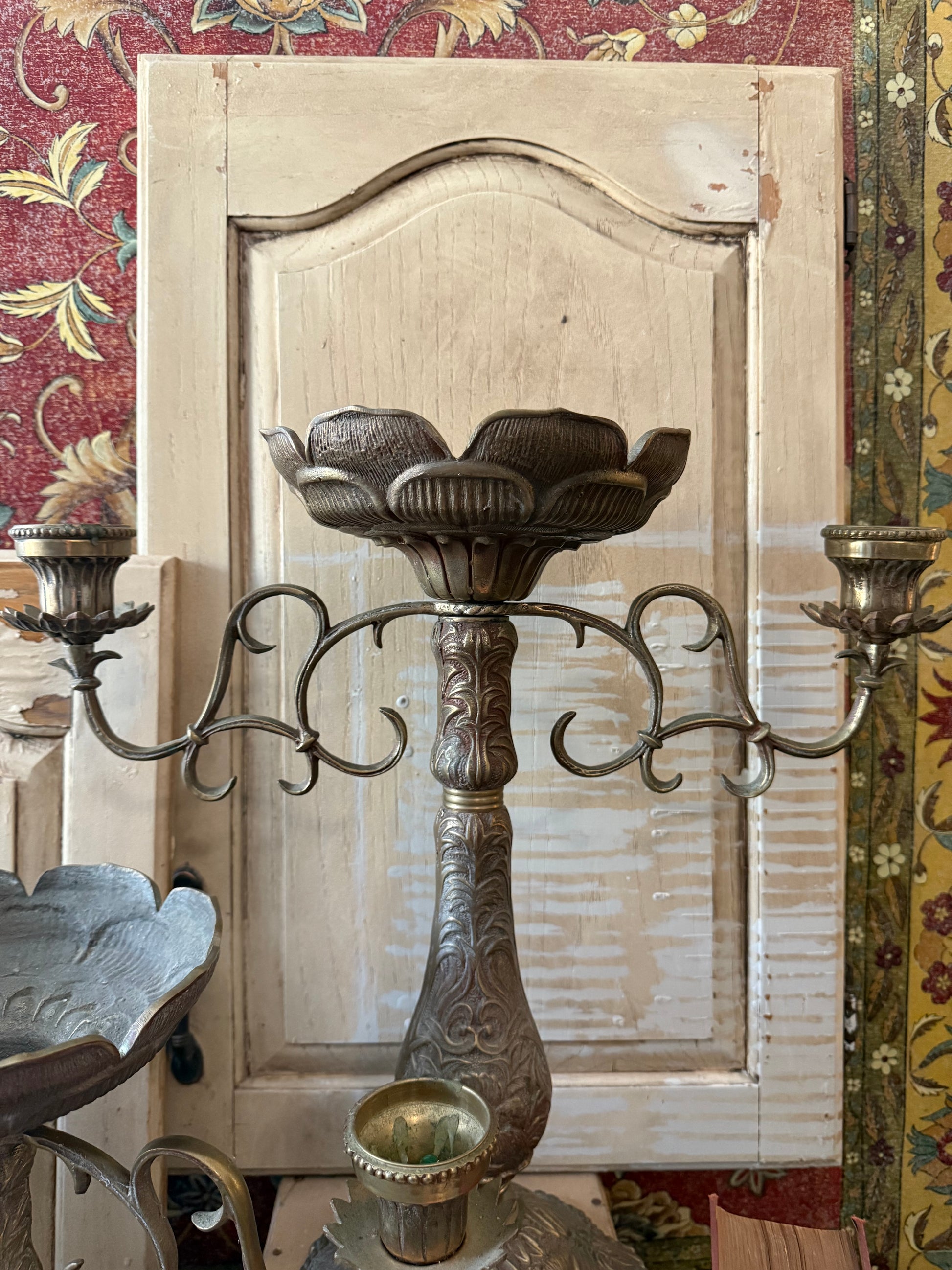 Large middle sconce with two smaller sconces on either side and gorgeous ornate detailing! The middle sconce is large enough to hold a vase or other floral vessel. Great patina and a flicker of red accents in the brass. Standing 17" tall and 17 1/2" wide (candle to candle), these will most definitely make a statement!