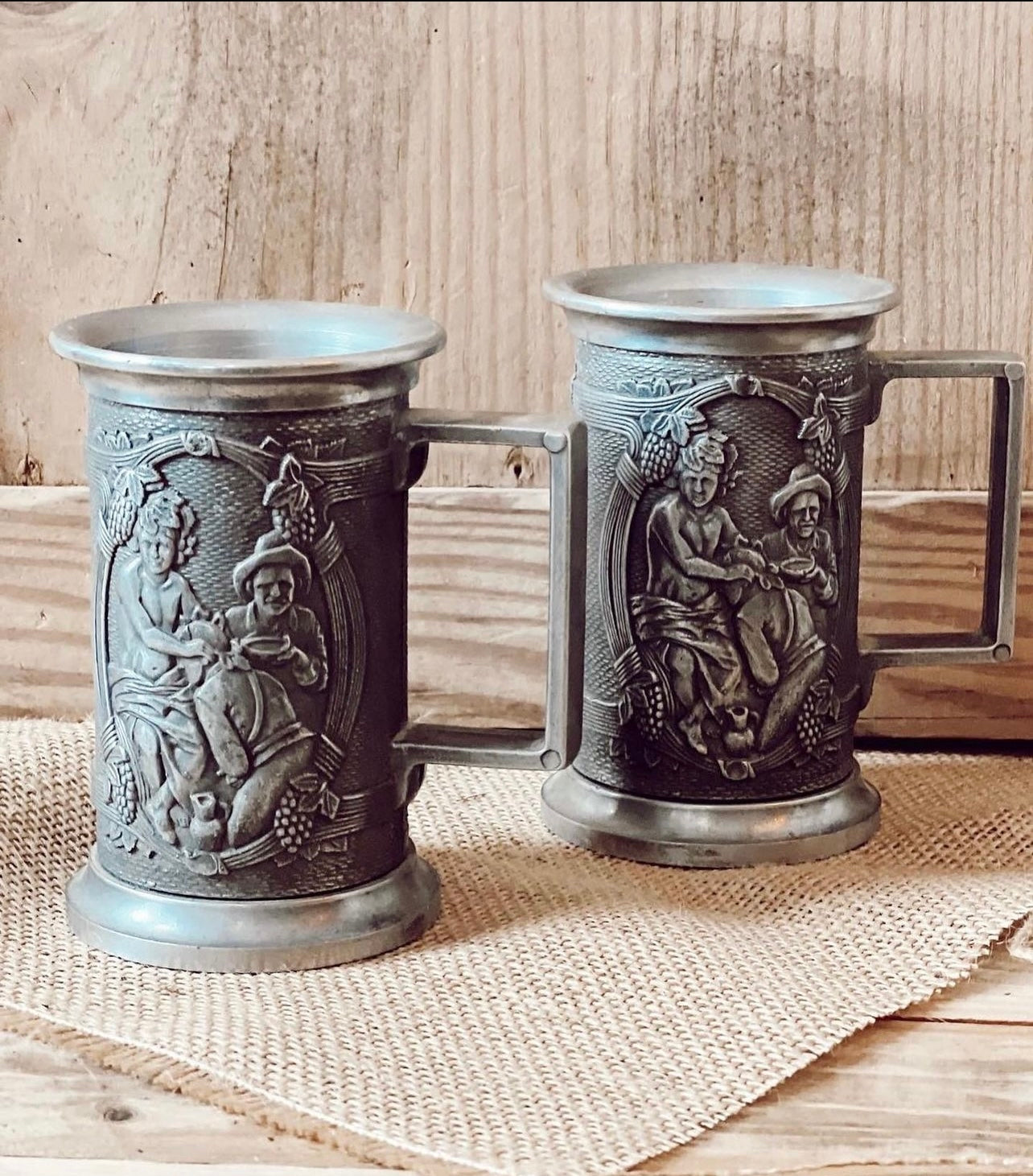 Pair of pewter mugs with ornate detail. 4 1/2" tall, 4" wide