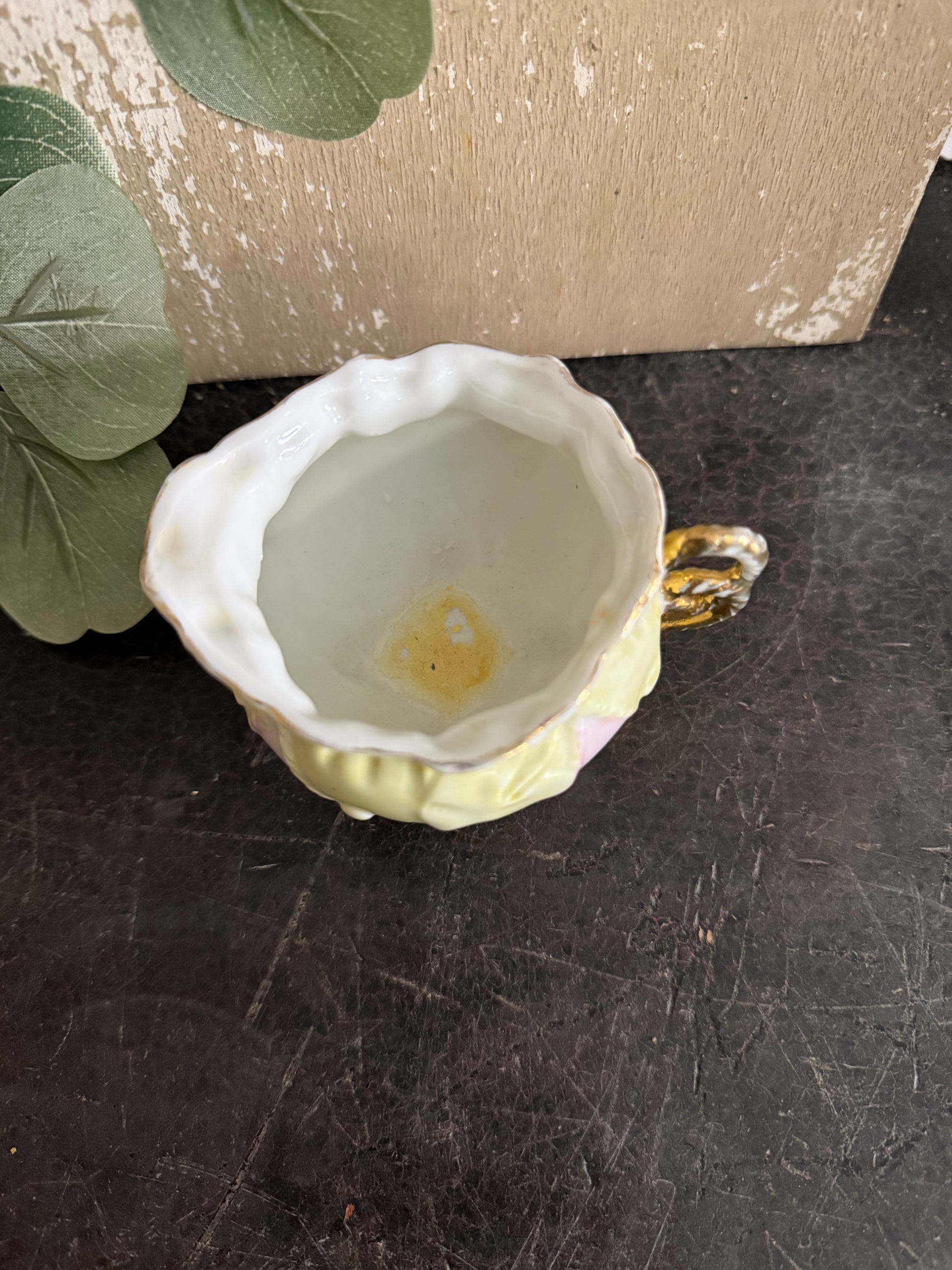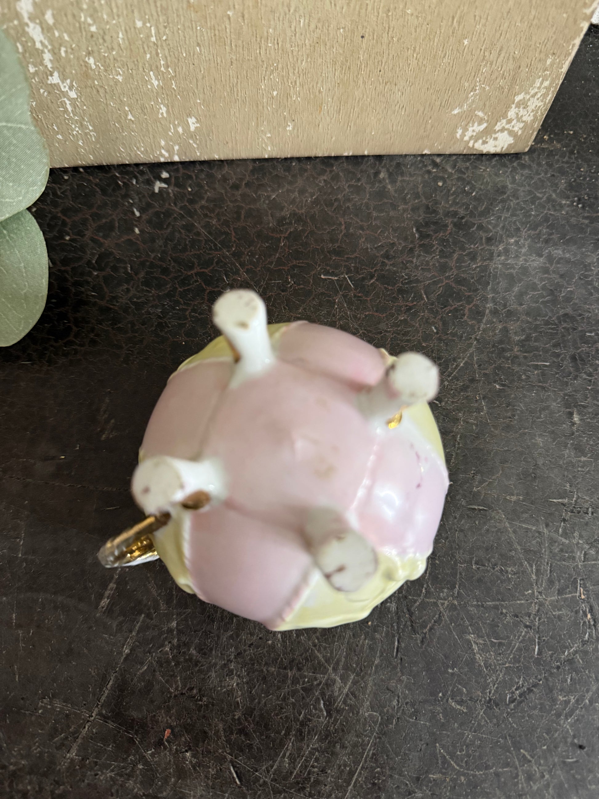 Gorgeous handle and gold feet. Some of the gold is worn on both the handle and the feet. Unmarked, possibly a hobbyist piece. Very unique, dainty design!