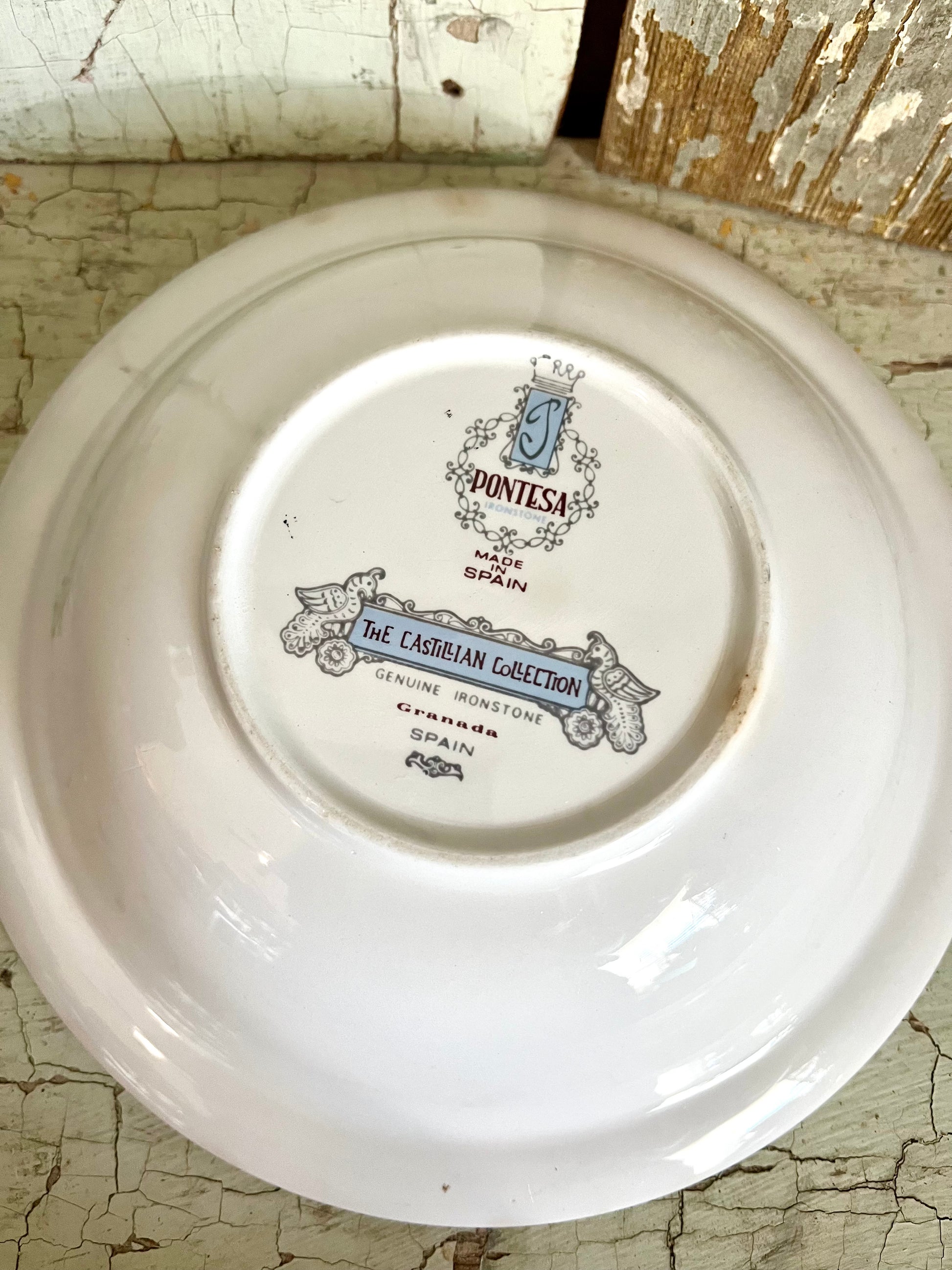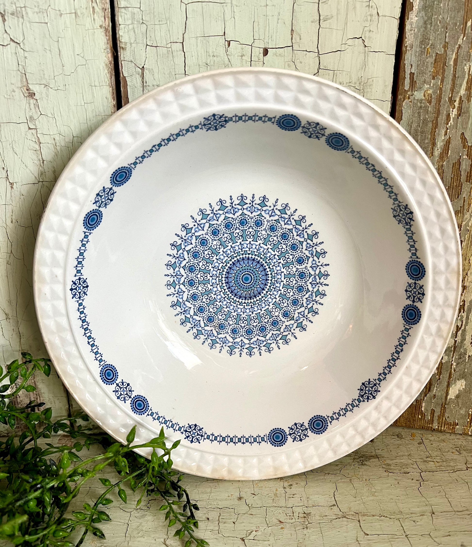 Pontesa blue & white ironstone bowl. The geometric detail is gorgeous and the rim pattern is great as well! Made in Spain and definitely has a Spanish flair. 9 1/4" diameter, 2" tall. Some staining and crazing.