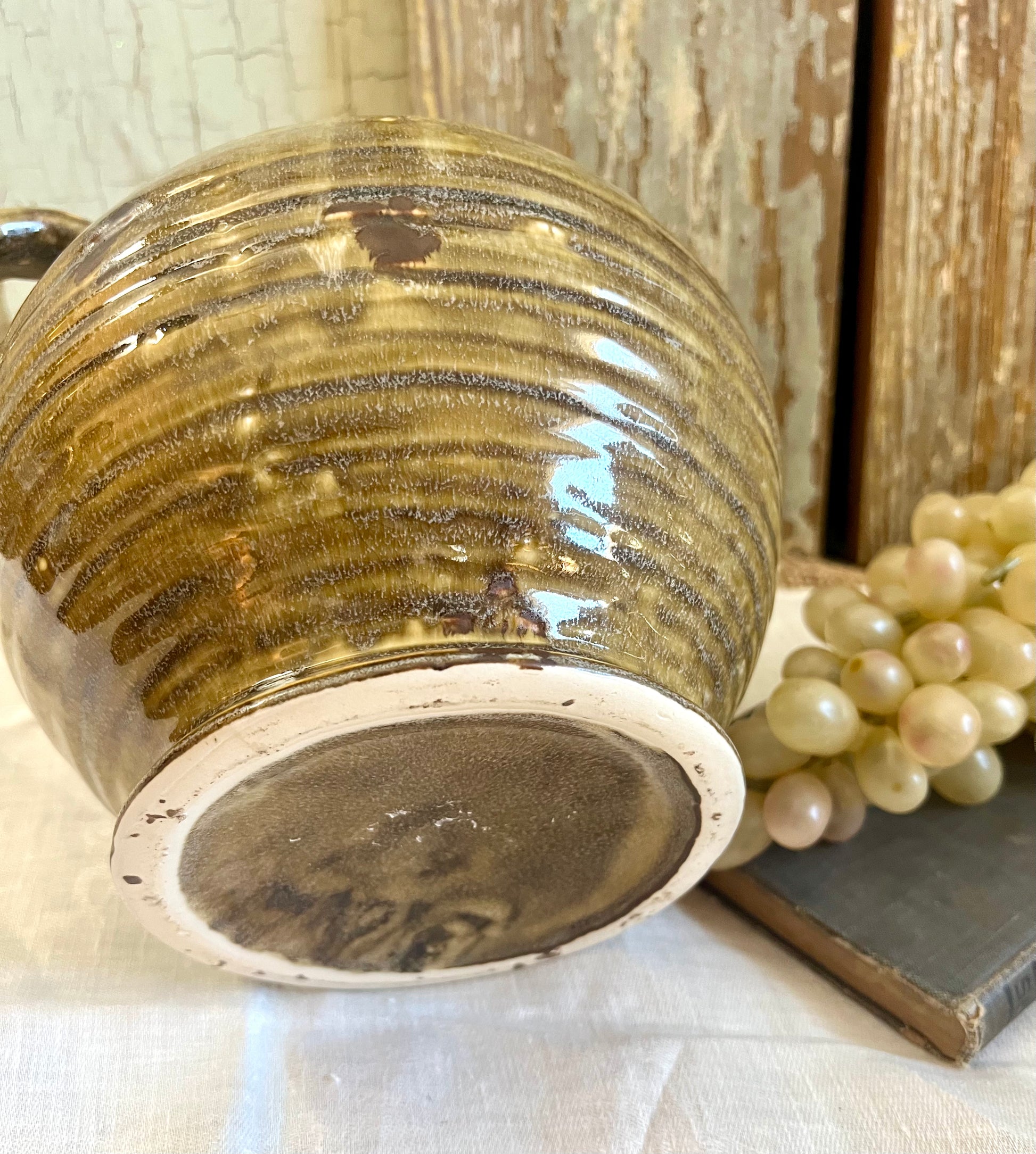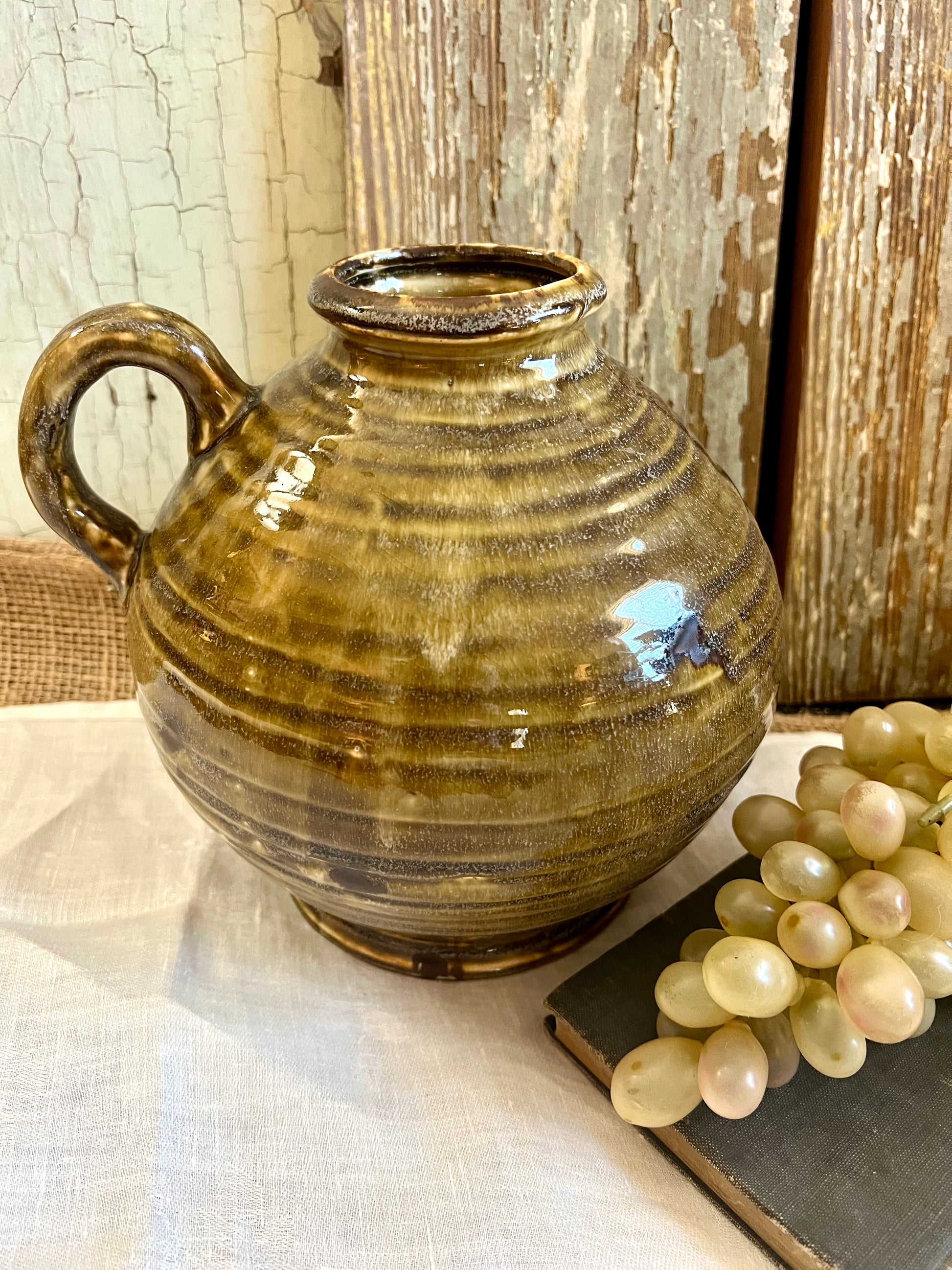 Chunky pottery jug with a pretty olive glaze. 8" tall, 8" wide.