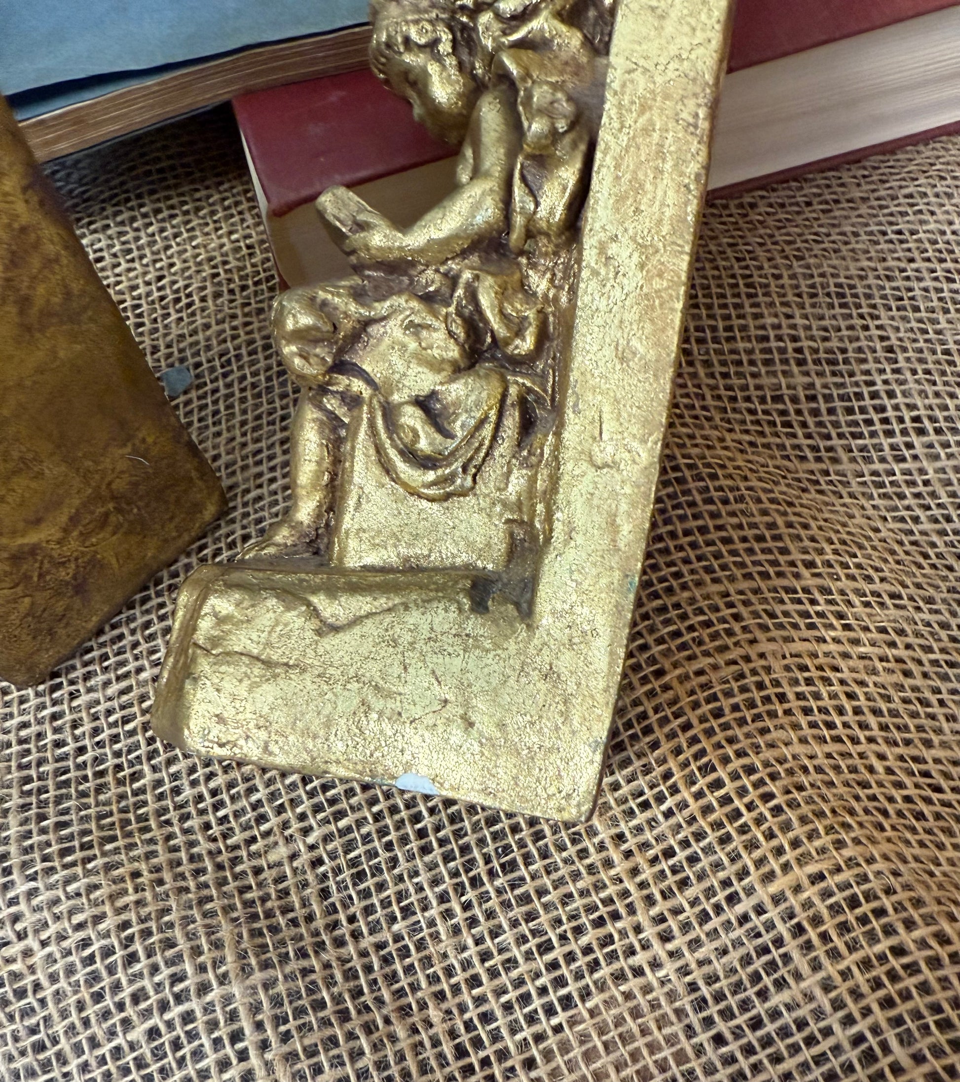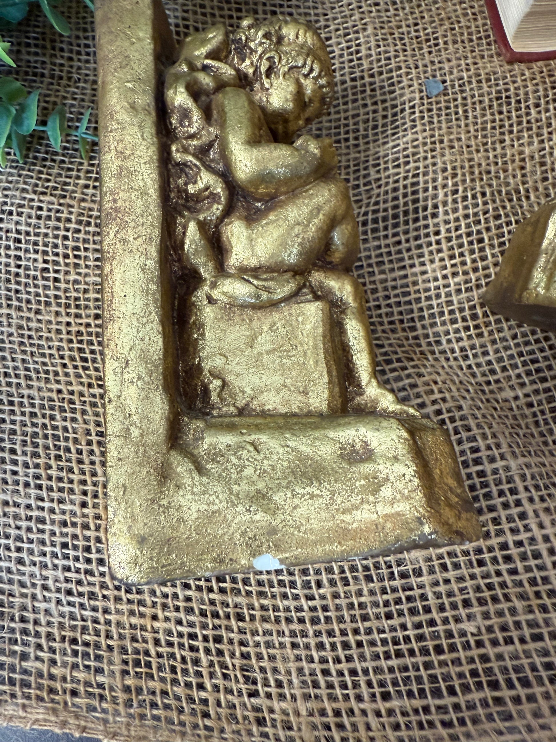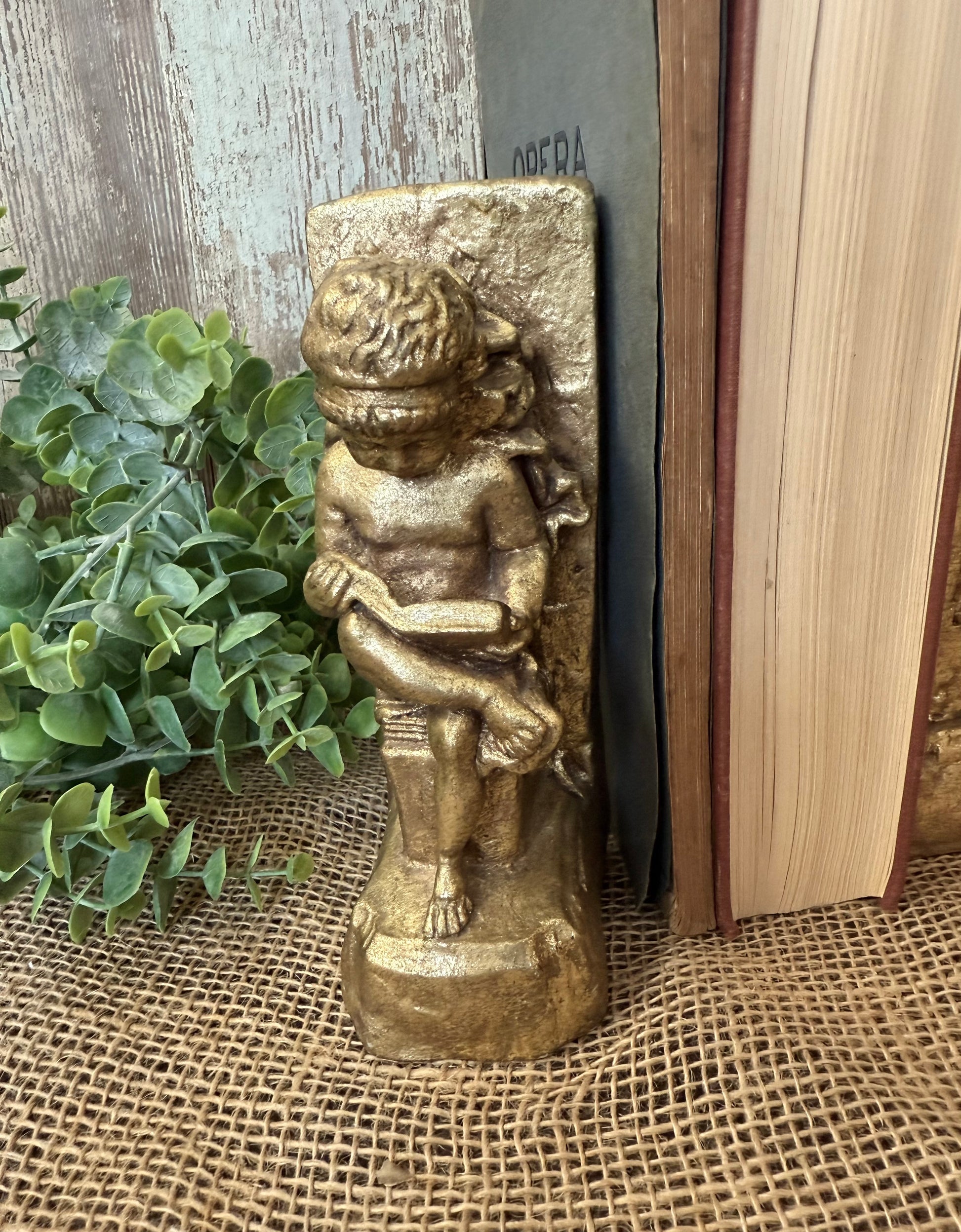 Gold resin statue bookends of a sitting child reading a book. 2 1/2" wide, 6 3/4" tall, and 3 1/4" deep. Some minor chips along the base but, overall, in great condition!