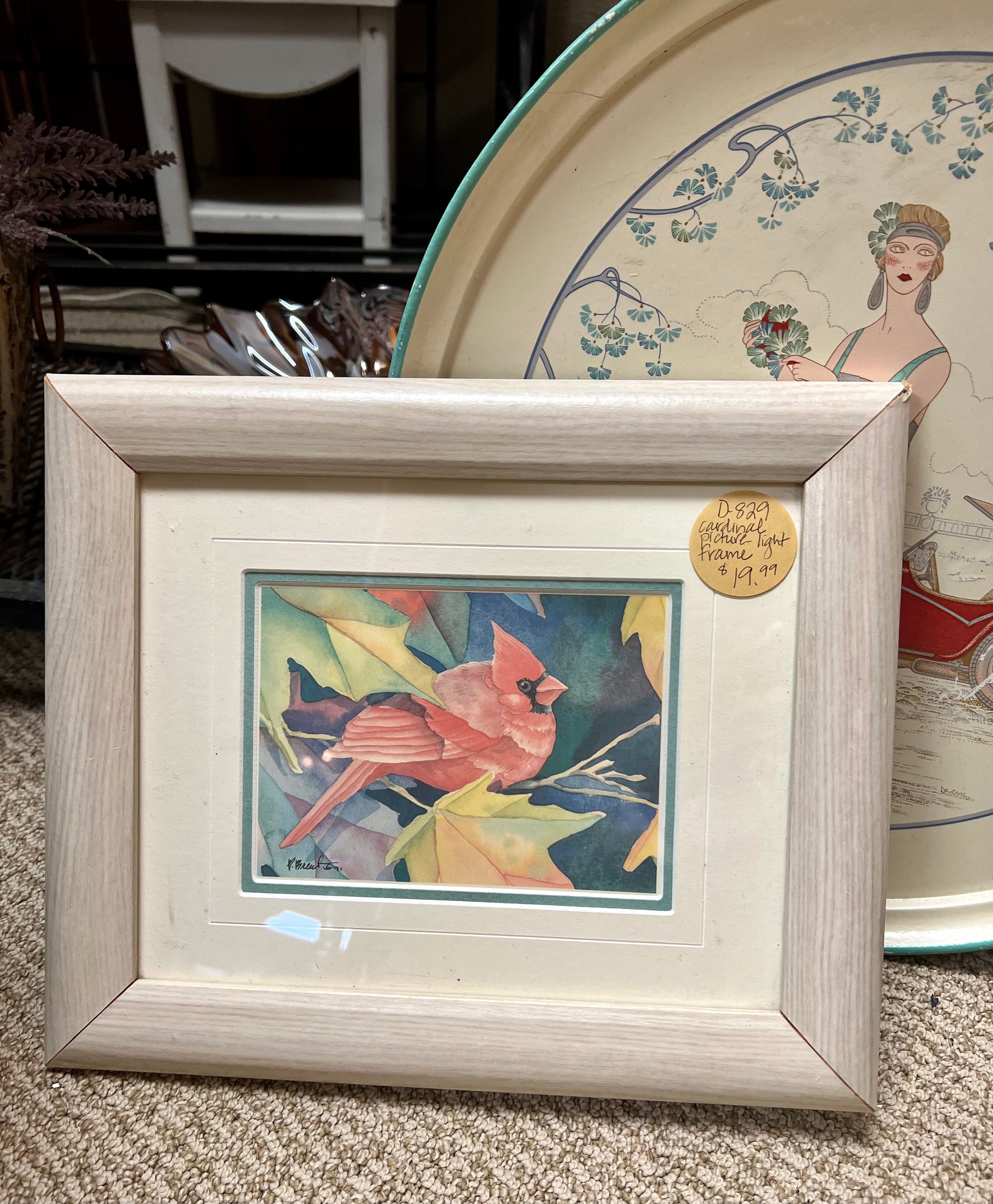 A unique cardinal print with vibrant colors. Light white washed frame. 10 1/2" x 12 1/2"