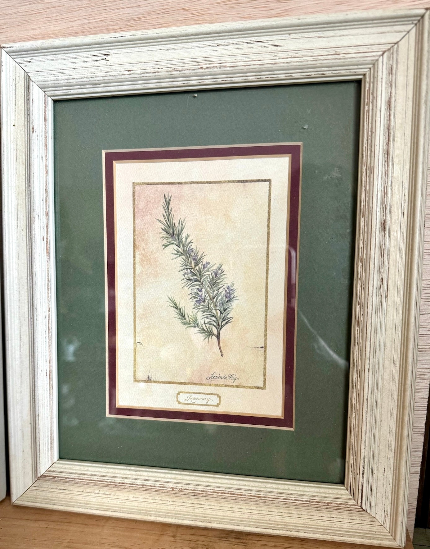 Rosemary framed botanical. Watercolor print by Lucinda Foy. Green and maroon mat with distressed white fram.