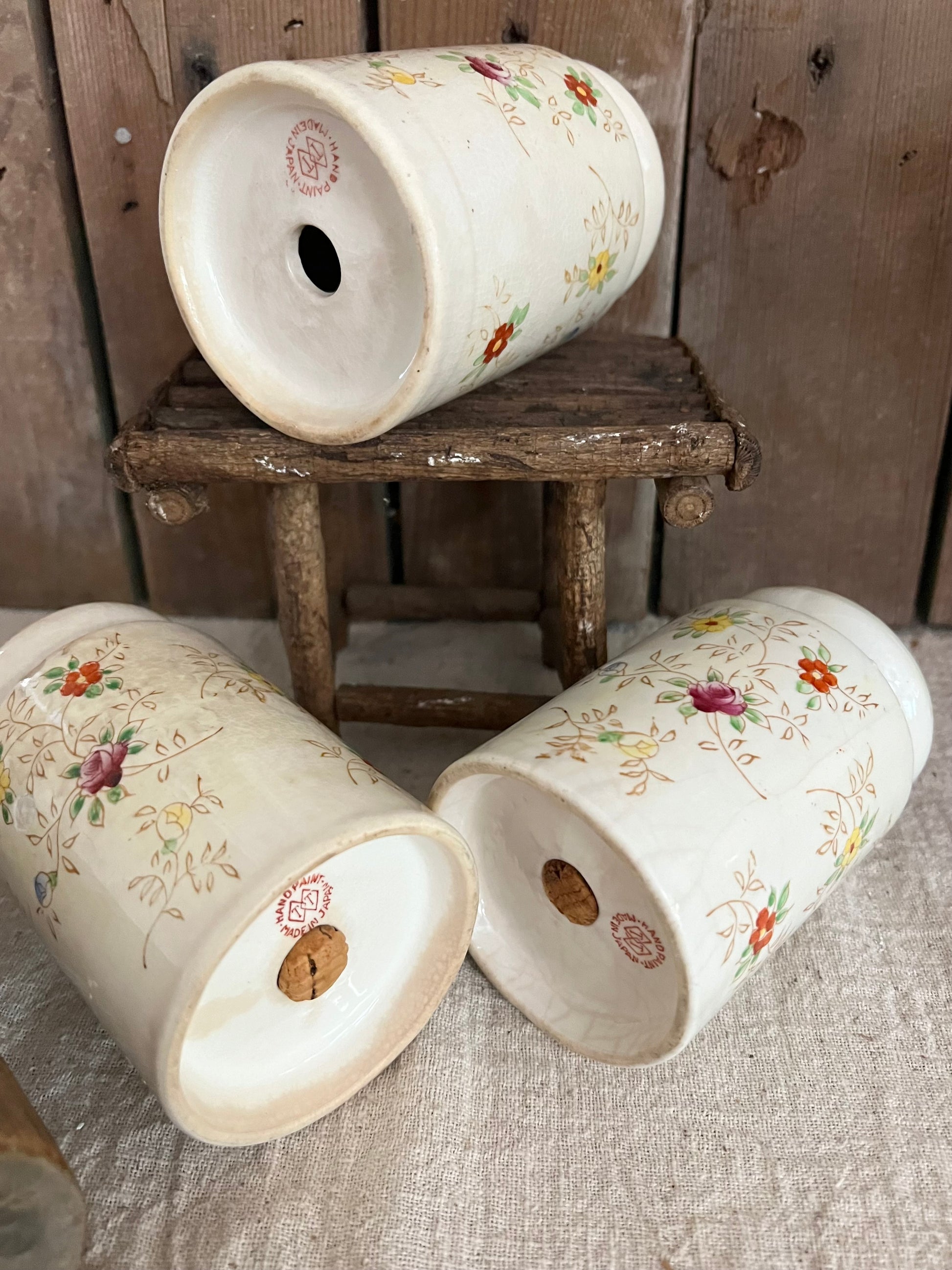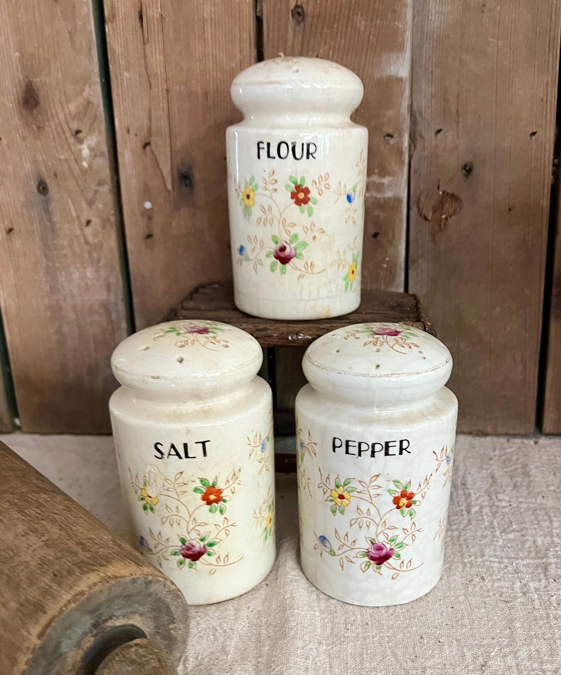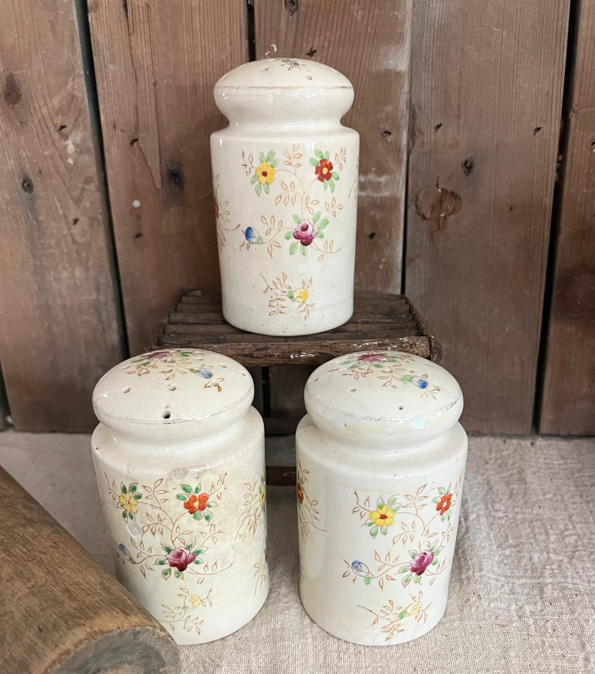 Set of three vintage shakers marked Japan. Floral detail and crazing throughout. Shakers are 5" tall and 2 3/4" diameter. Includes Salt, Pepper, & Flour. The cork stopper for the flour is inside the shaker. The salt & pepper stoppers are in tact. A beautiful matching set!