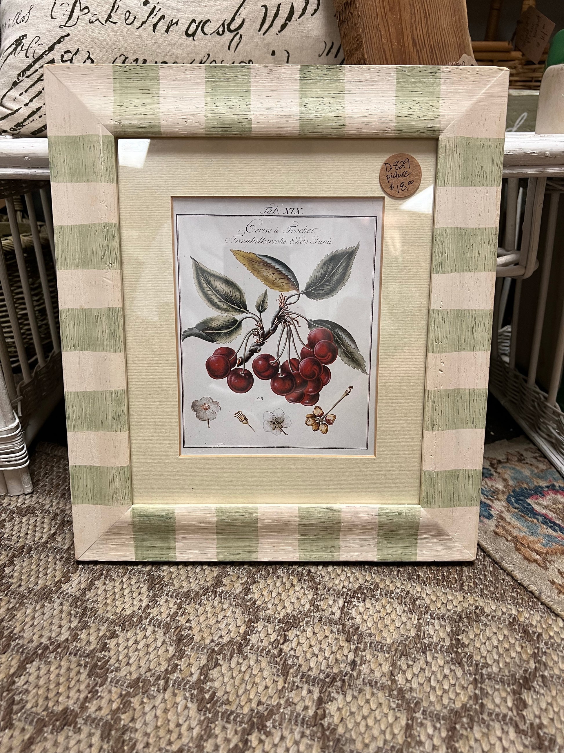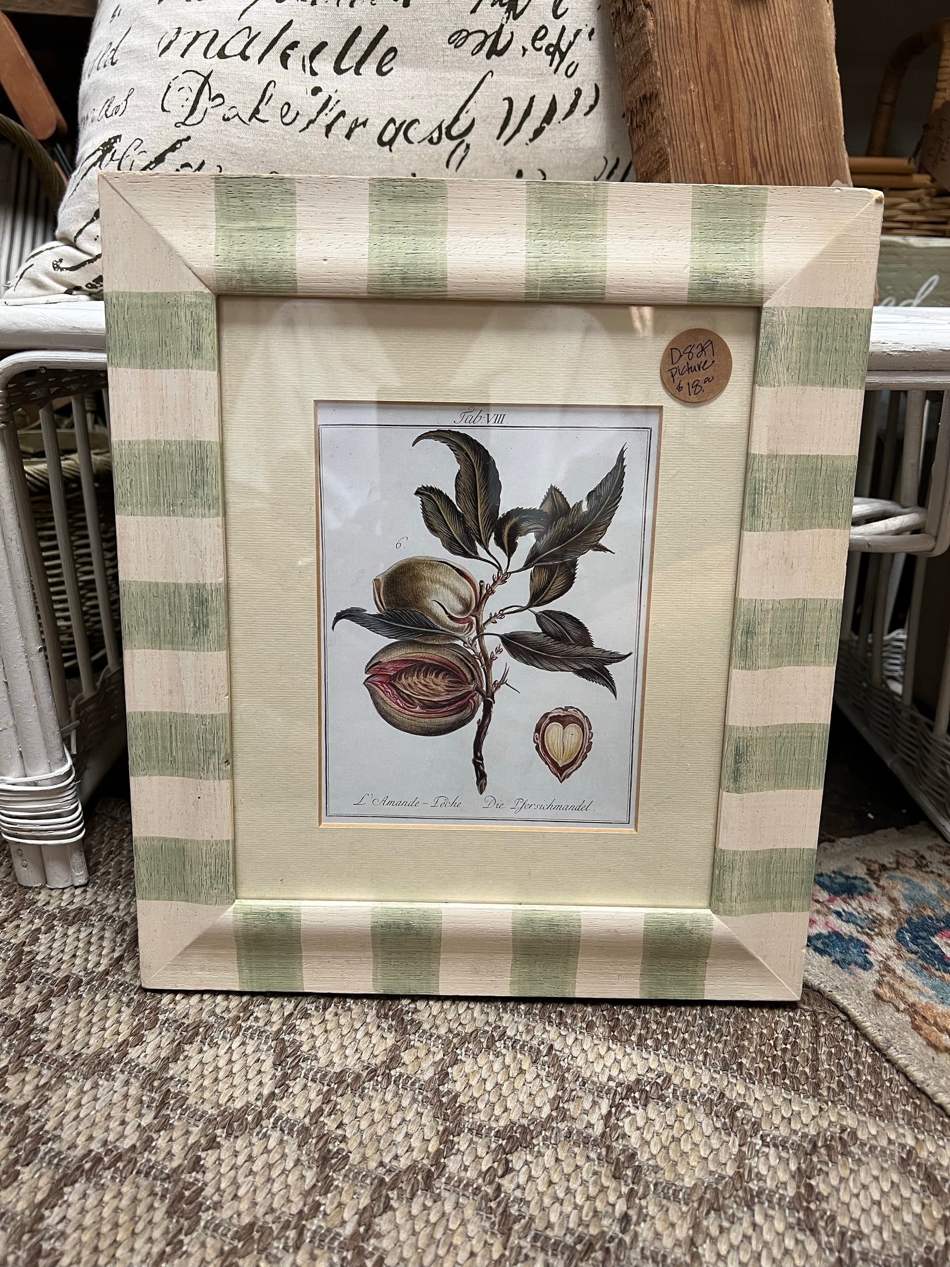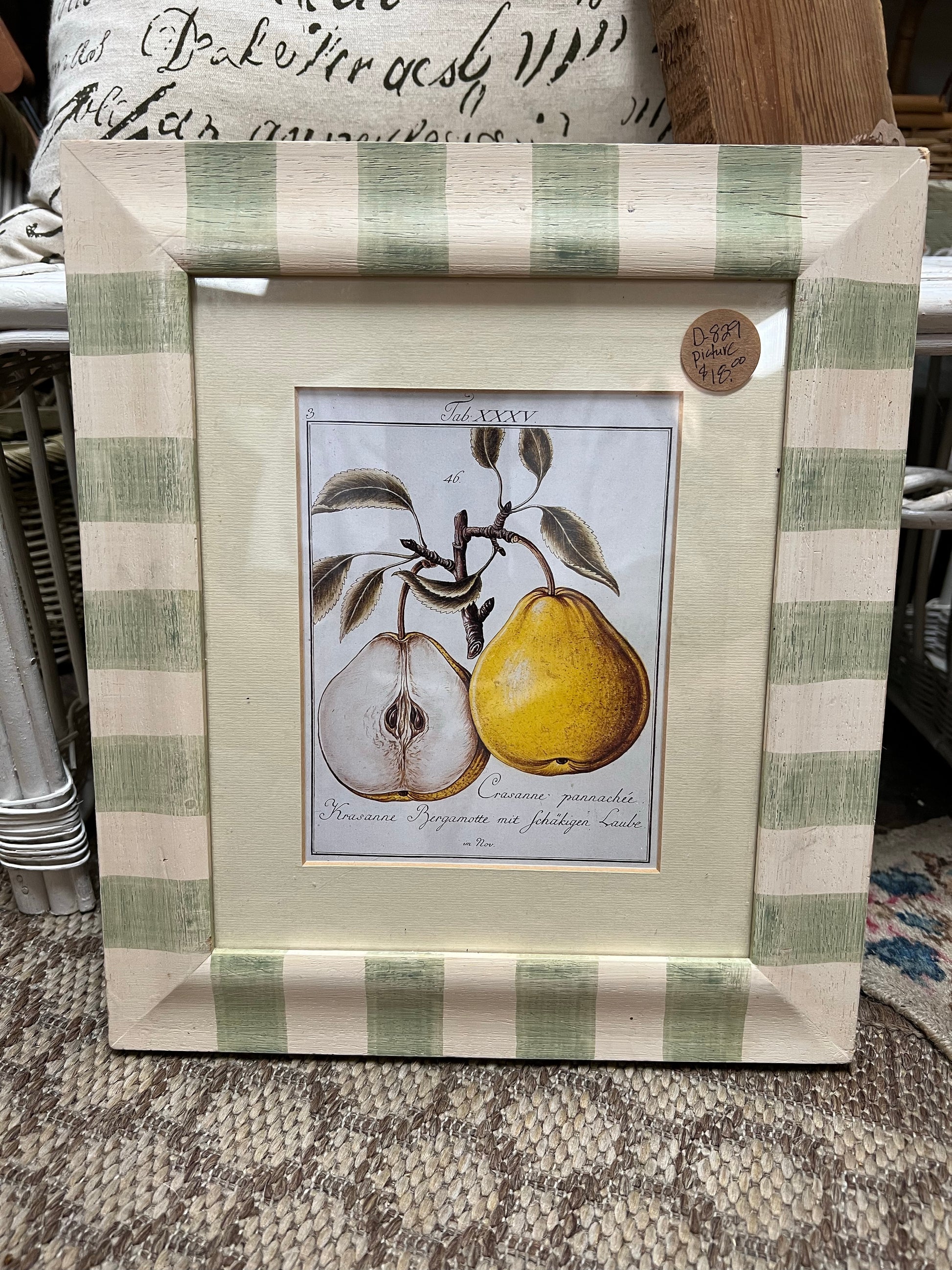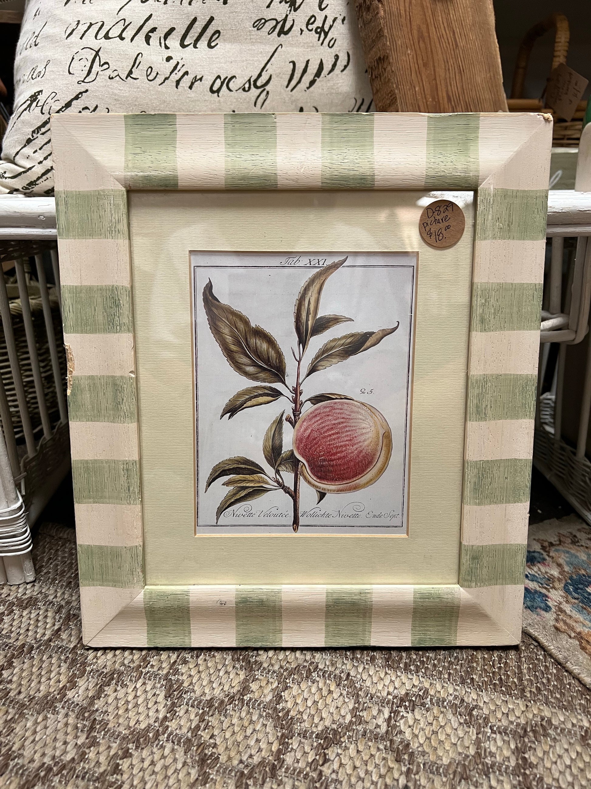 These fruit botanicals are absolutely gorgeous and the striped wooden frames are very unique. Four different prints. One frame has a small chip as seen in the first picture. Otherwise, they are in perfect condition!