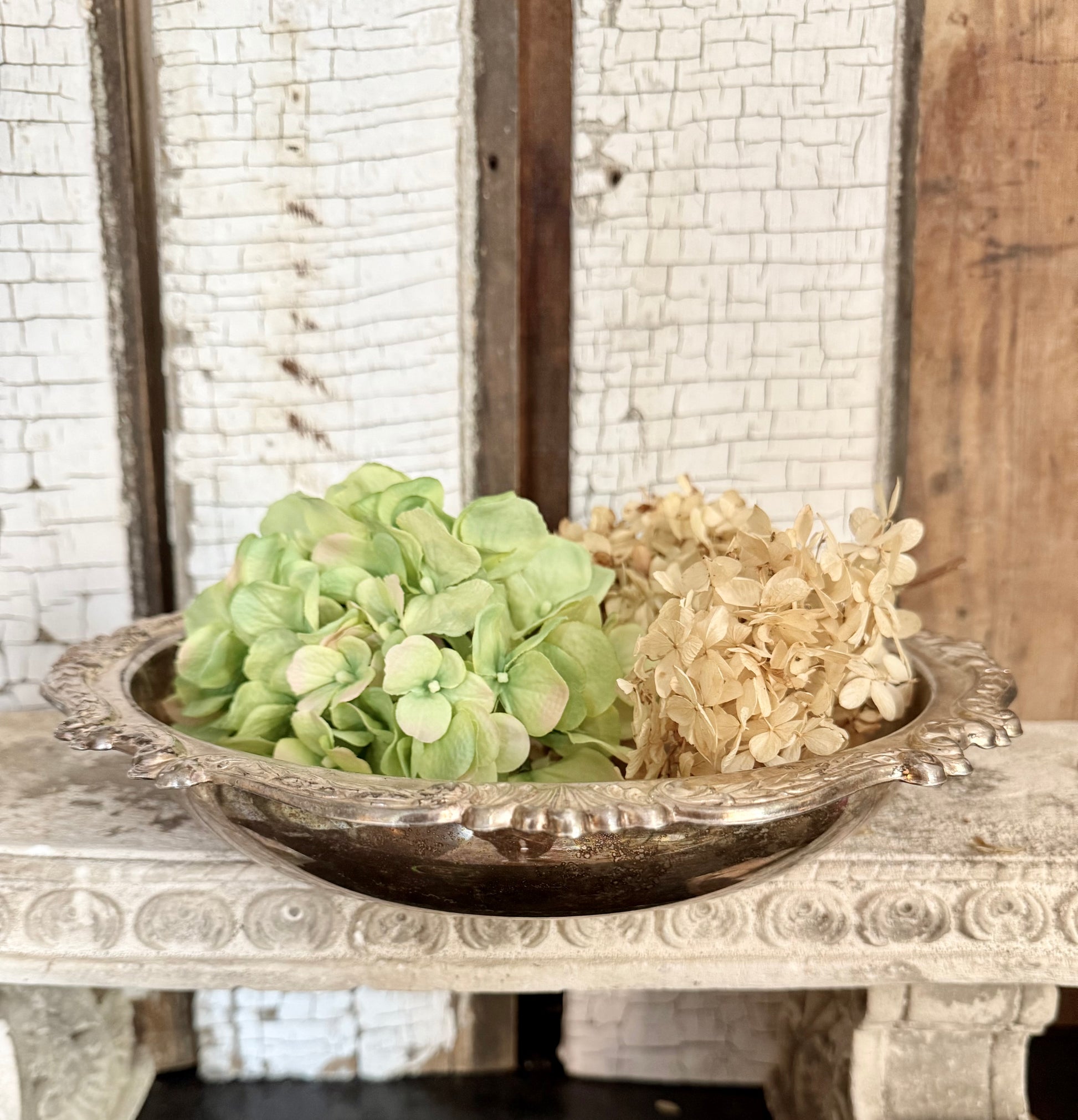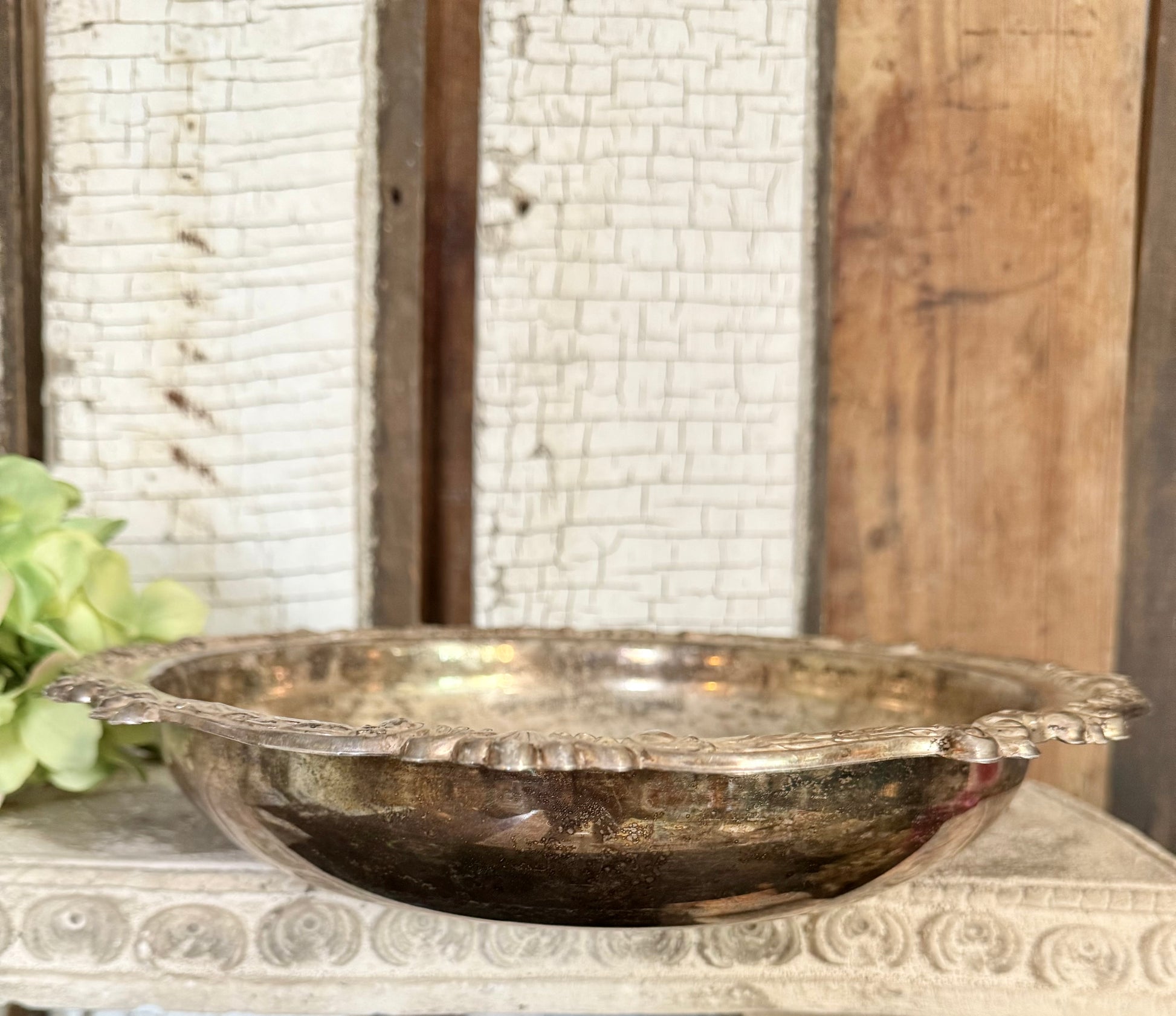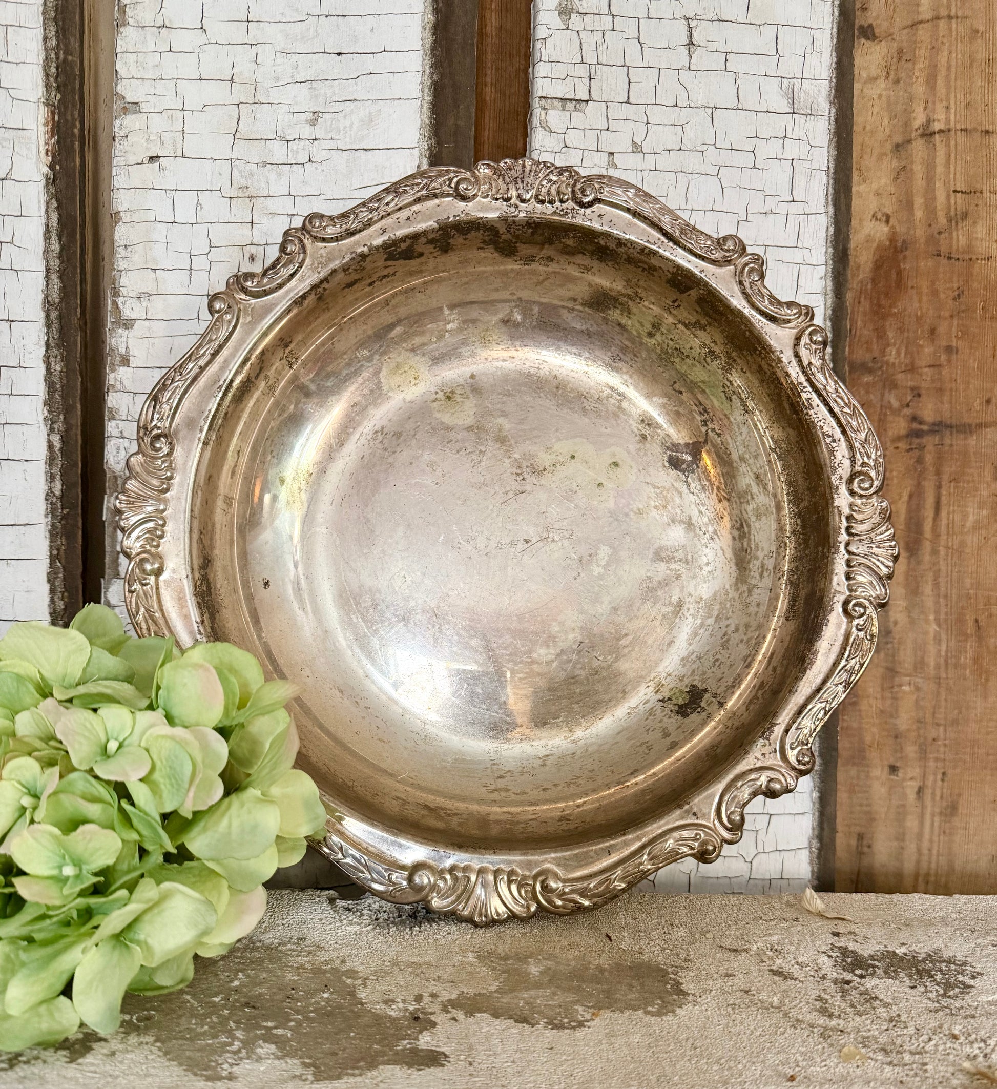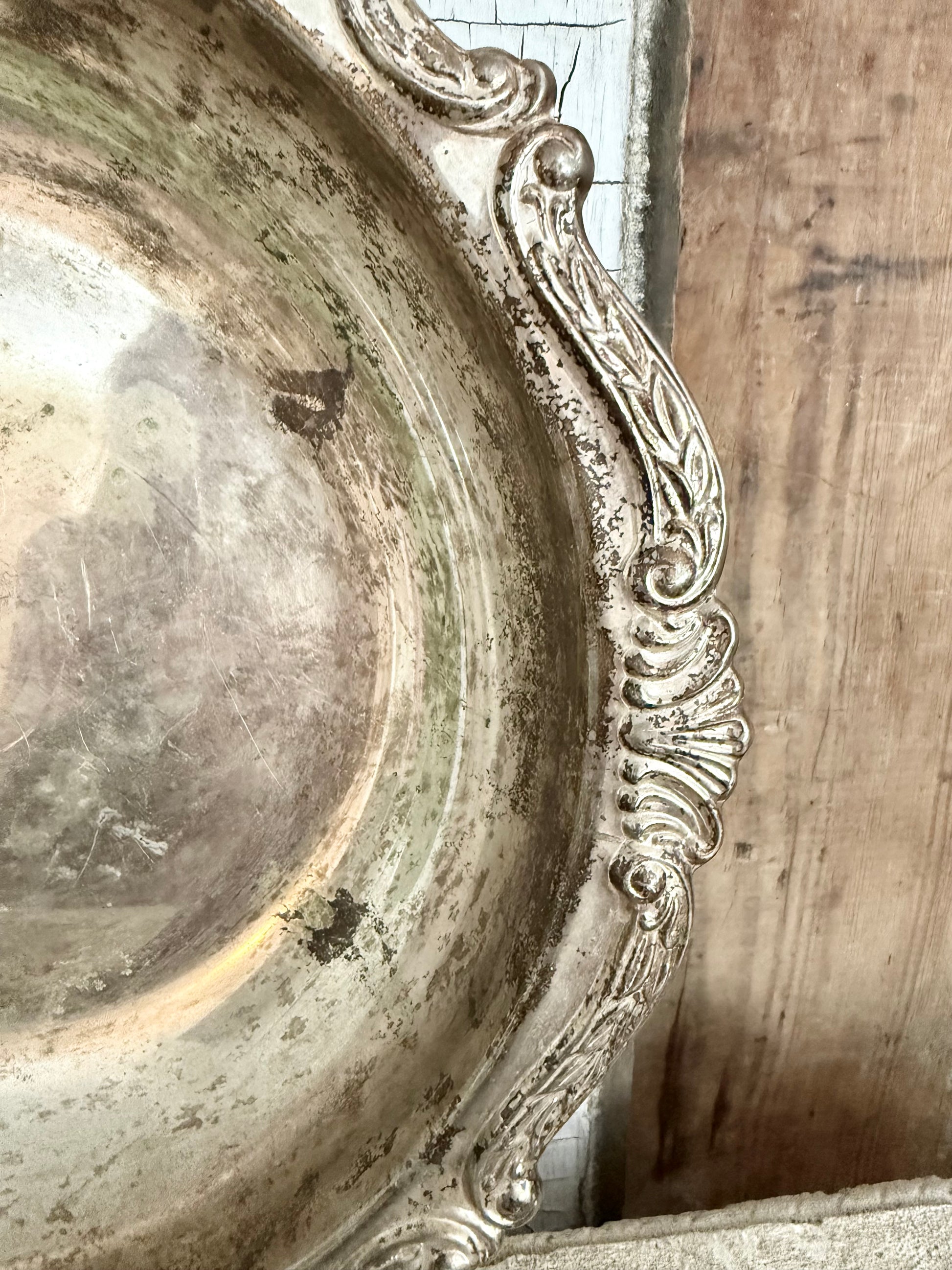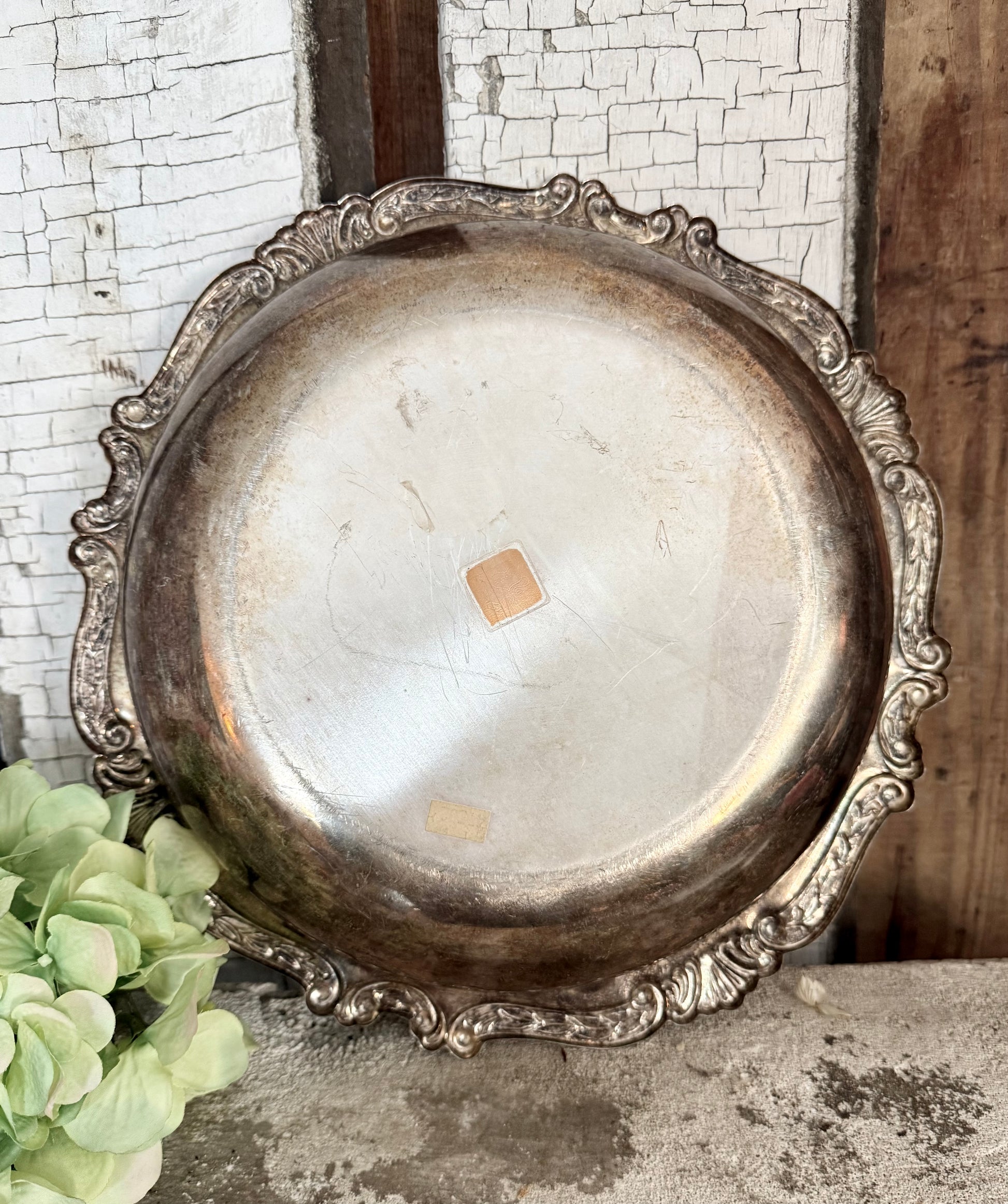 Round silver plate deep dish tray. Lots of patina. 12 1/2" diameter, 2 1/4" deep. Beautiful ornate detail! The sticker has been removed so the maker is unknown.