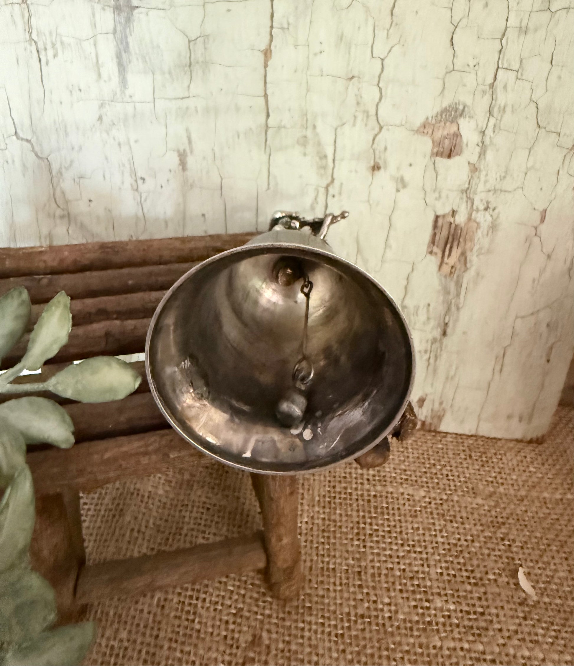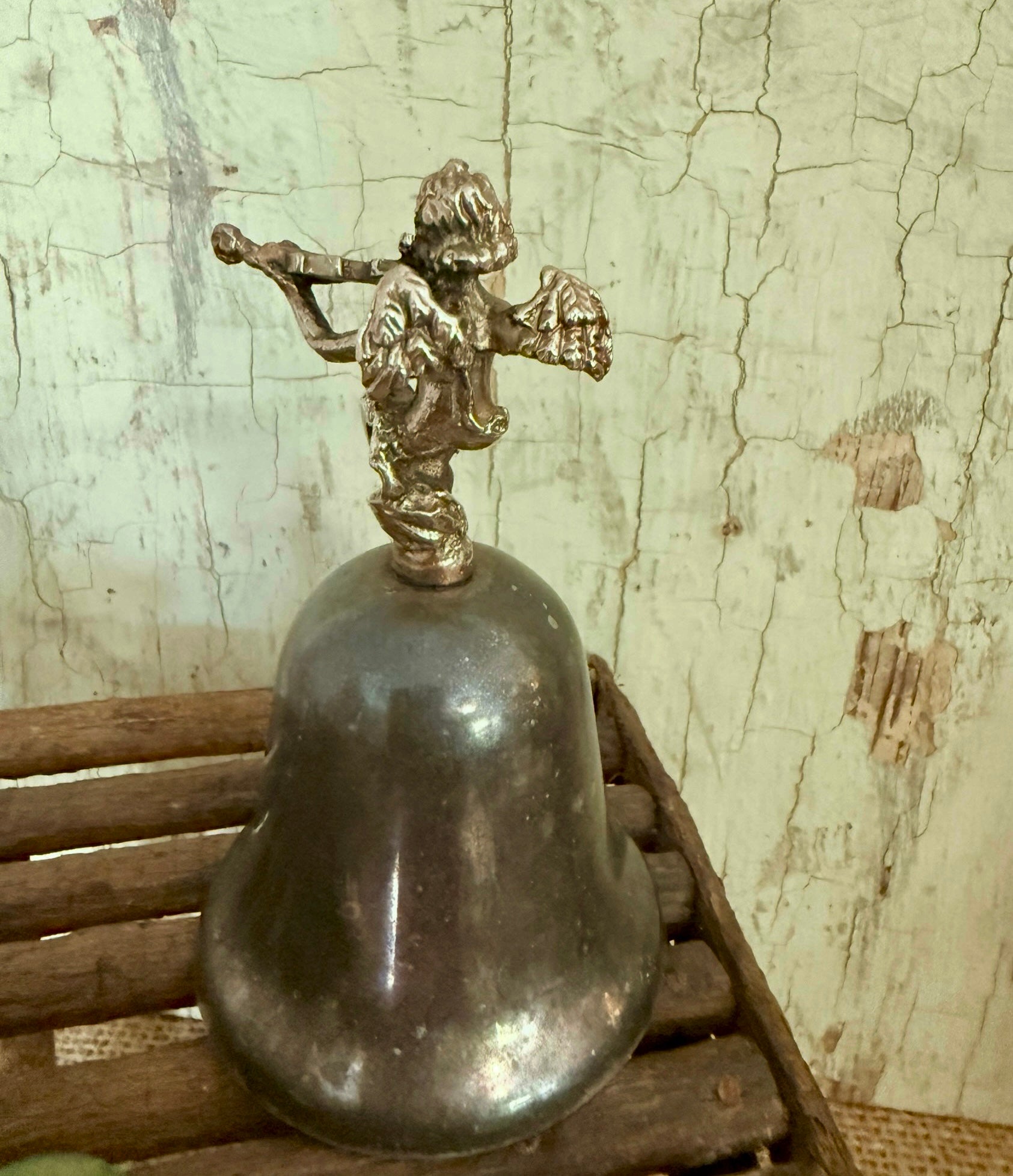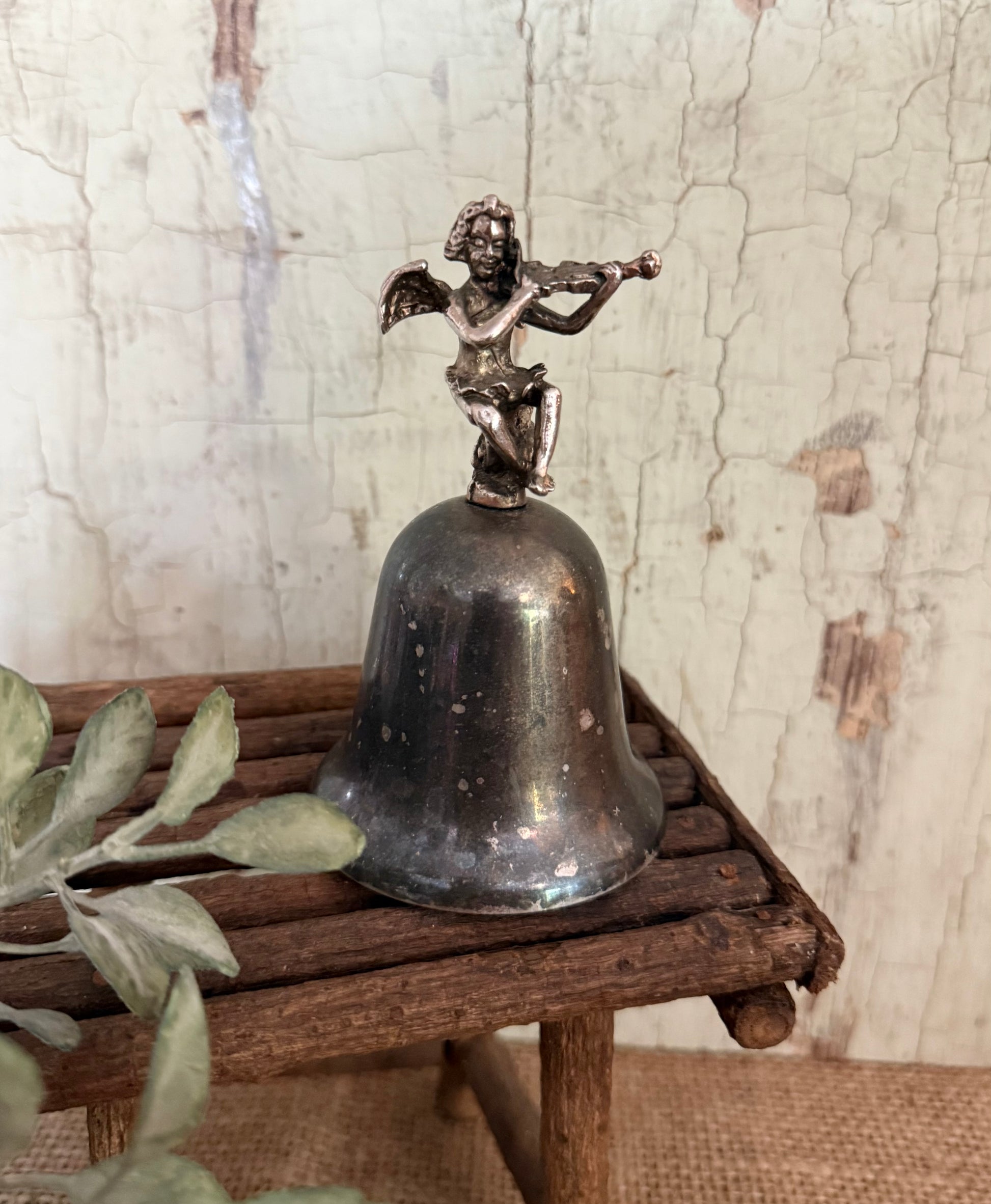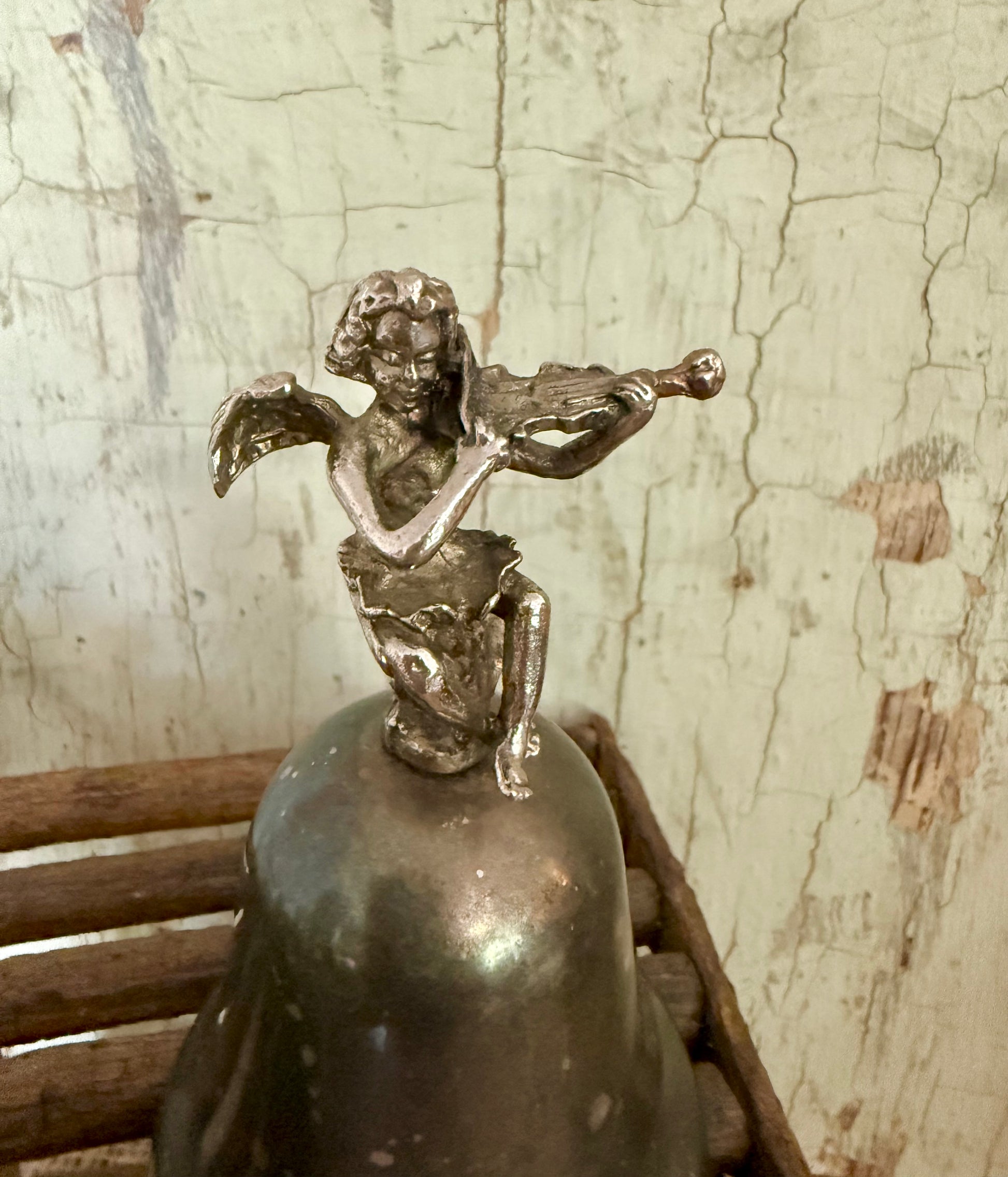 Silver plate cherub bell playing a violin. The clapper is in tact. 4 1/2" tall, 2 1/2" in diameter. Lots of patina.