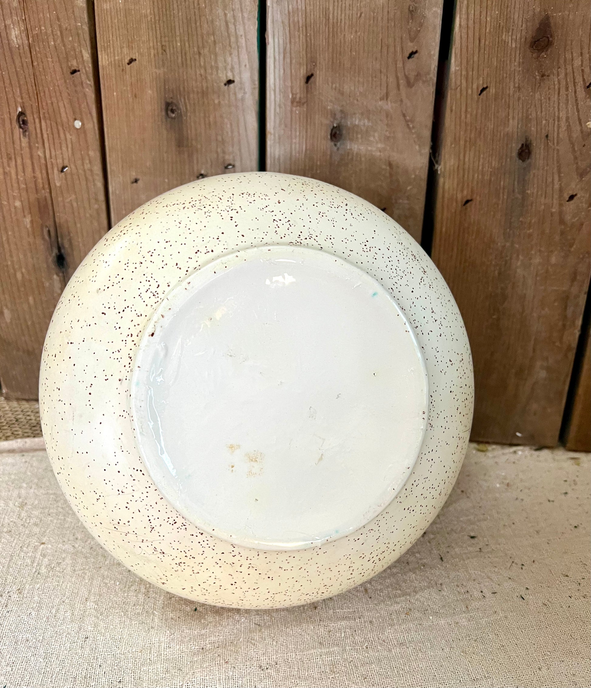 Cream with brown specks, squatty shape and chunky. 6" tall, 9" wide.