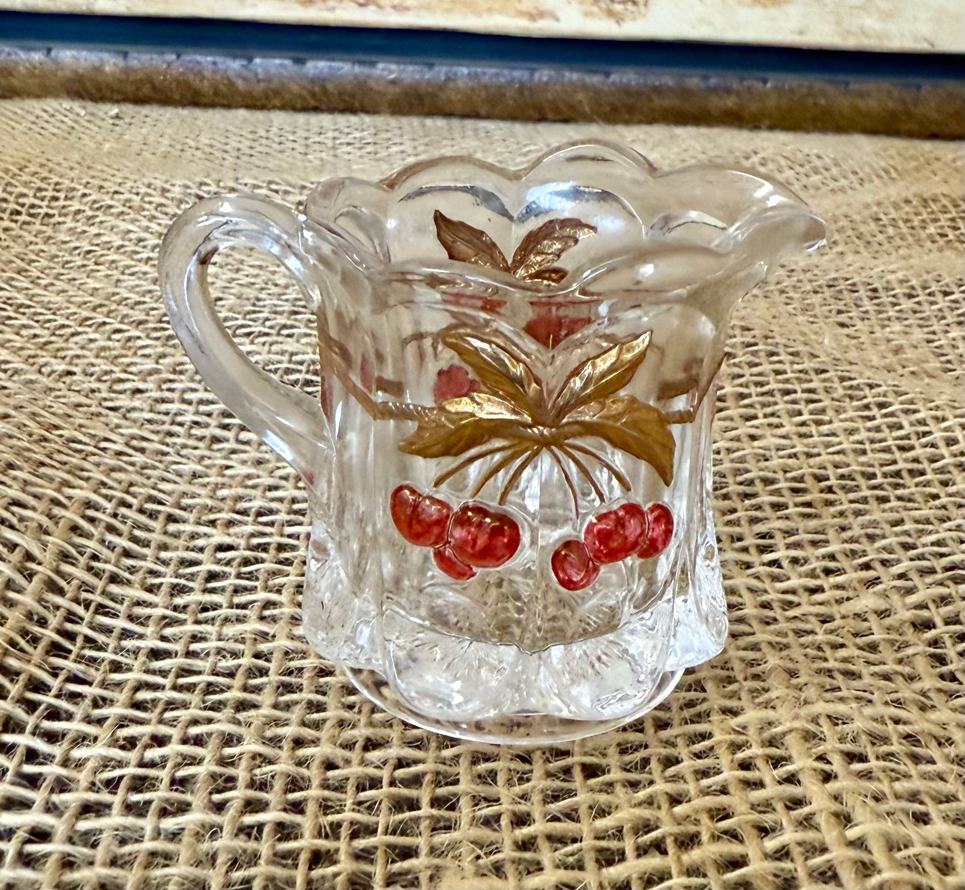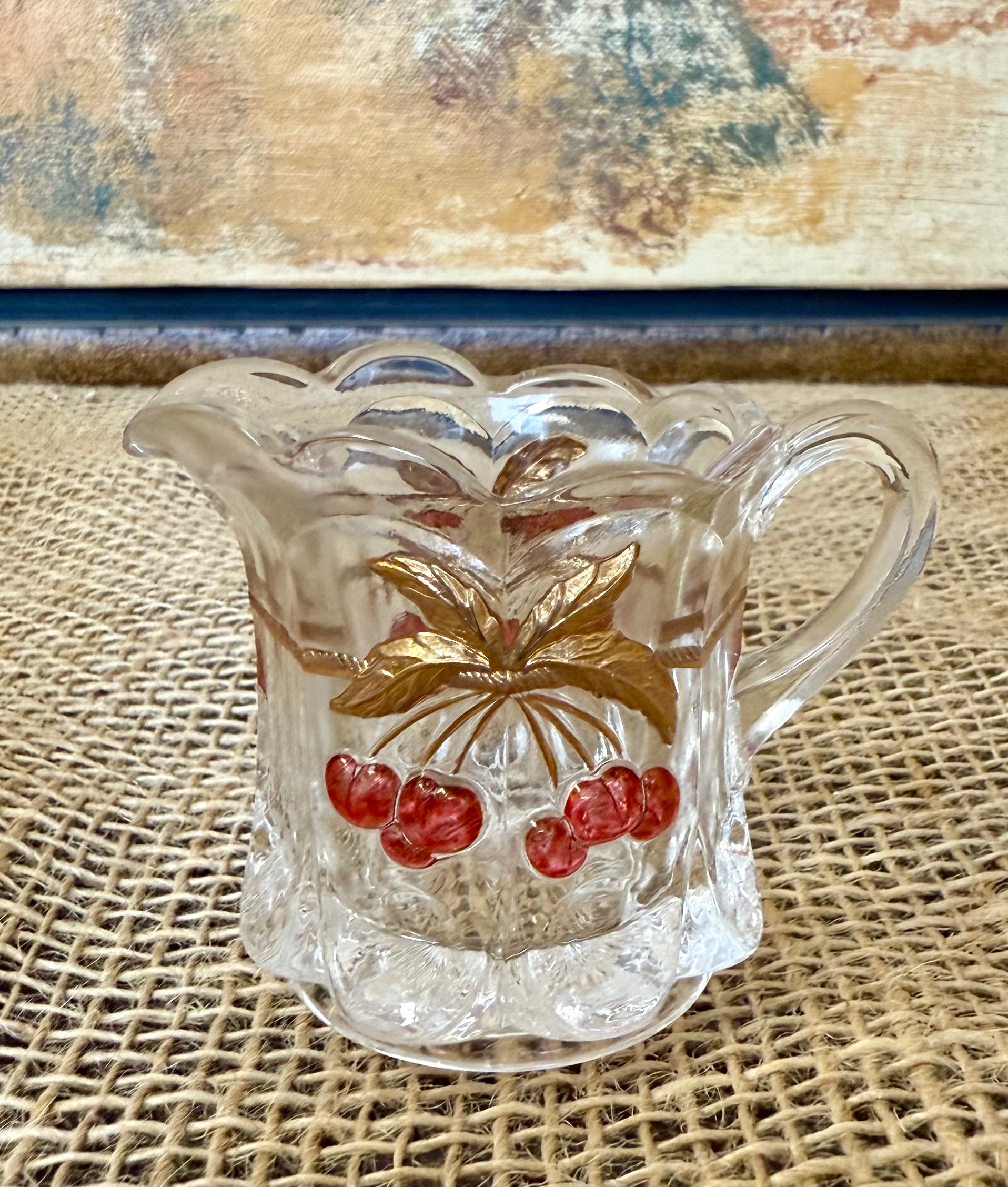 Vintage Mosser glass "Cherry & Cable" creamer. 4" tall and 4" handle to spout. Features a raised cherry design with gold accents and thumbprints around the base.