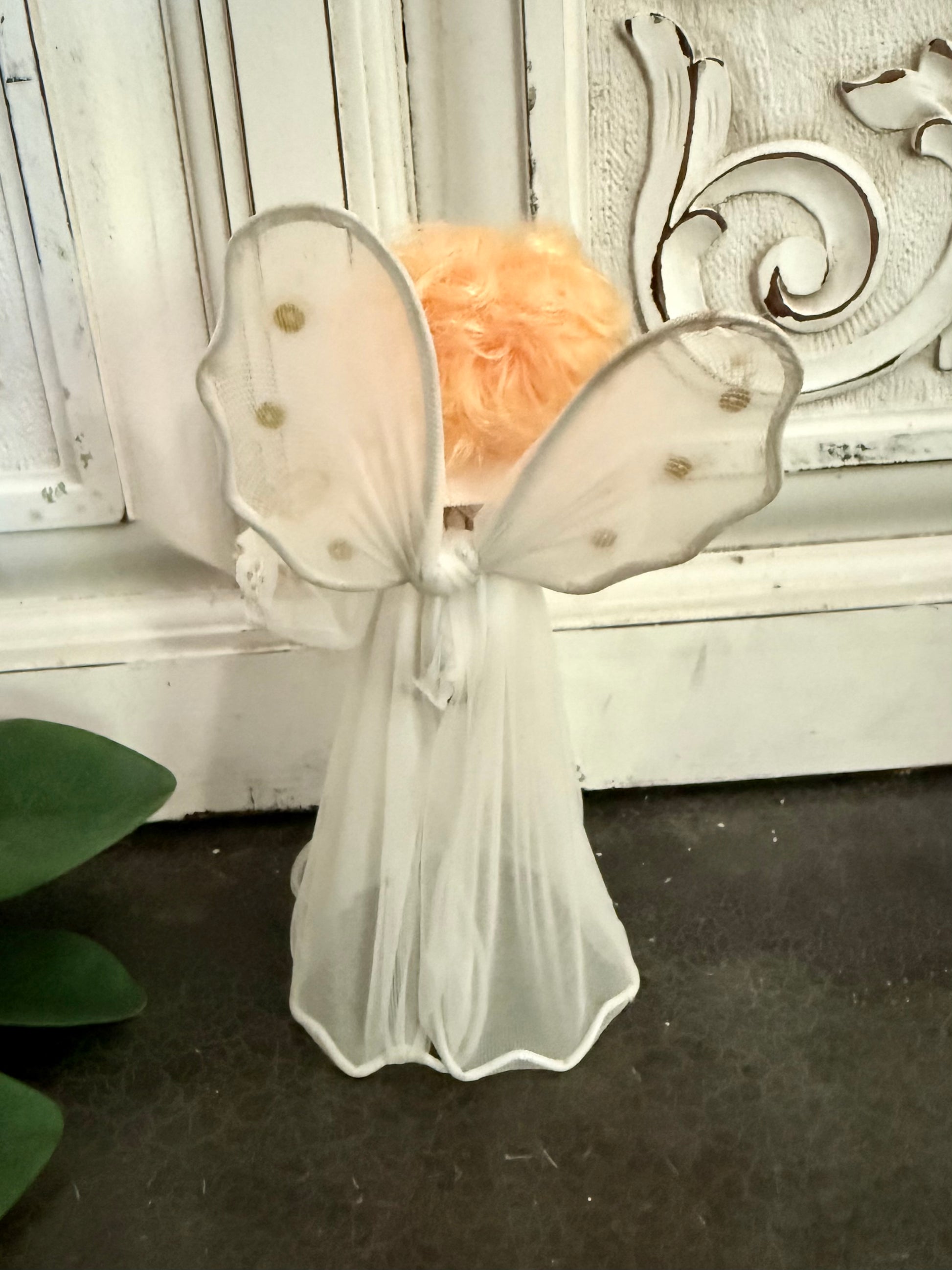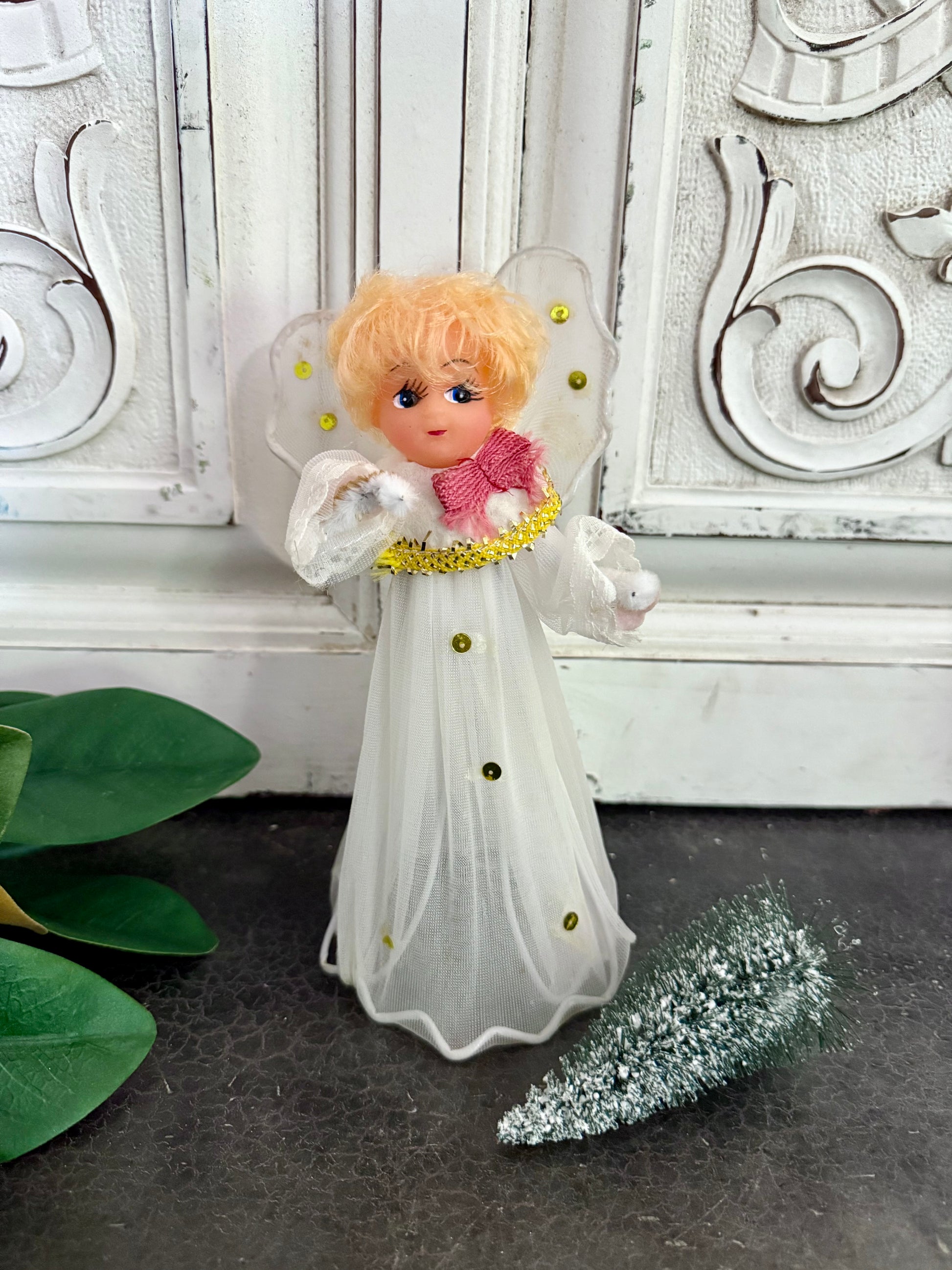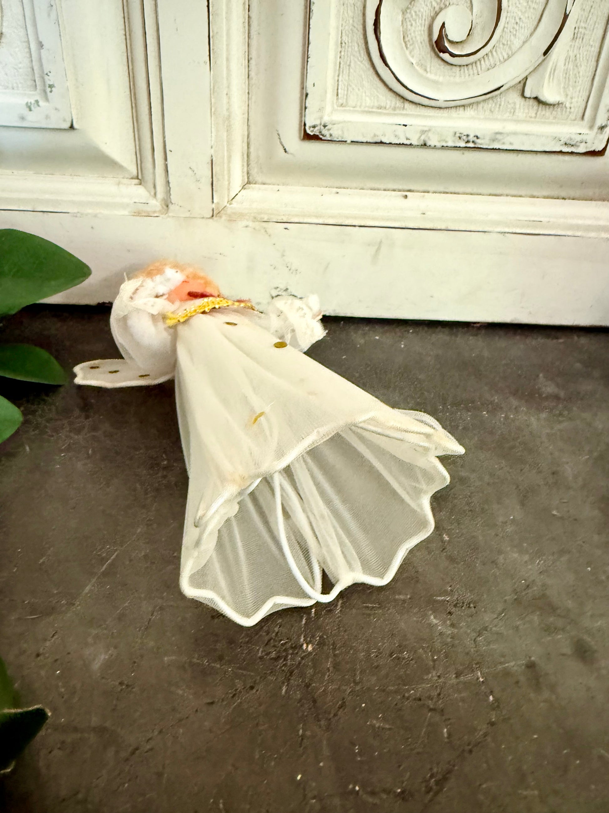 Vintage Angel tree topper with rubber face, white dress and gold sequins. 8" tall, 4" wide.