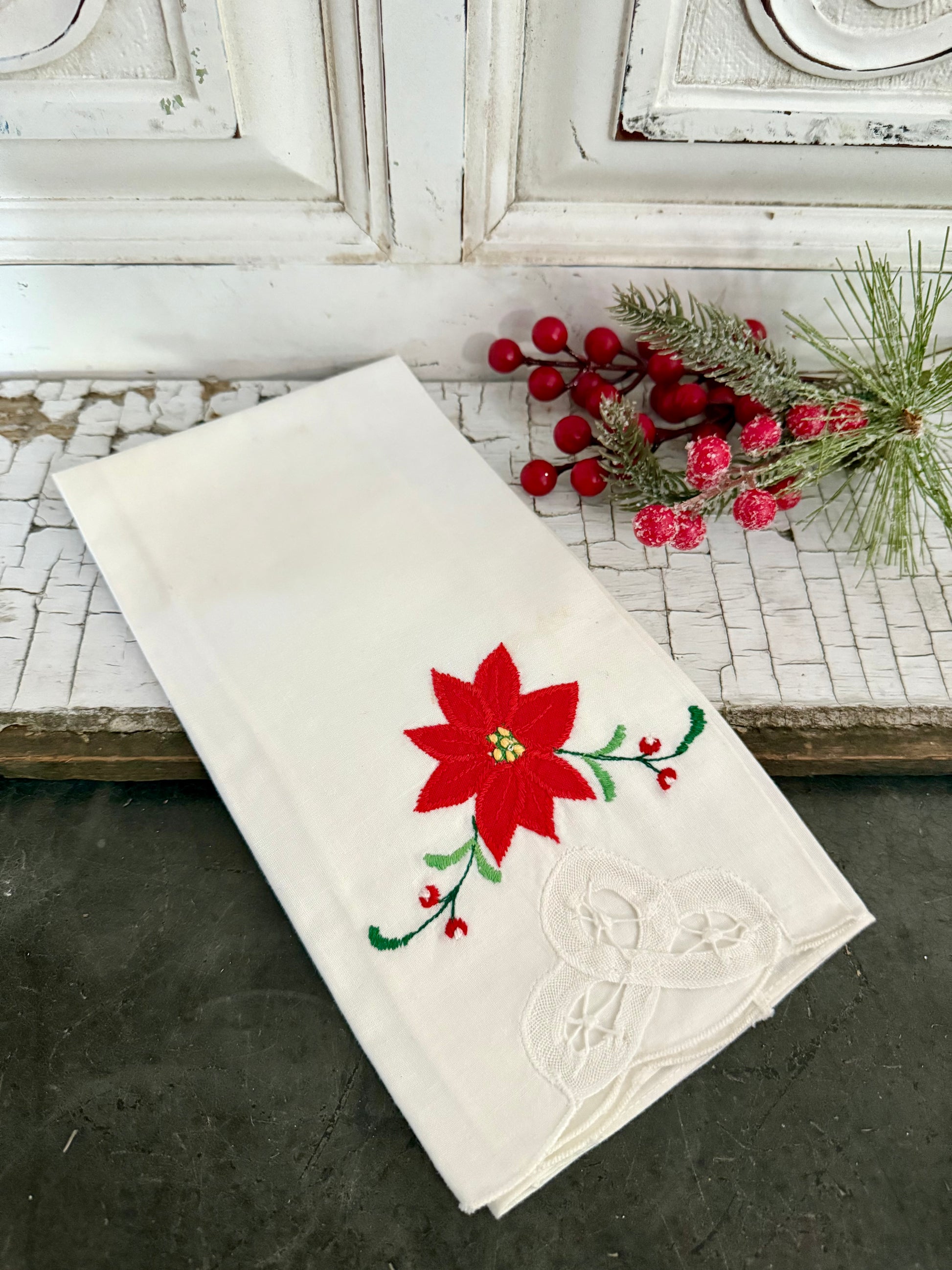 Vintage Poinsettia Embroidered Hand Towel