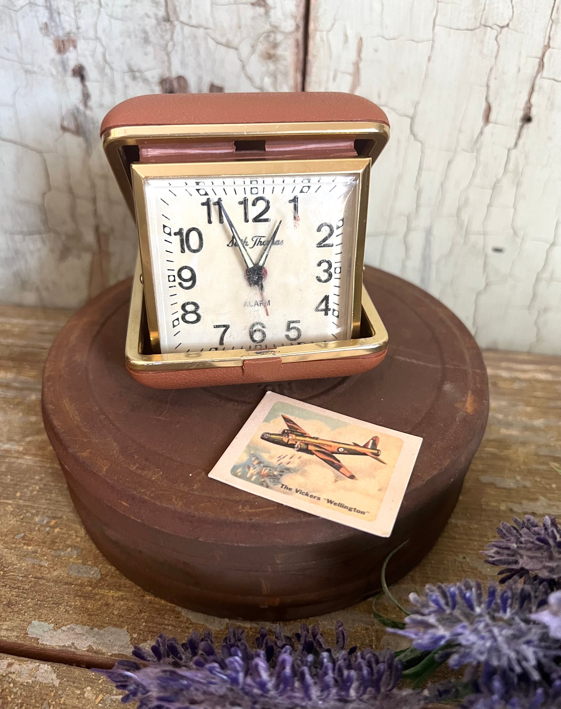 Vintage travel clock. Not in working order. 2 3/4" square, 3" tall when open.